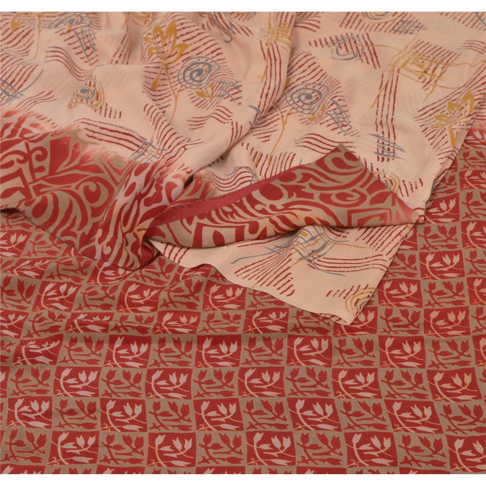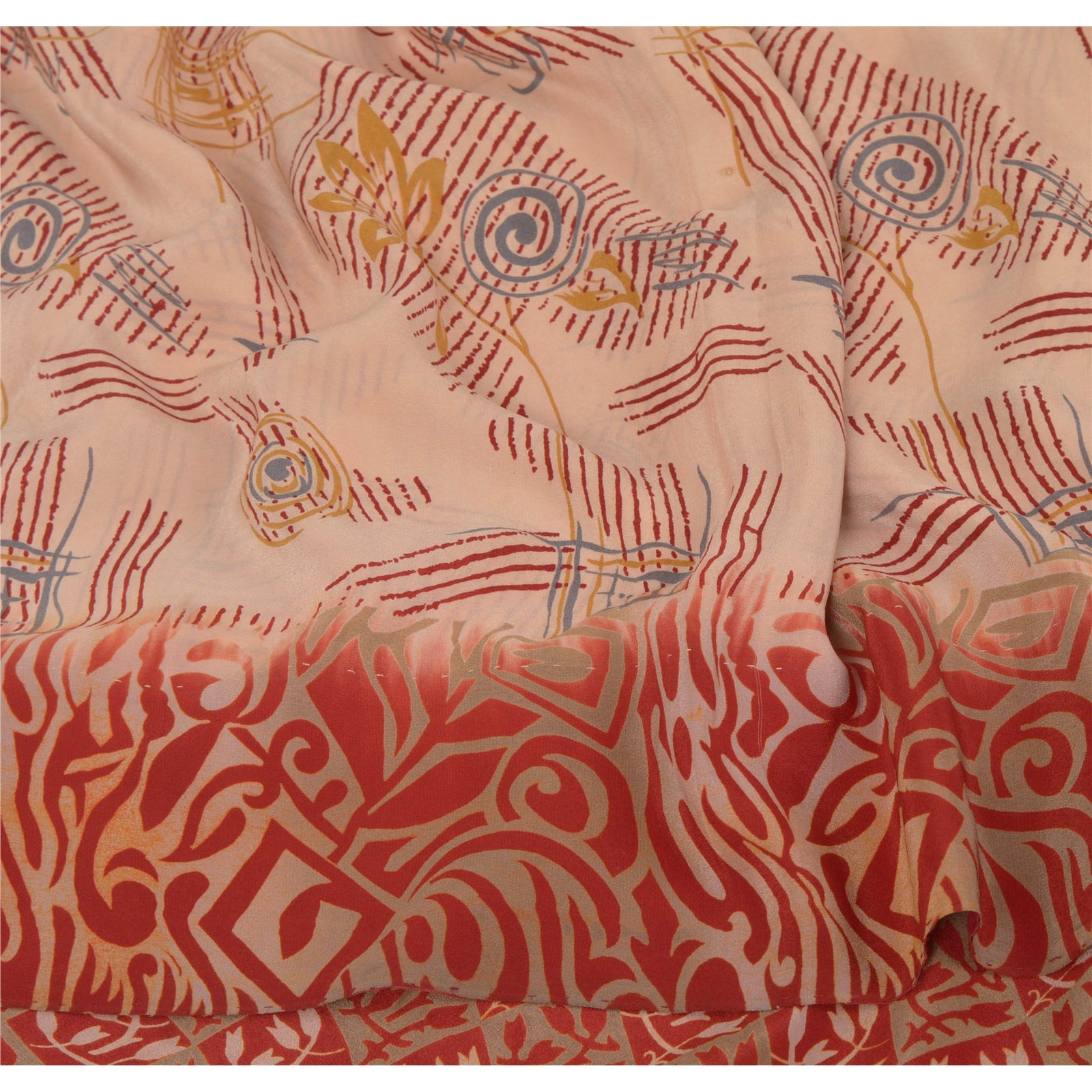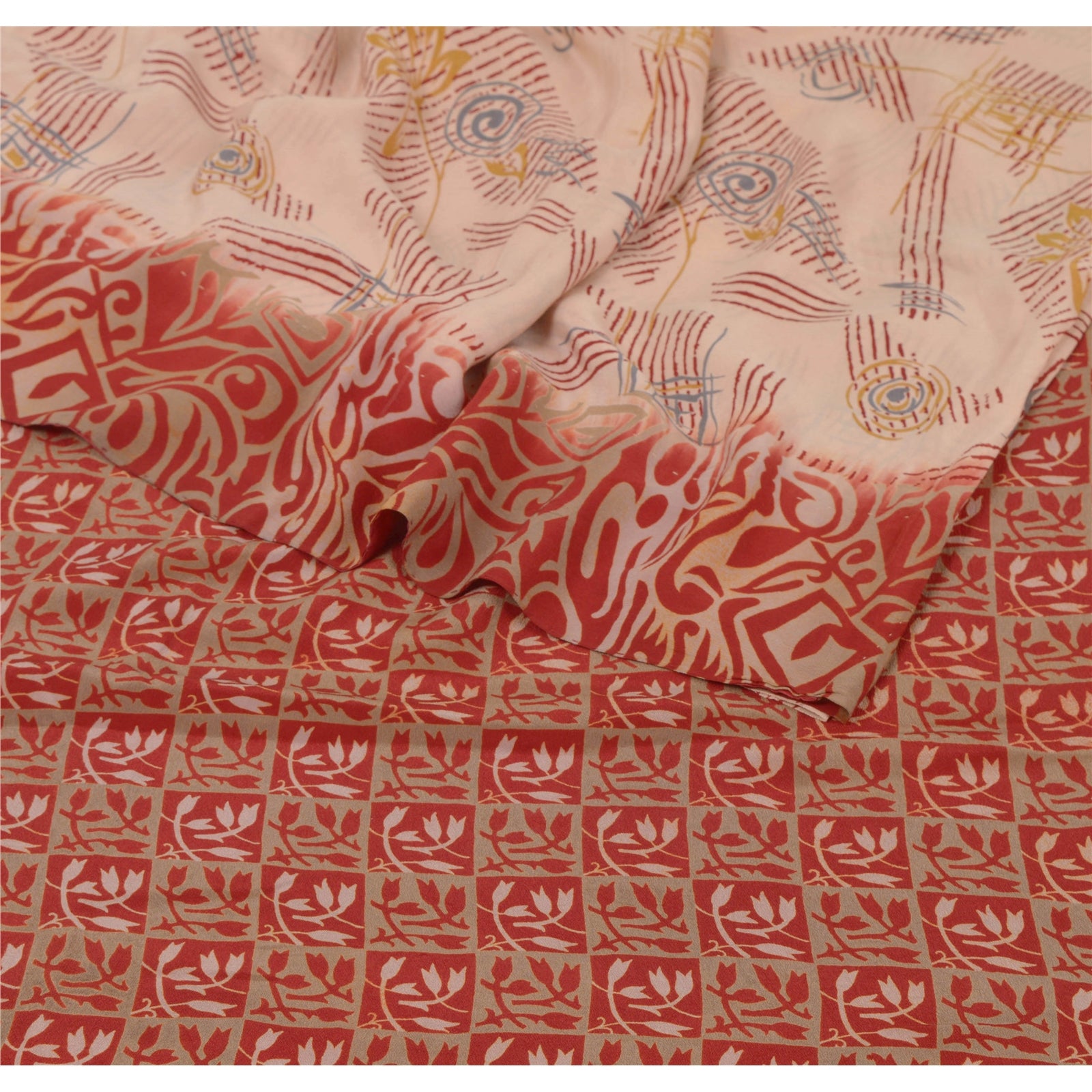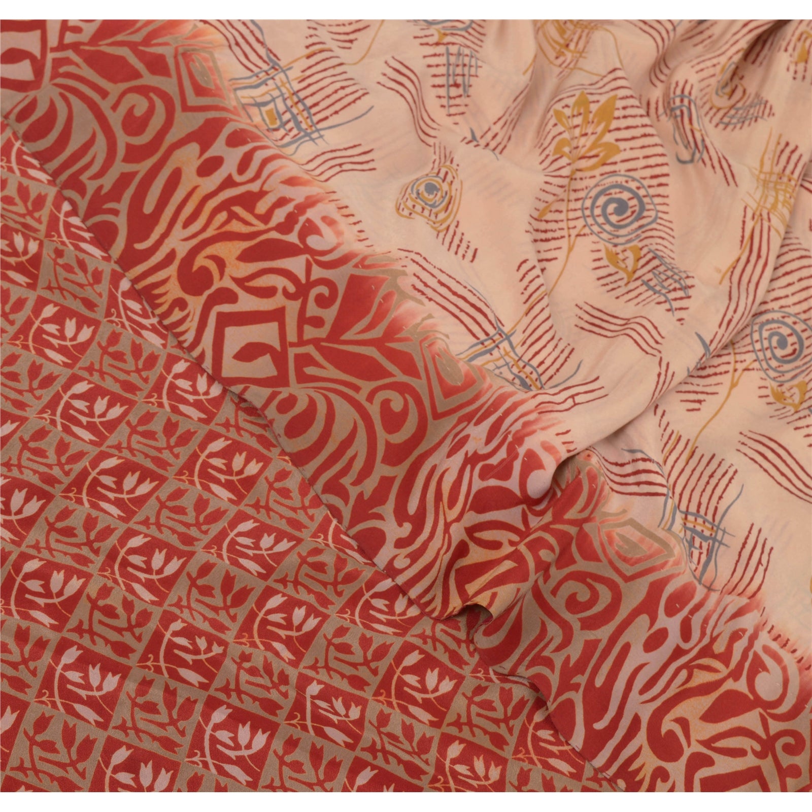 • Beautiful shade of peach & red colored printed pure crepe silk saree . • Pallu has printed floral & abstract design . • Floral design in center part of sari . This unique vintage saree can be used for various crafting ideas even if you don't want to use it as a sari. Design a dress, use it as a throw, as window dressing, beachwear, sarongs, table linen and much more. Let your creative juices flow and use this decorated Sustainable Fabric in multiple fashion.