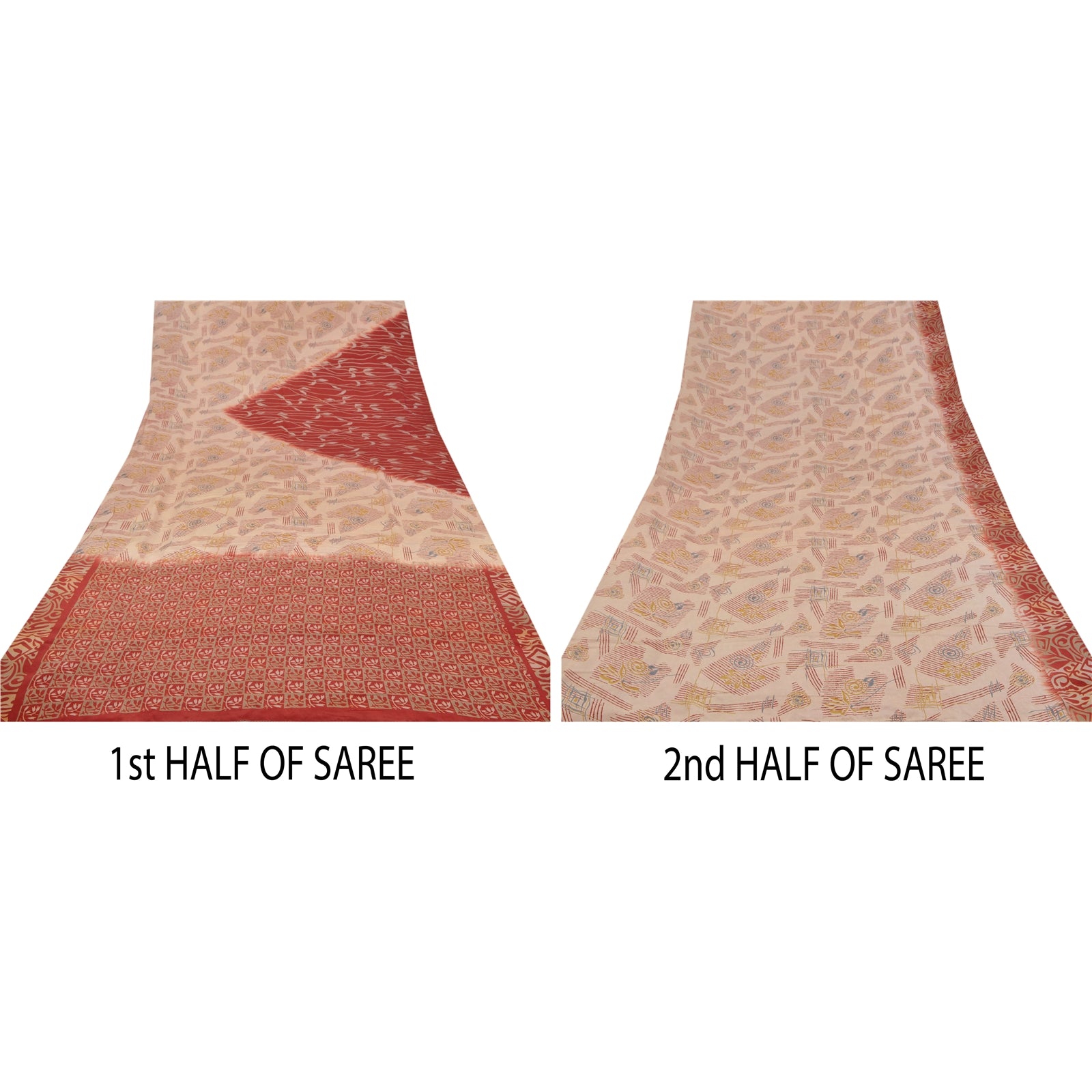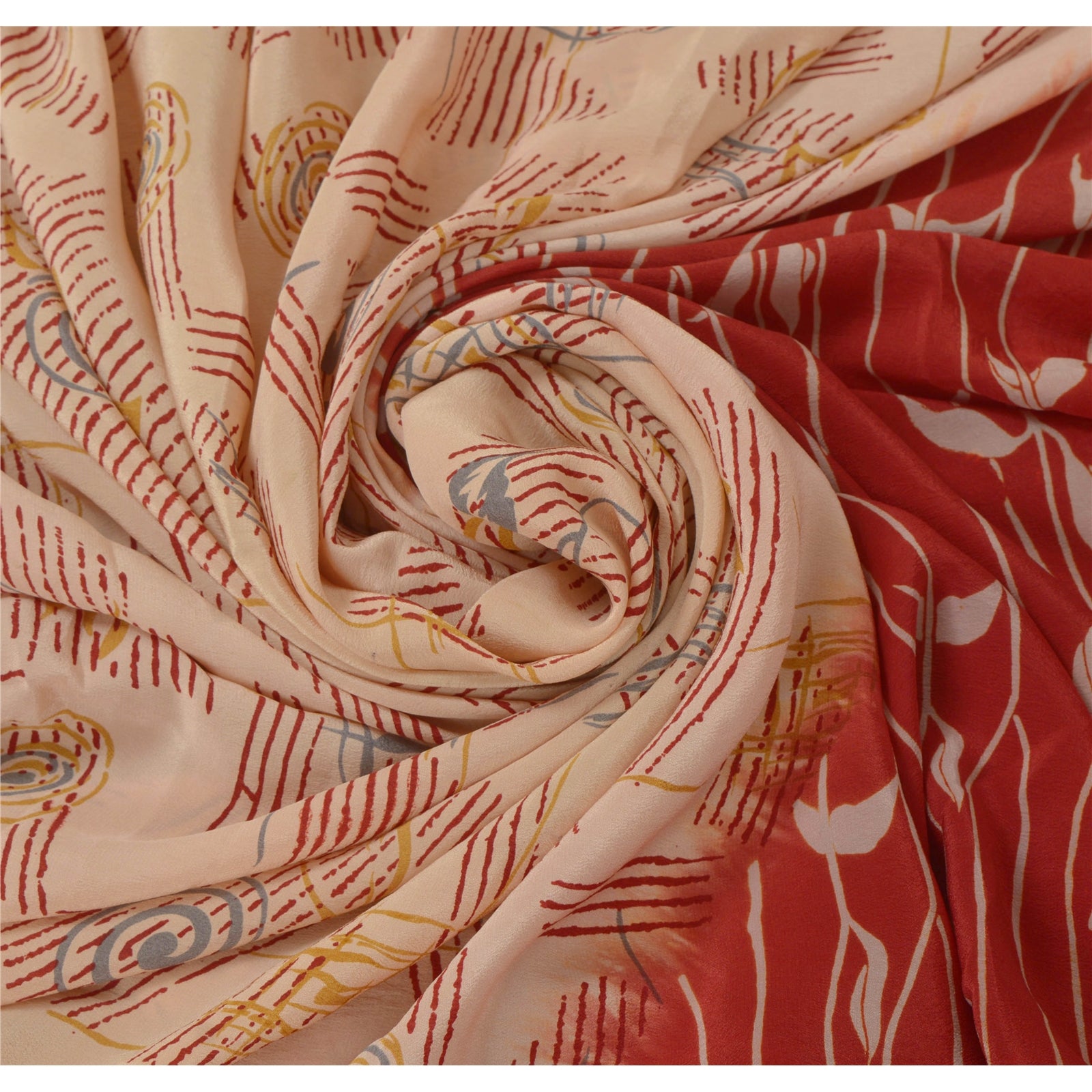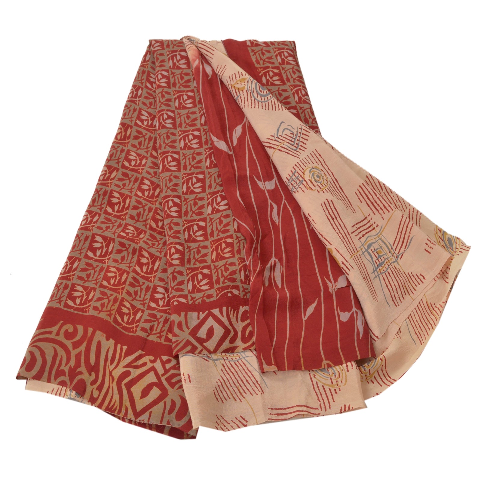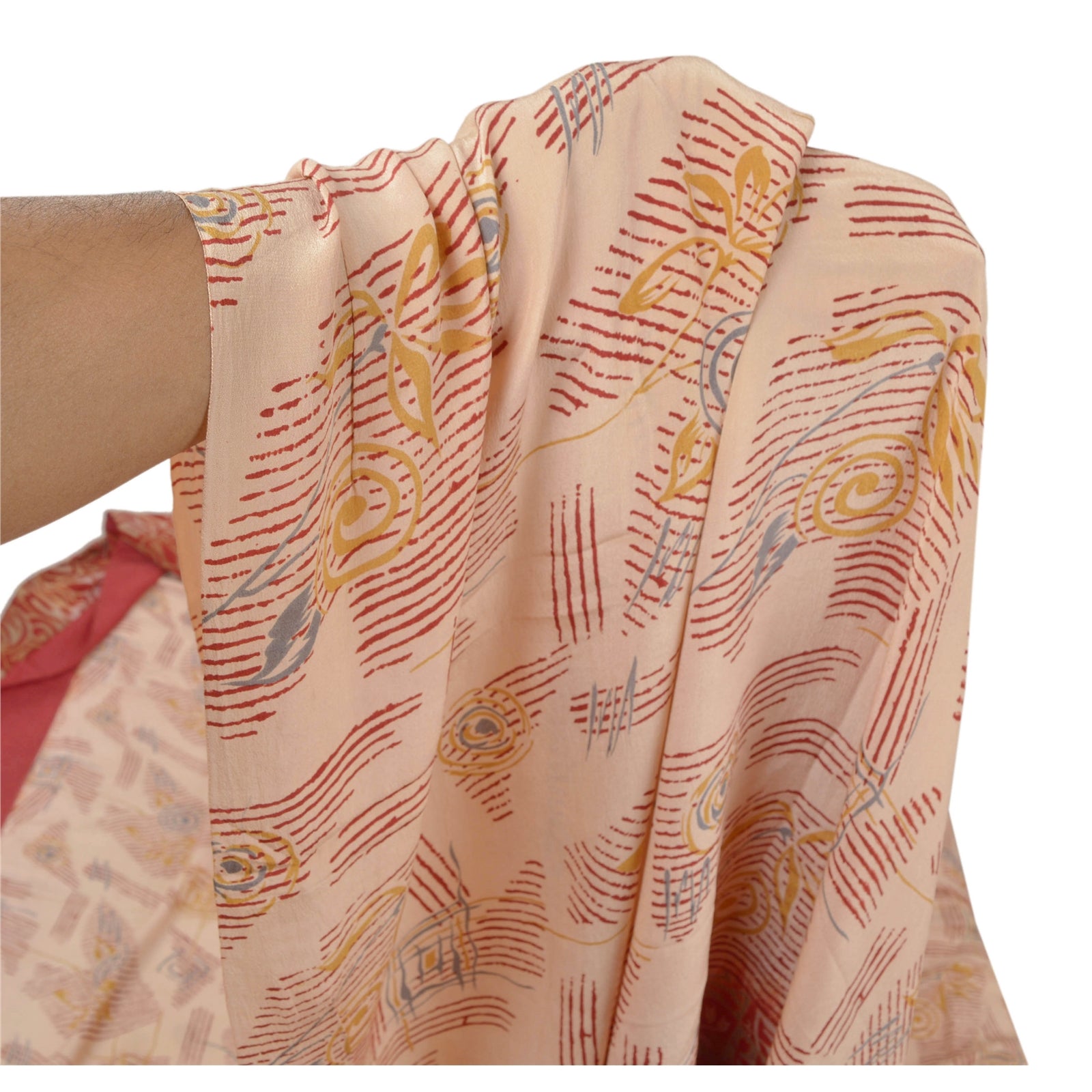 • Beautiful shade of peach & red colored printed pure crepe silk saree . • Pallu has printed floral & abstract design . • Floral design in center part of sari . This unique vintage saree can be used for various crafting ideas even if you don't want to use it as a sari. Design a dress, use it as a throw, as window dressing, beachwear, sarongs, table linen and much more. Let your creative juices flow and use this decorated Sustainable Fabric in multiple fashion.