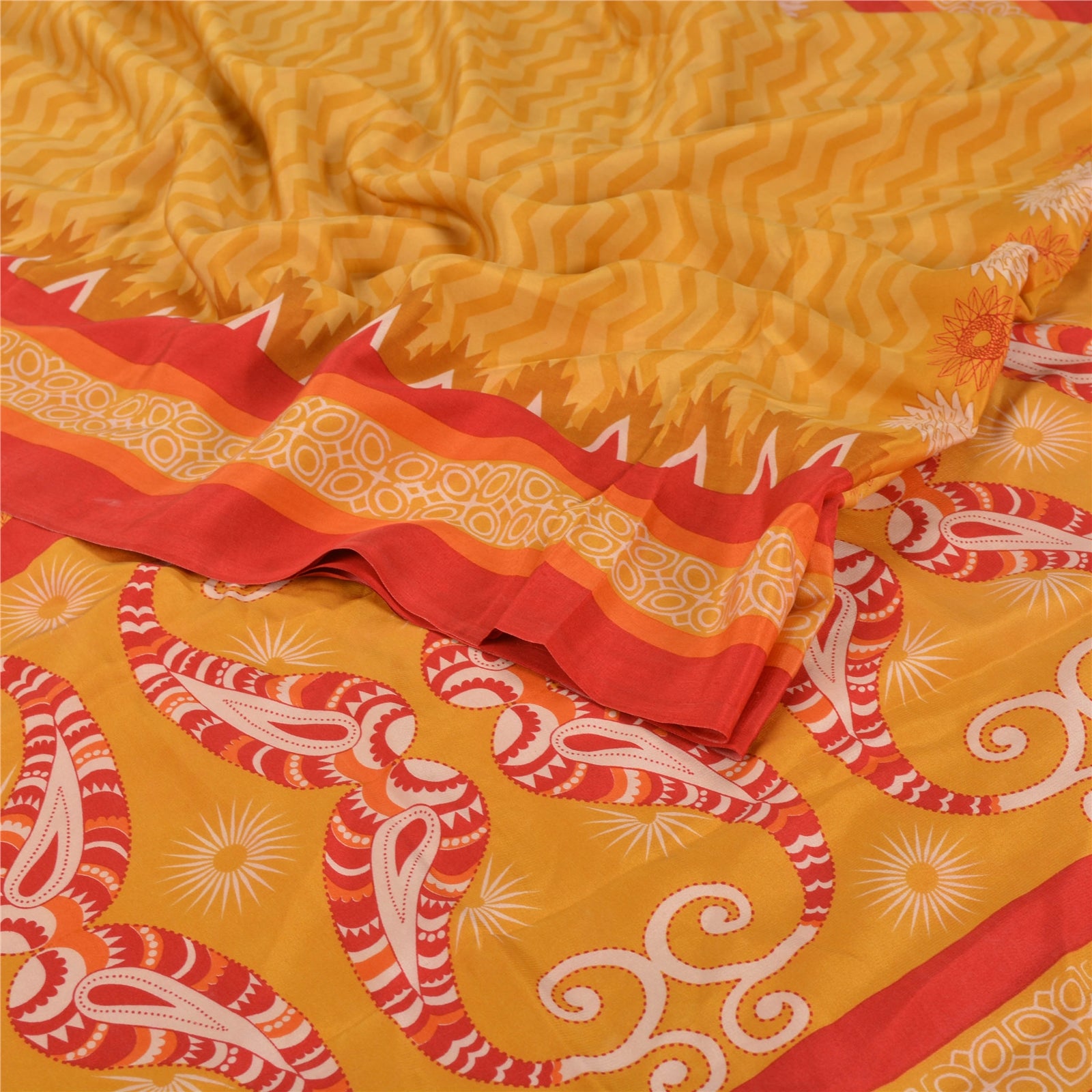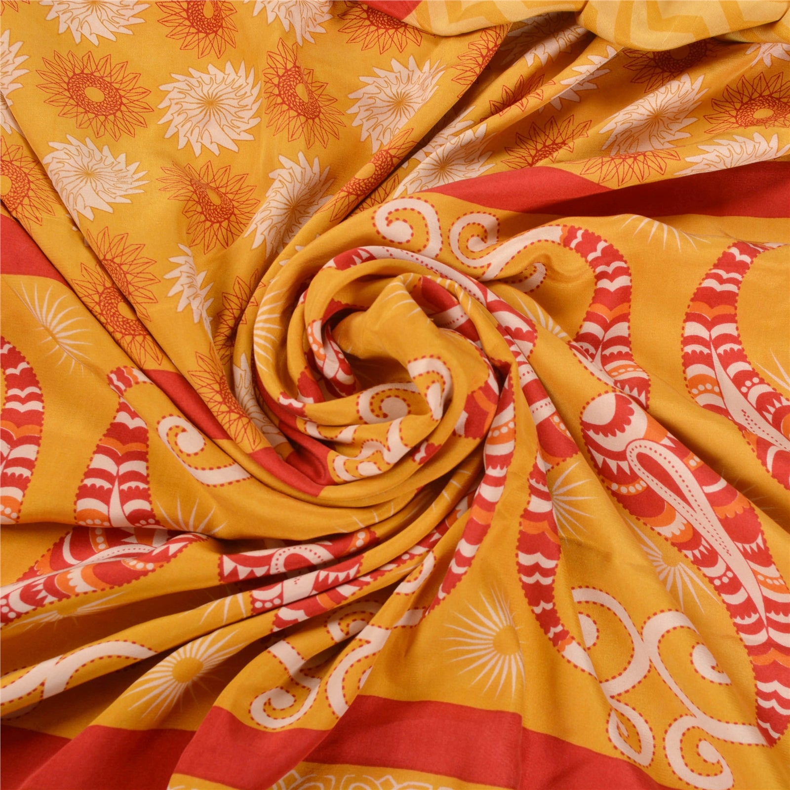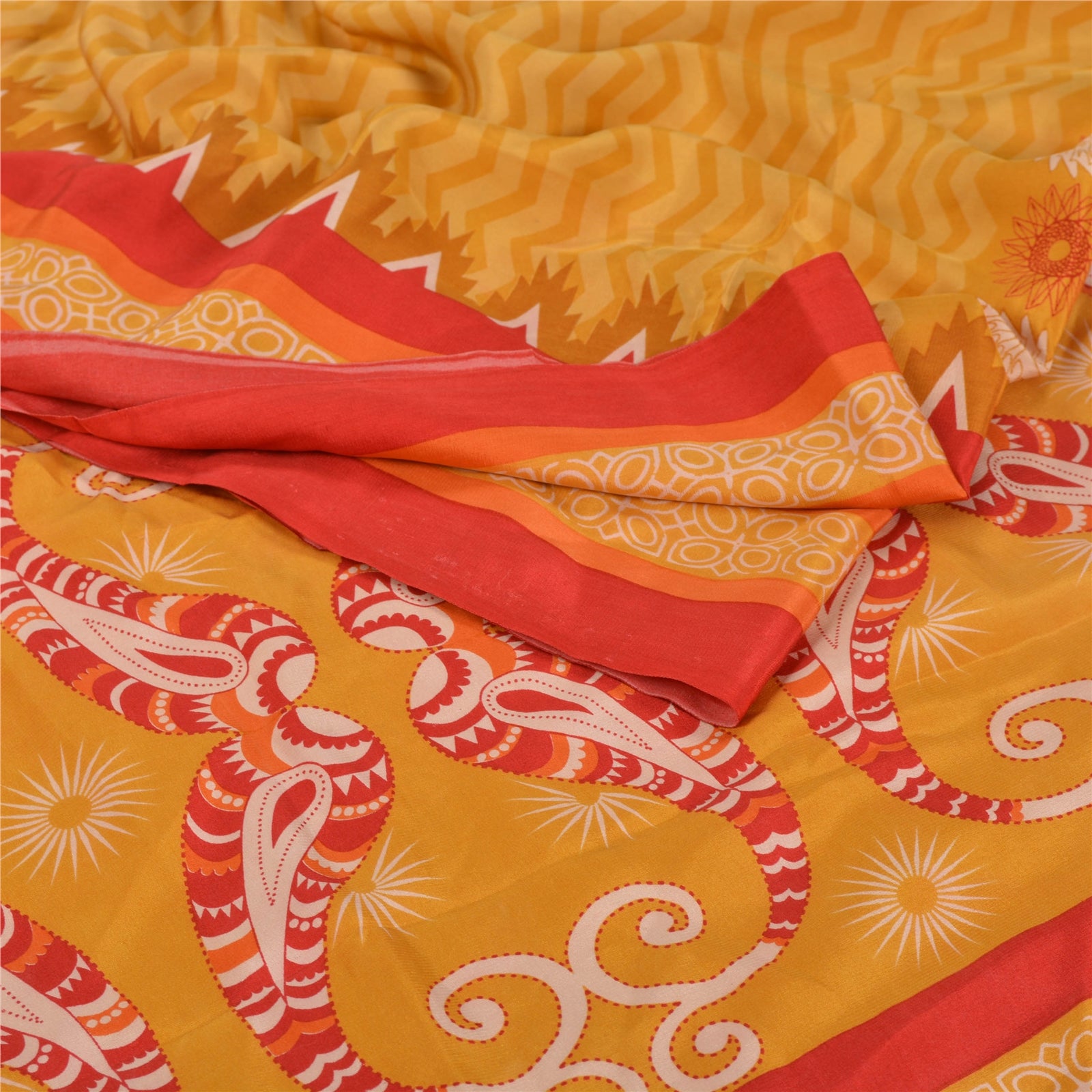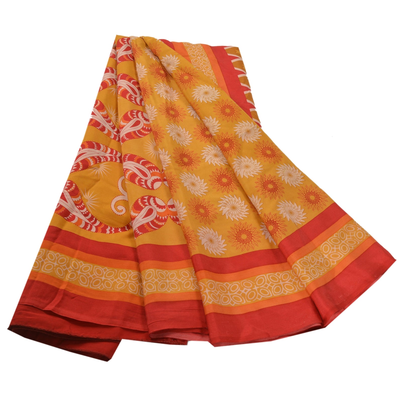 Beautiful Yellow & Red Colored 100% Pure Crepe Silk Printed Work Sari. Pallu & Border has printed floral & paisley design. Printed floral & geometric design in center part of saree. This unique vintage saree can be used for various crafting ideas even if you don't want to use it as a sari. Design a dress, use it as a as window dressing, upholstery, sarongs, throw, dress making and table linen much more. Let your creative juices flow and use this decorated Sustainable Fabric in multiple fashion.