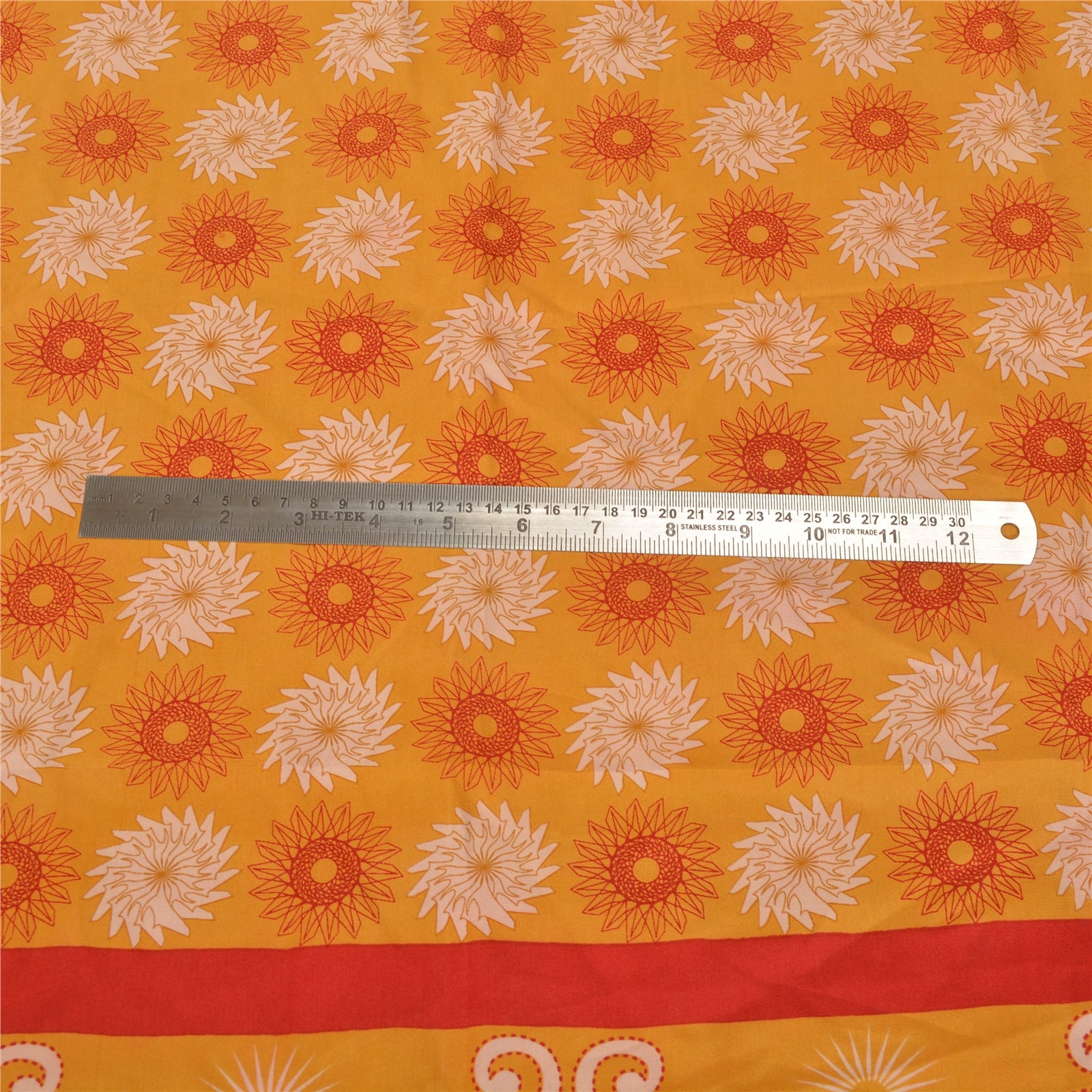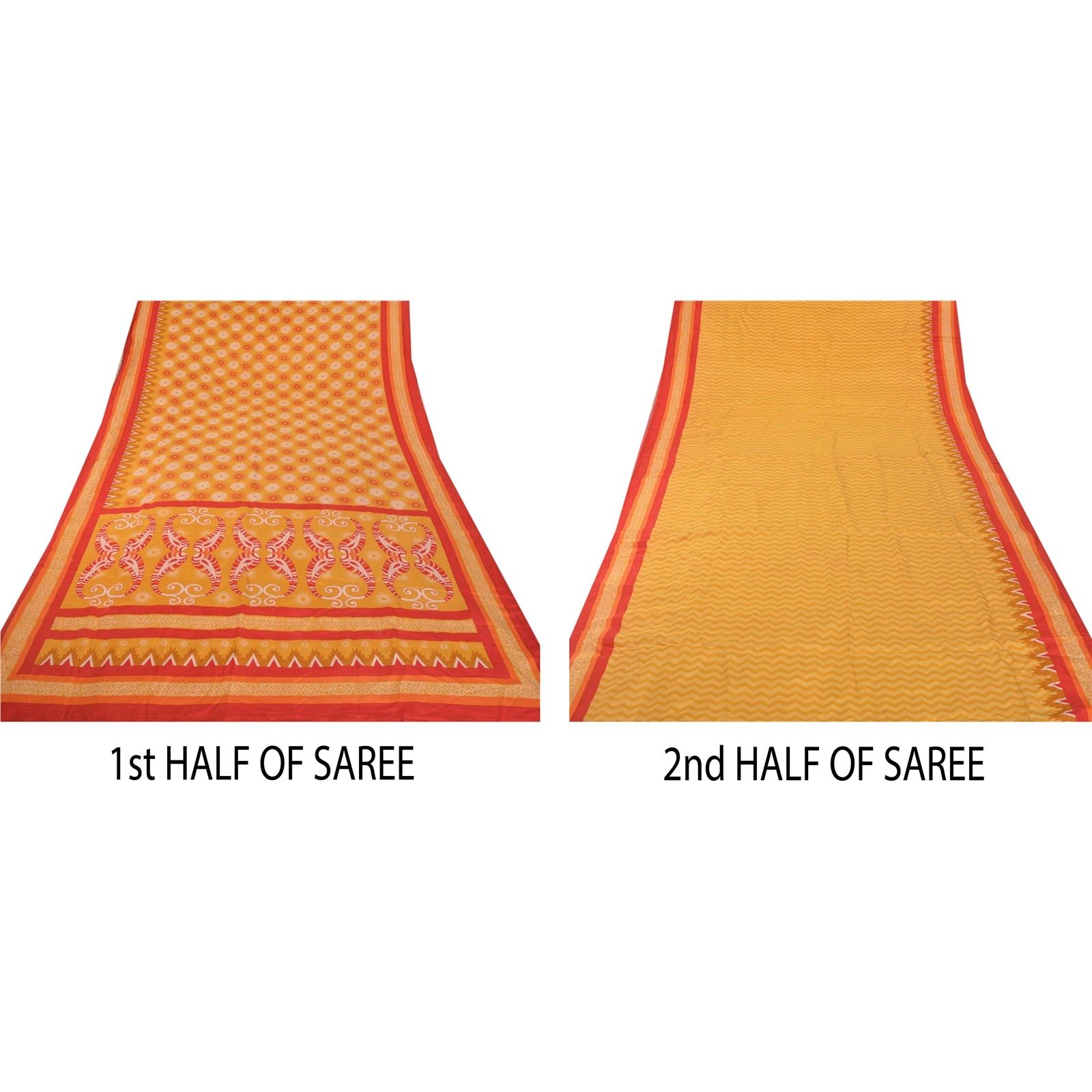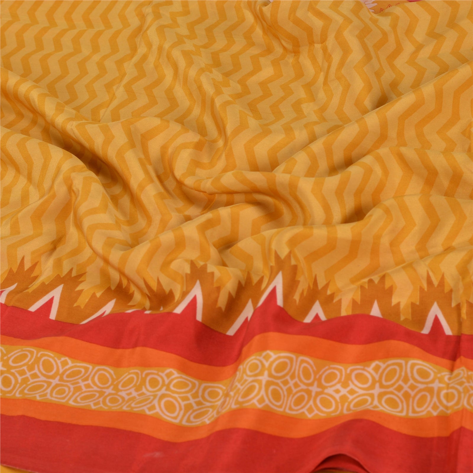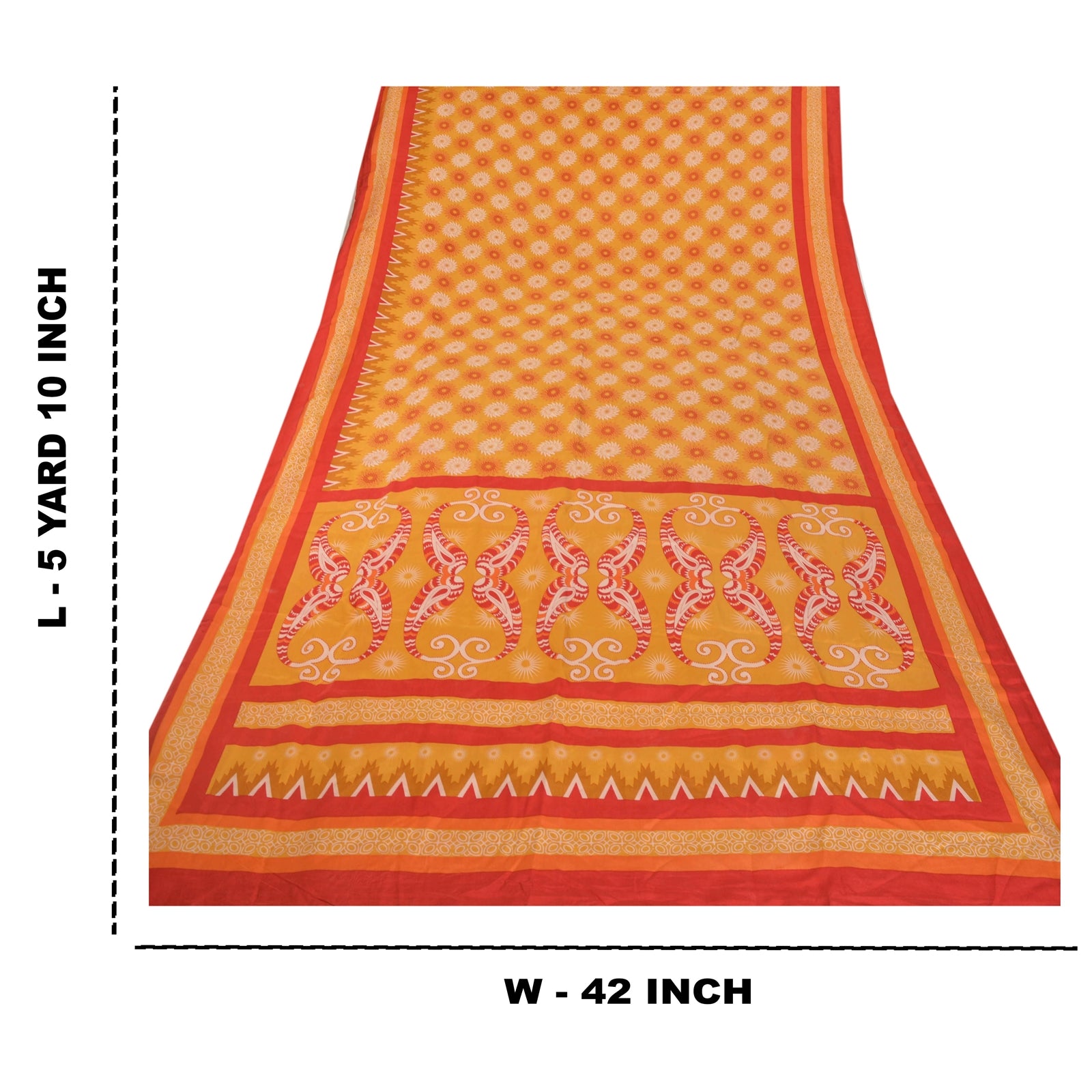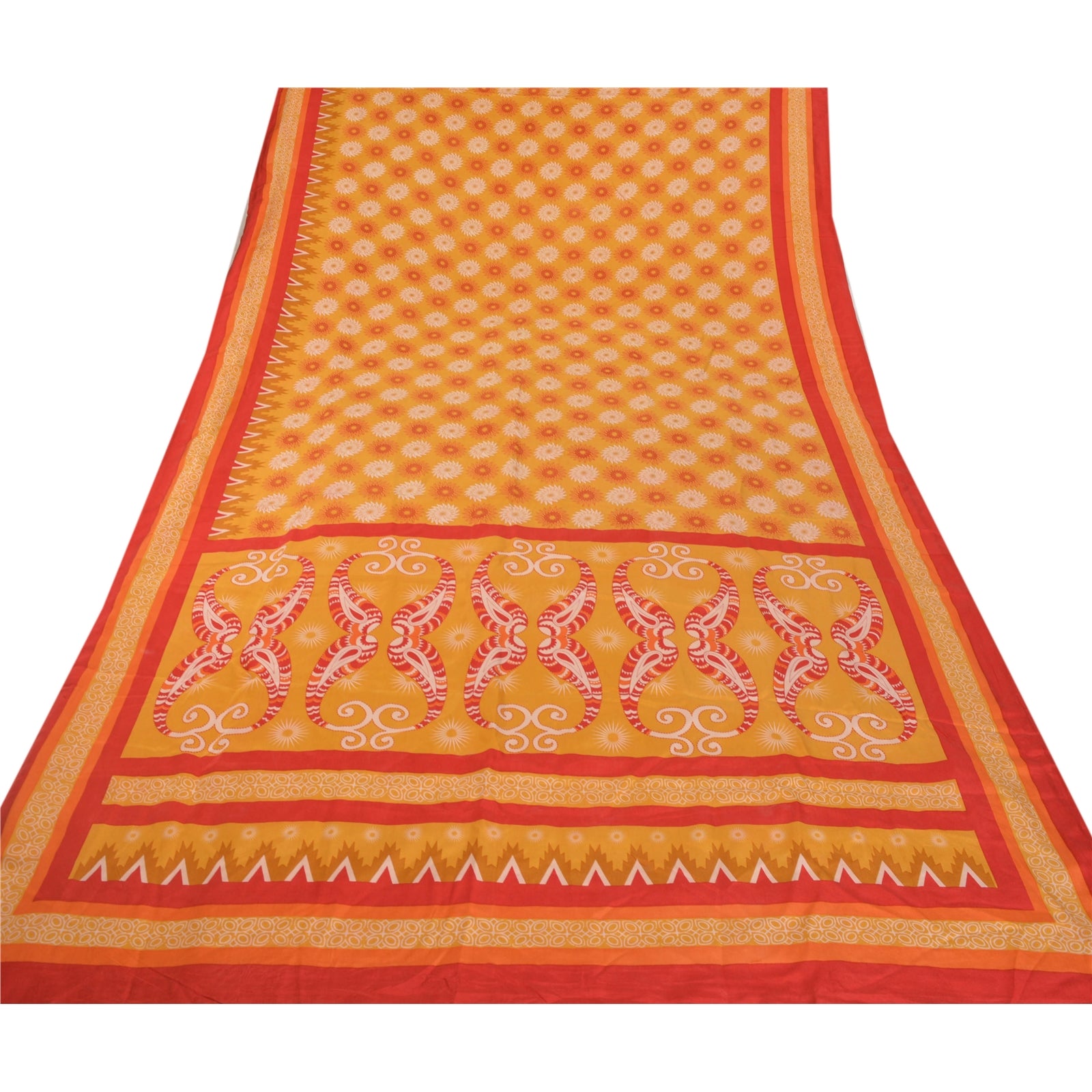 Beautiful Yellow & Red Colored 100% Pure Crepe Silk Printed Work Sari. Pallu & Border has printed floral & paisley design. Printed floral & geometric design in center part of saree. This unique vintage saree can be used for various crafting ideas even if you don't want to use it as a sari. Design a dress, use it as a as window dressing, upholstery, sarongs, throw, dress making and table linen much more. Let your creative juices flow and use this decorated Sustainable Fabric in multiple fashion.