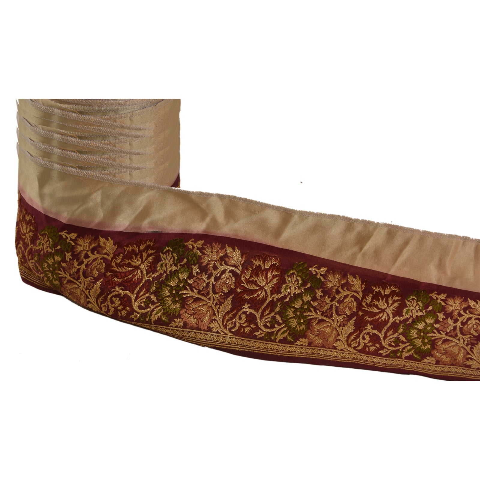 Amazing satin silk woven sari border in dark red color highlighting woven work. Border has beautiful floral patterns painstakingly golden, brown, green, orange weaving work. WOW!! an awesome one of a kind versatile border. 1 Quantity = 1 Yard