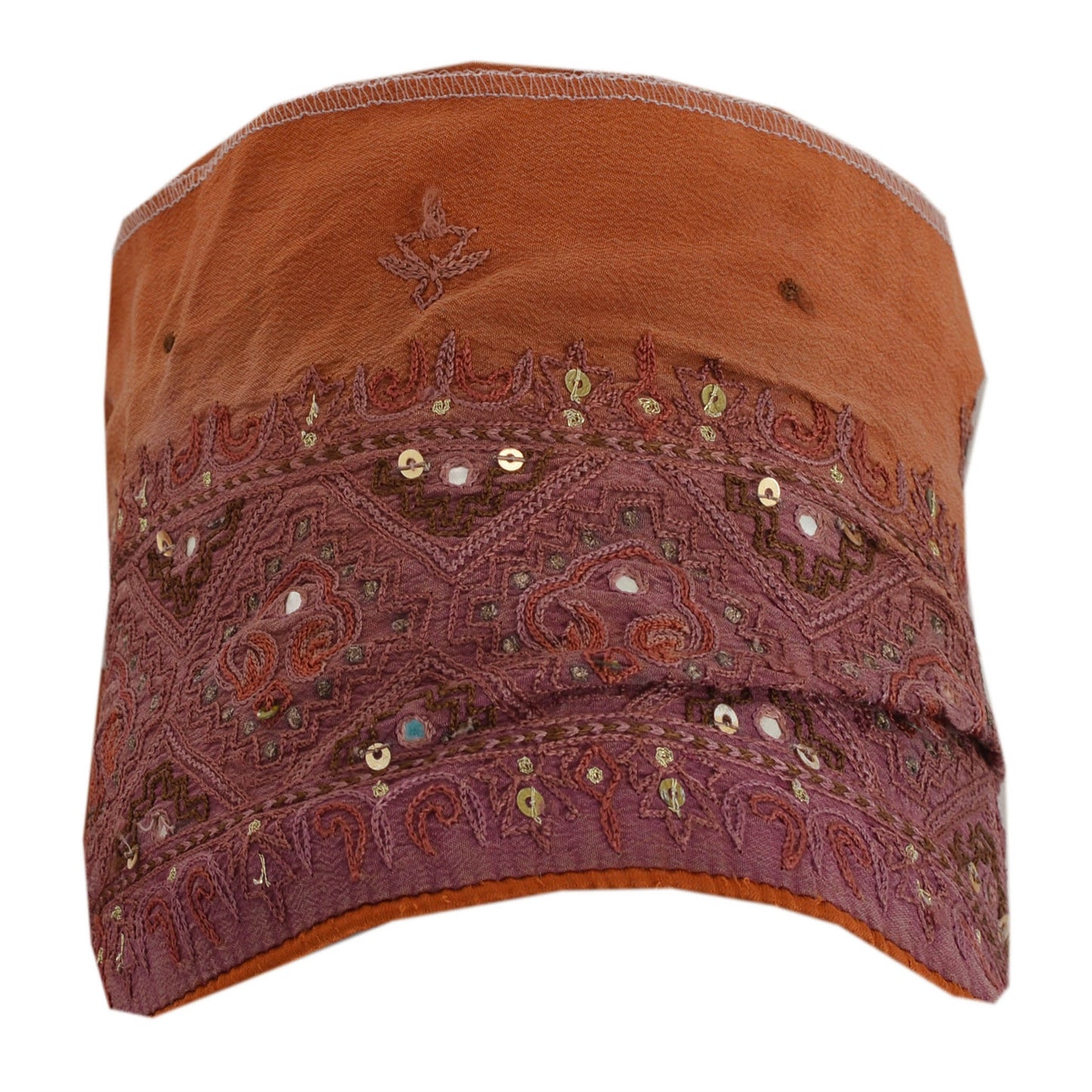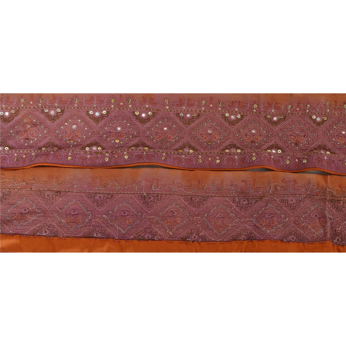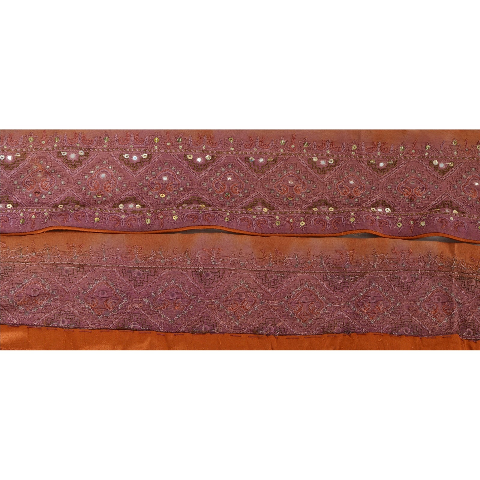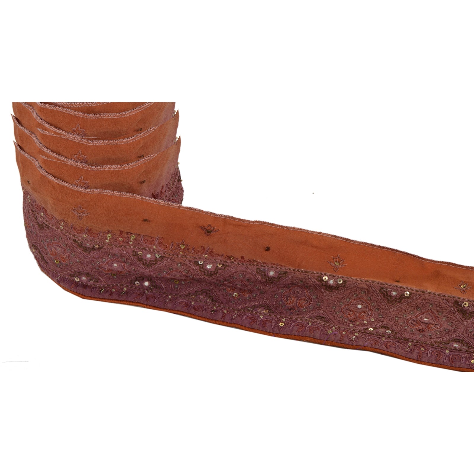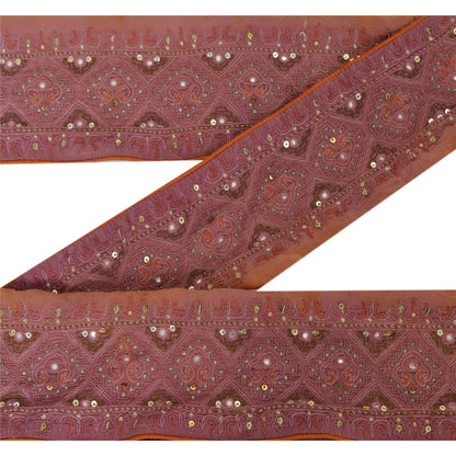 Stunning crepe silk hand beaded sari border in brown color highlighting sequins work. Border has beautiful floral & paisley patterns painstakingly hand beaded with golden sequins, golden zari work, mirror work. Further you can see fine detailing with purple/brown thread work. WOW!! an awesome one of a kind versatile border. 1 Quantity = 1 Yard