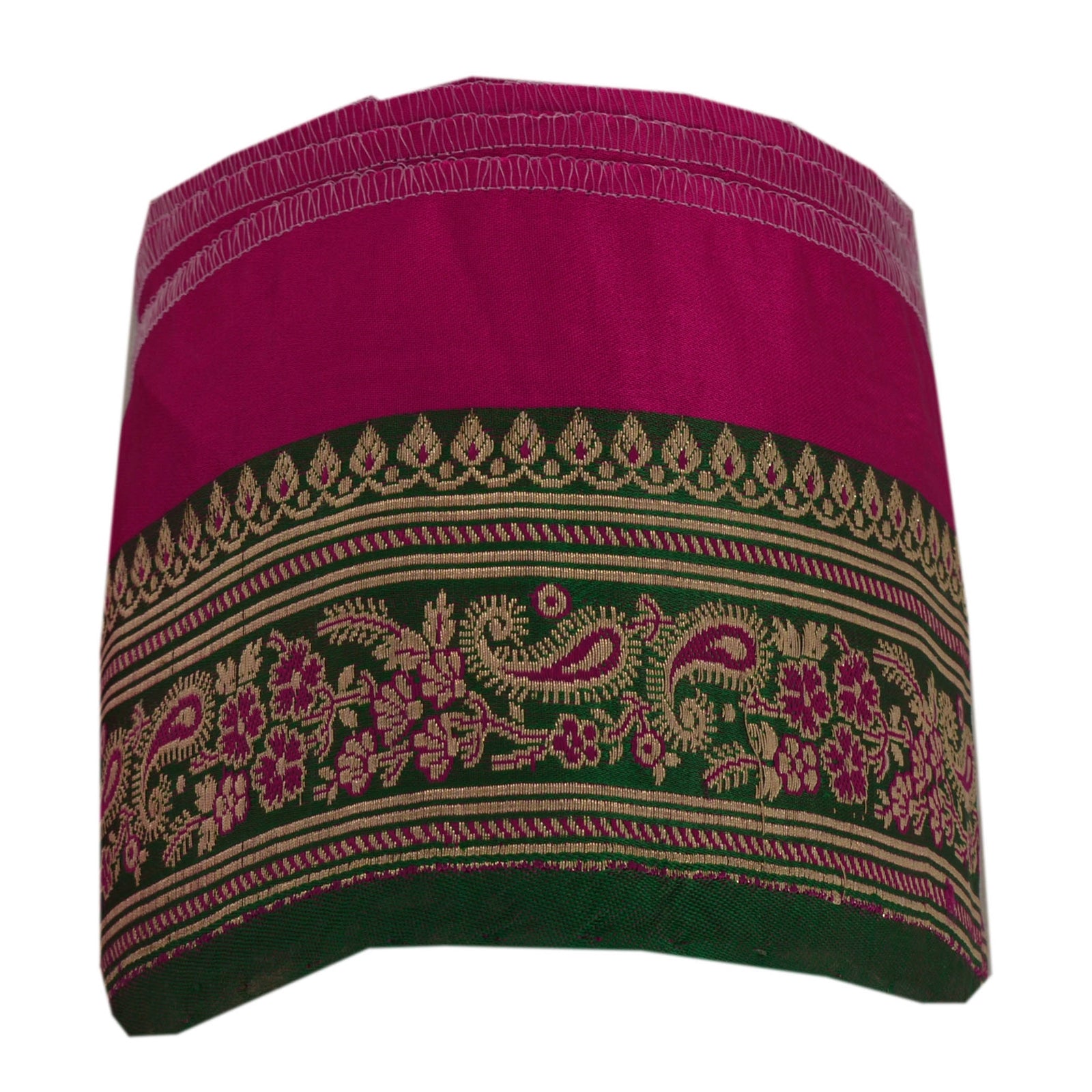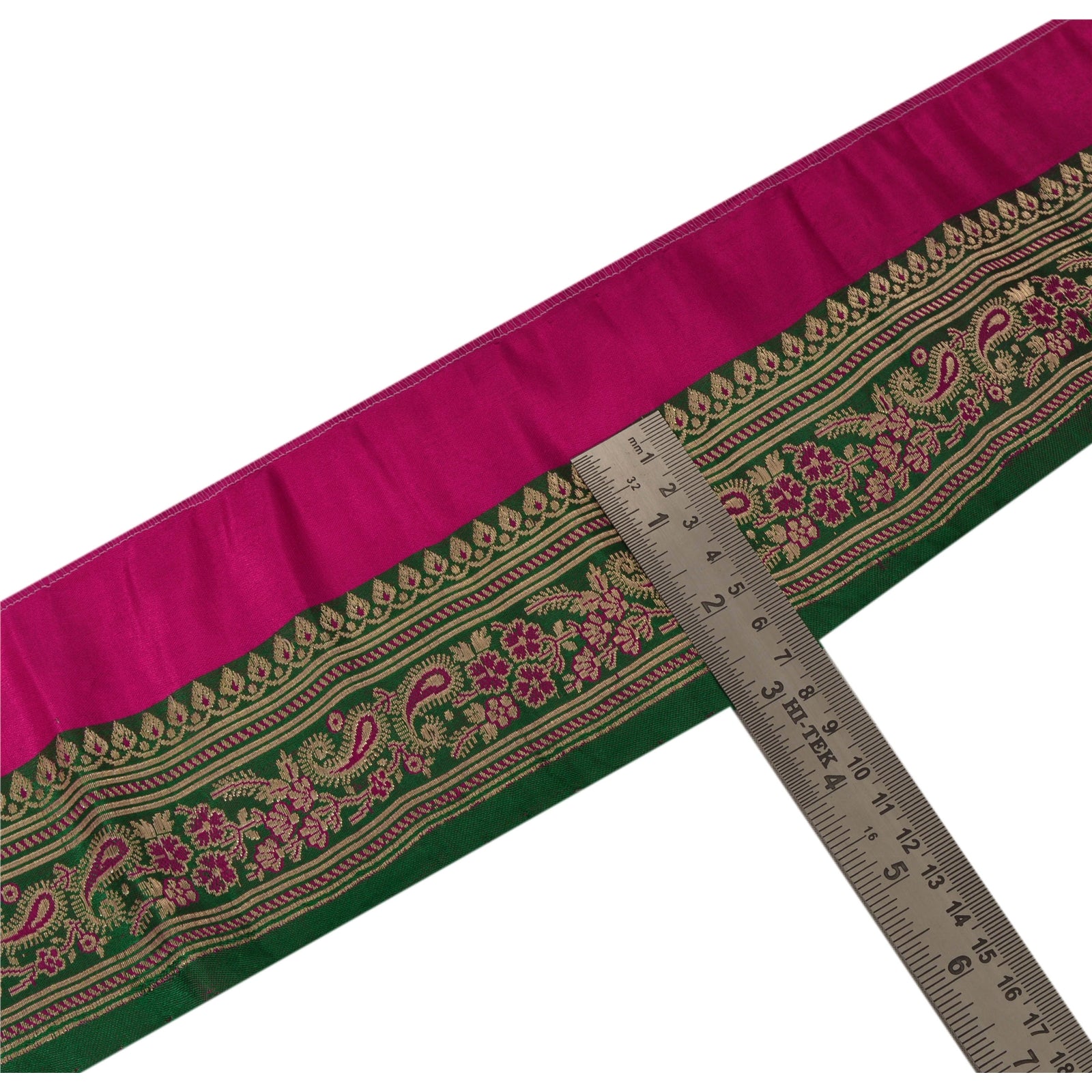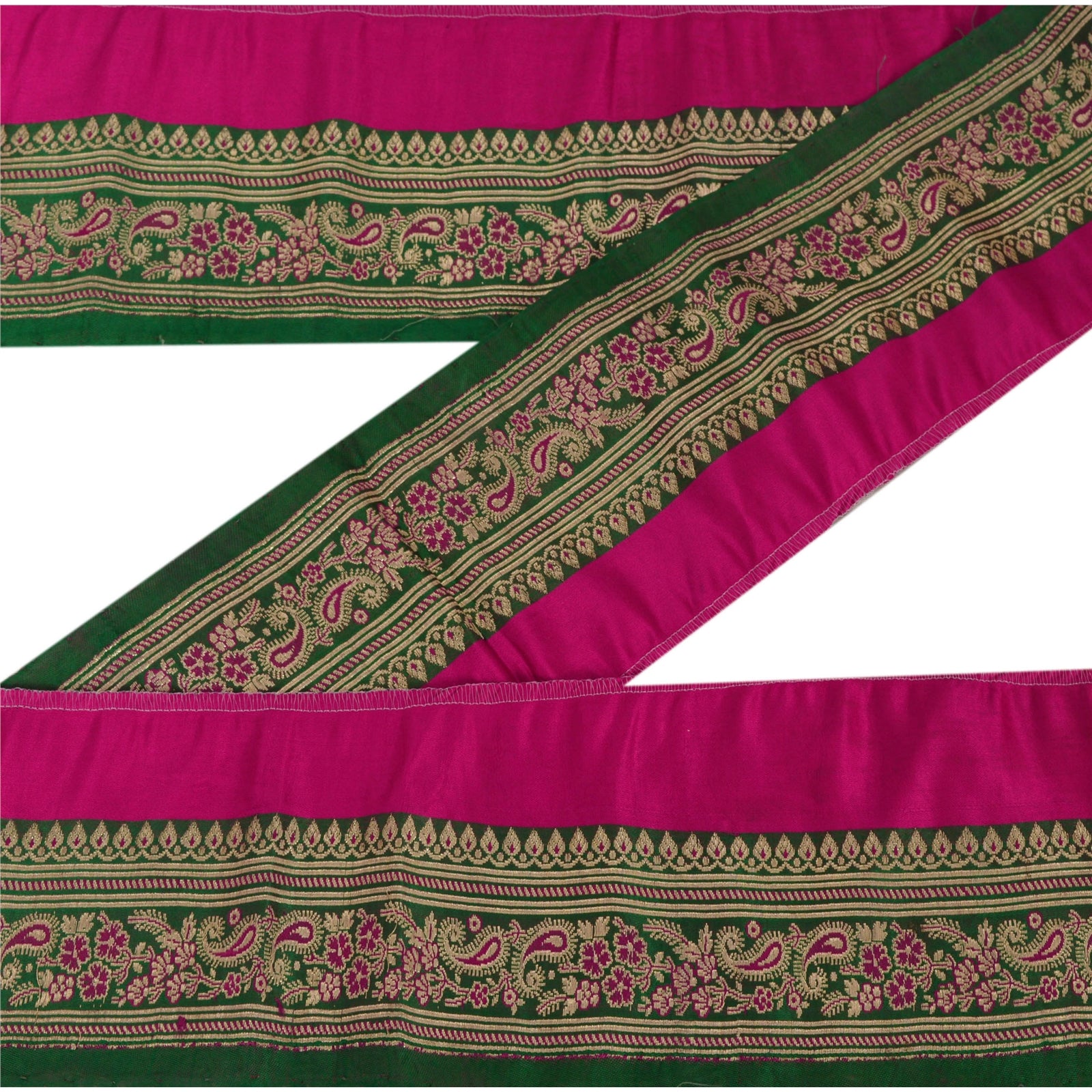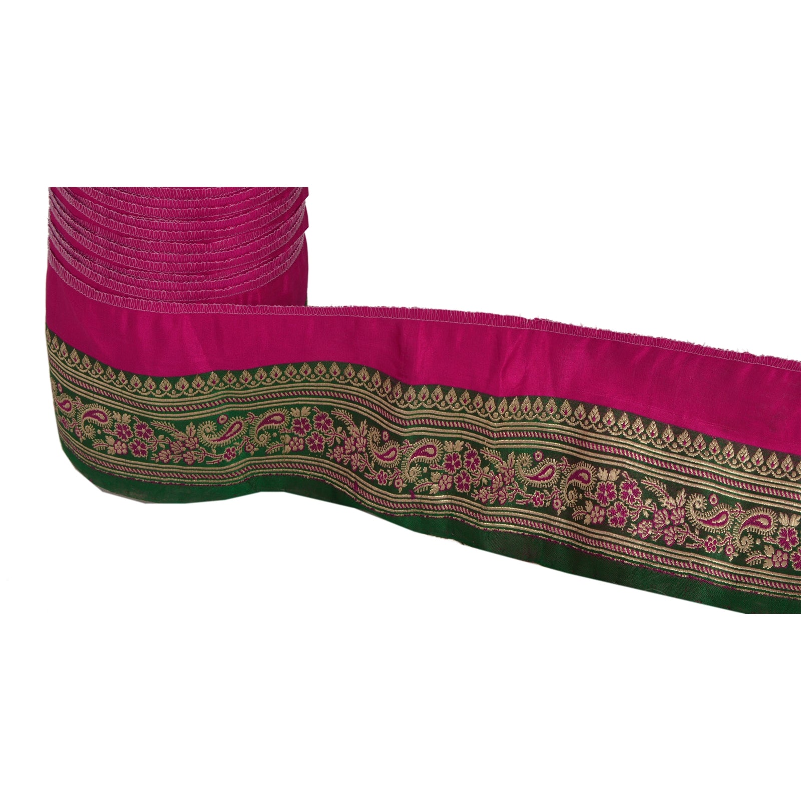 Outstanding satin silk woven brocade sari border in green & pink color highlighting zari work. Border has beautiful floral & paisley patterns painstakingly gold zari (electroplated copper metallic thread) work, pink thread work. WOW!! an awesome one of a kind versatile border. 1 Quantity = 1 Yard