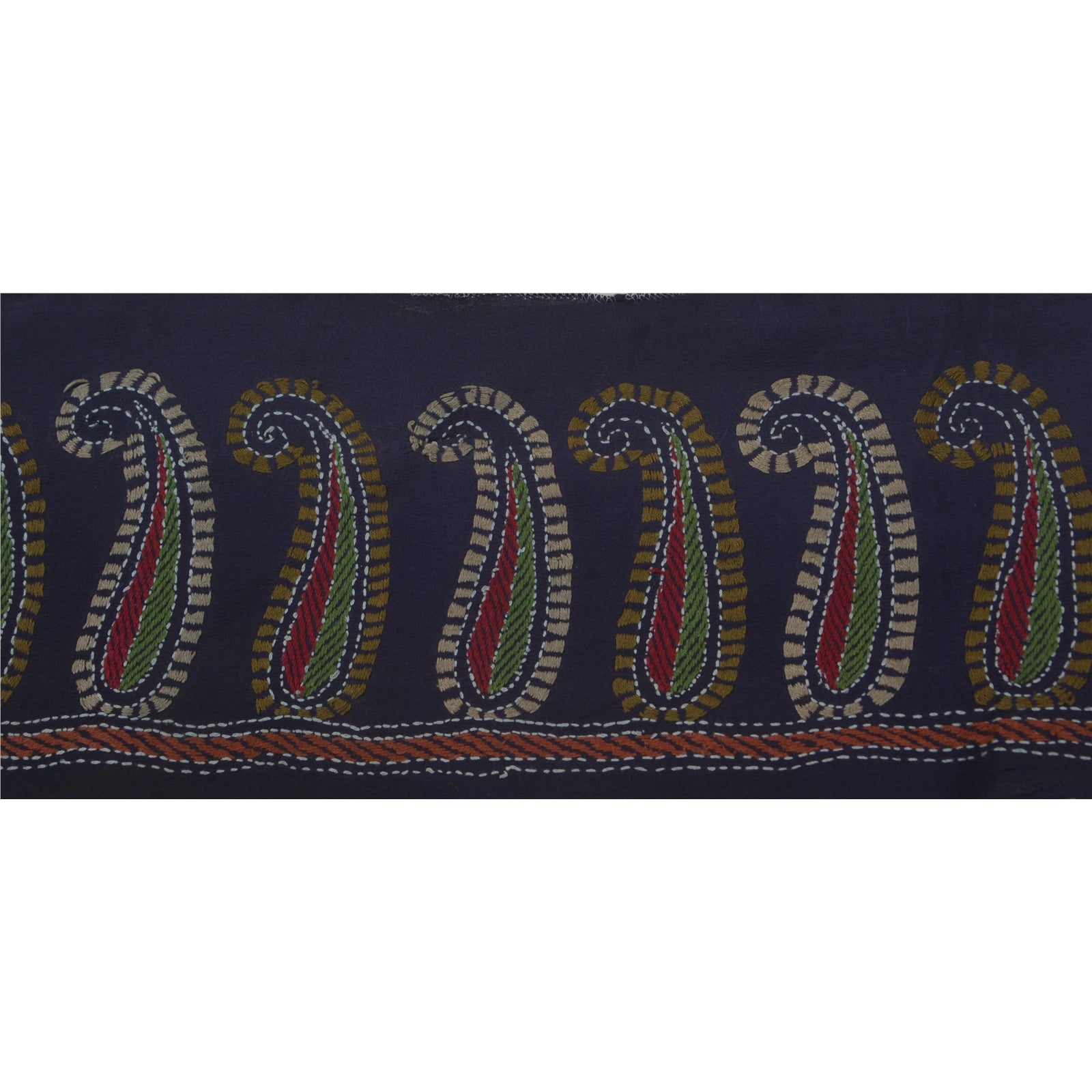 Attractive crepe silk hand embroidered Kantha sari border in blue color highlighting thread work. Border has beautiful floral & paisley patterns painstakingly hand embroidered with green, blue, red thread work. WOW!! an awesome one of a kind versatile border. 1 Quantity = 1 Yard