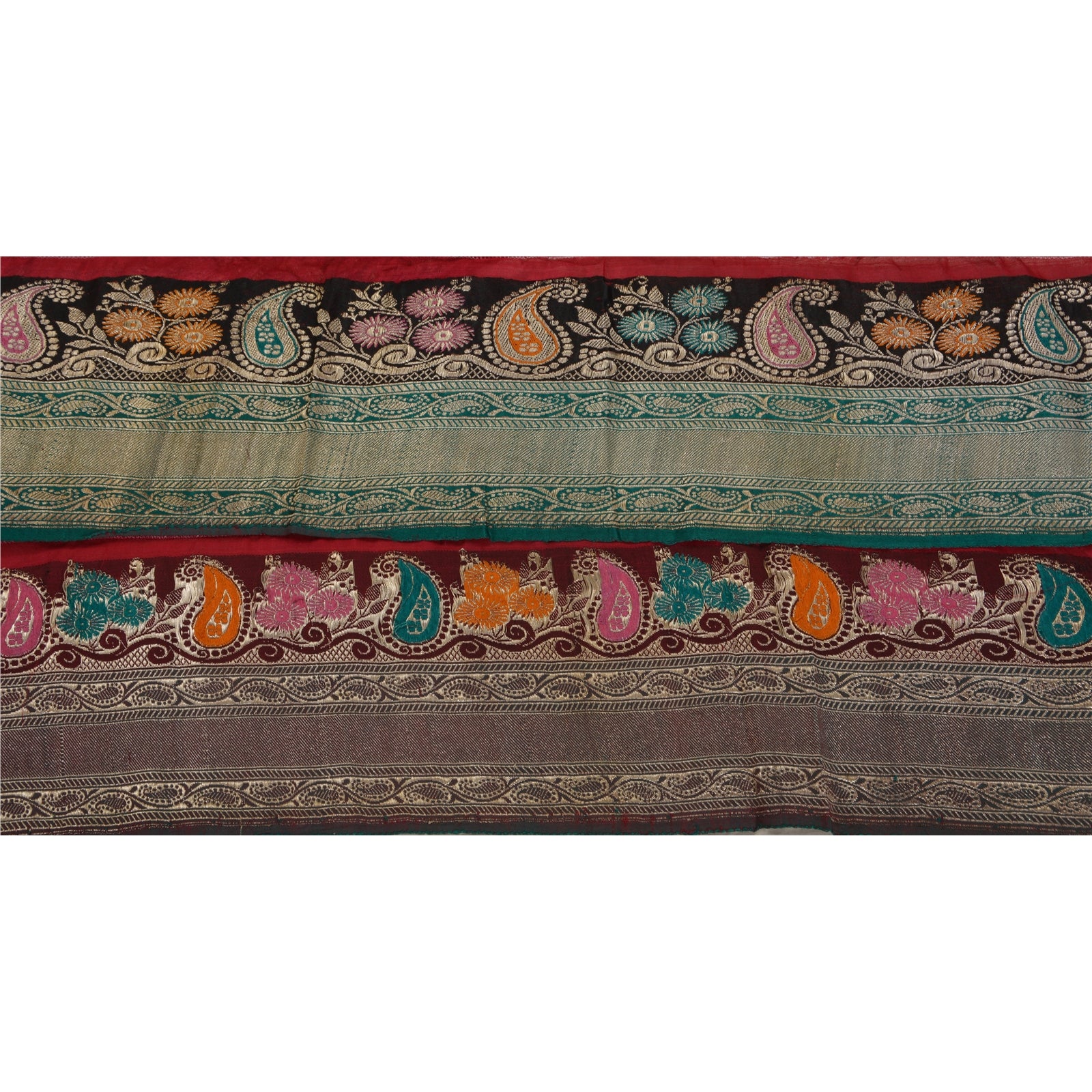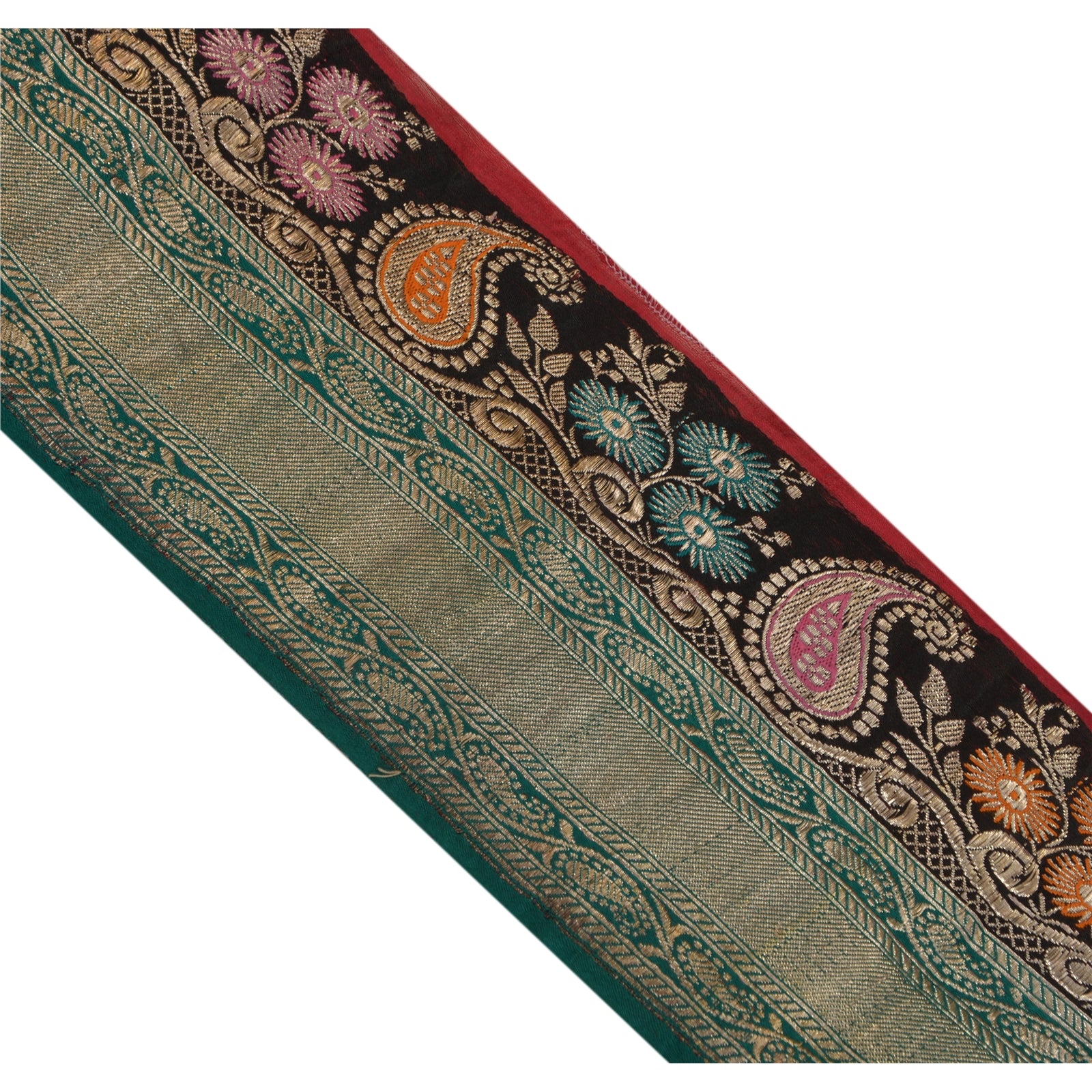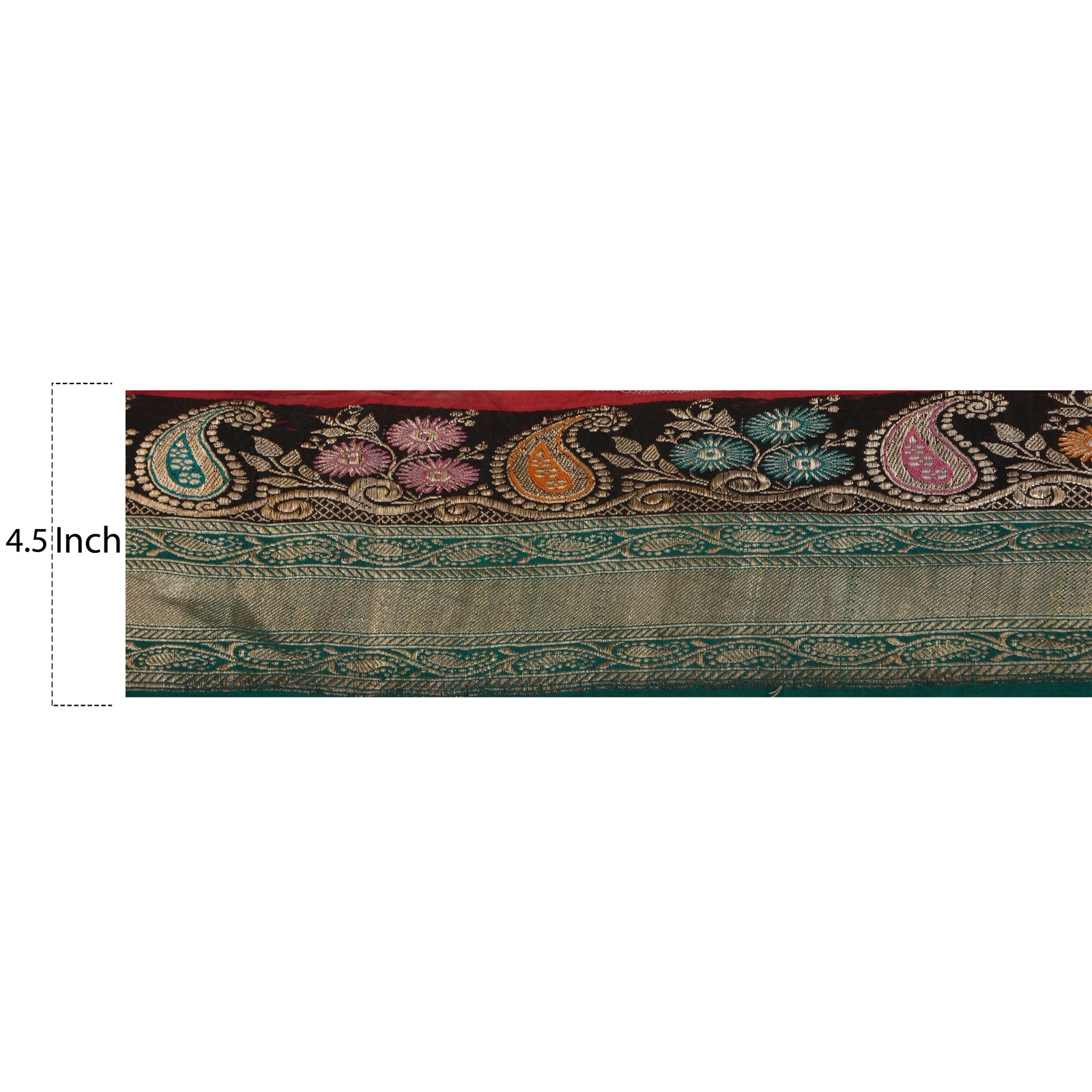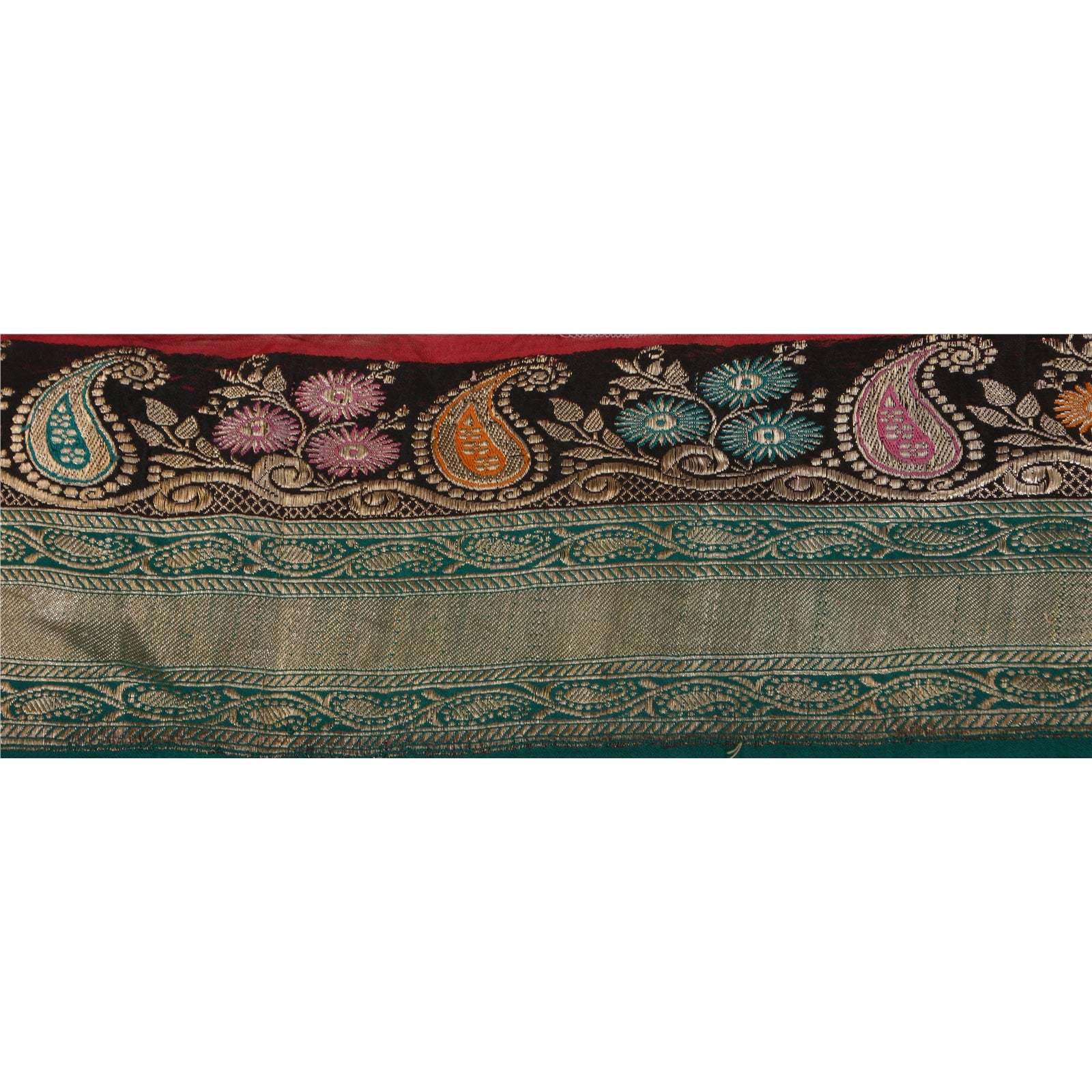 Outstanding satin silk woven brocade sari border in green & black color highlighting zari work. Border has beautiful floral & paisley patterns painstakingly gold zari work (electroplated copper metallic thread) work, multi color thread work. WOW!! an awesome one of a kind versatile border. 1 Quantity = 1 Yard