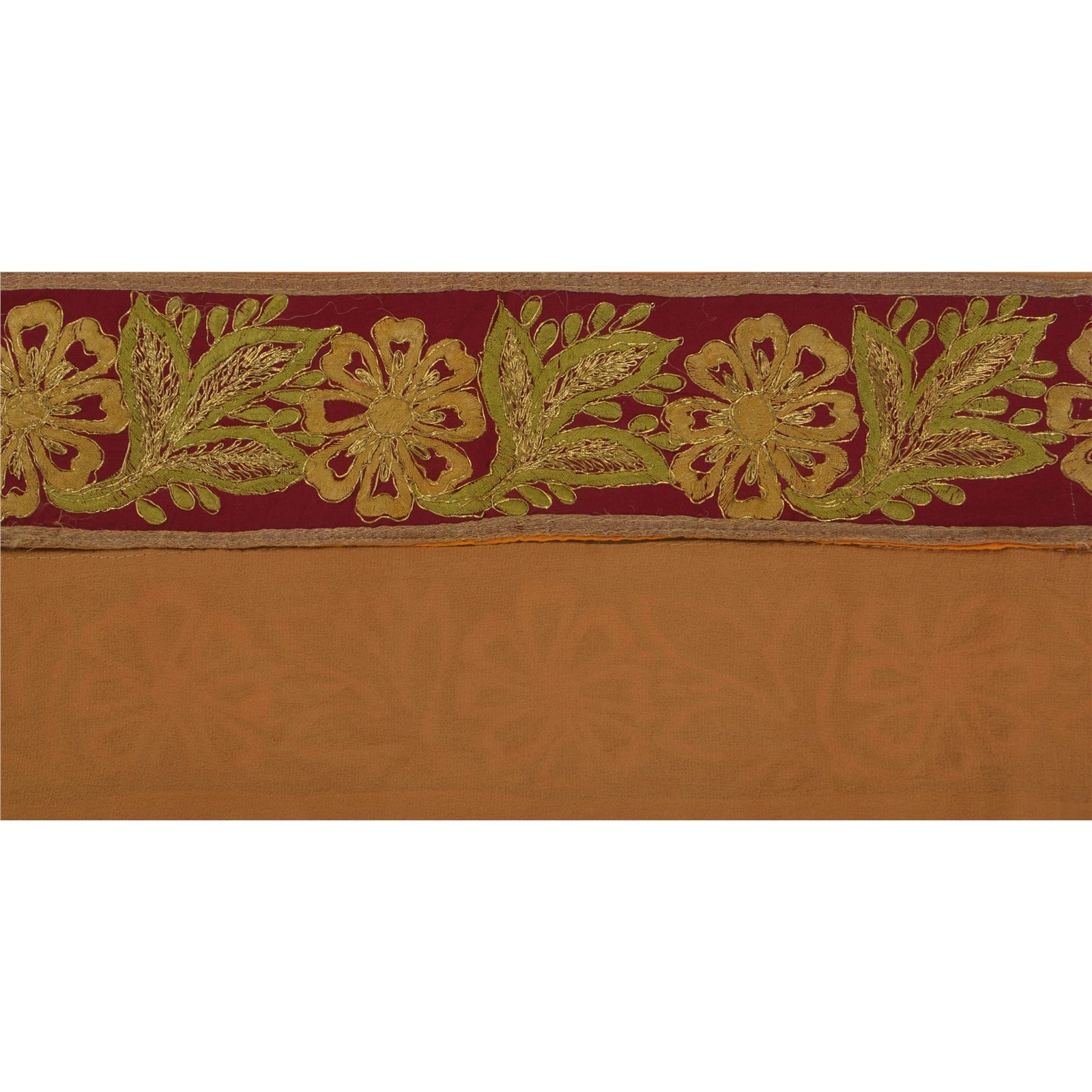 Amazing georgette embroidered sari border in saffron color highlighting thread work. Border has beautiful floral patterns painstakingly embroidered with golden dori work, dark red Sustainable Fabric patch work . Further you can see fine detailing with green/mustard thread work. WOW!! an awesome one of a kind versatile border. 1 Quantity = 1 Yard