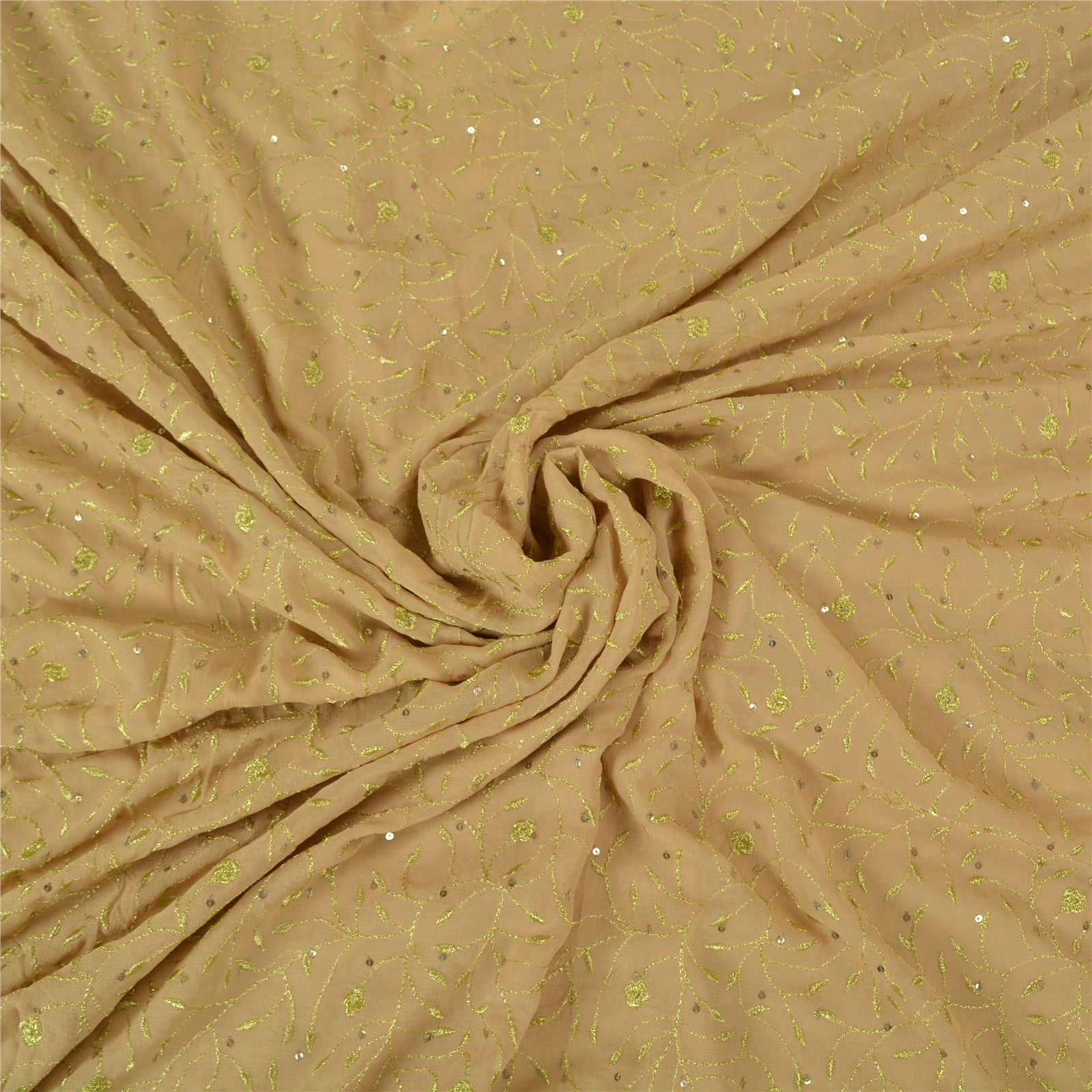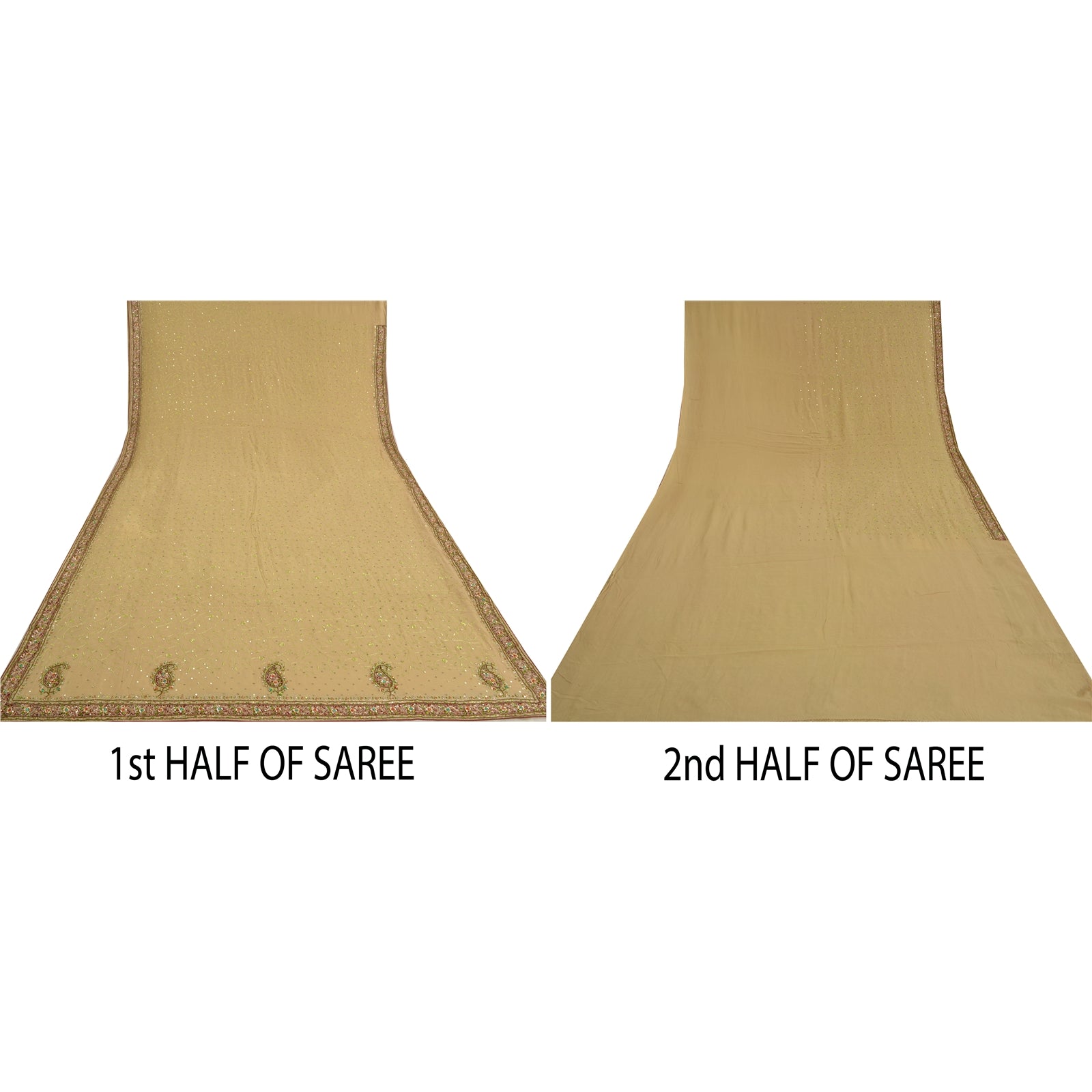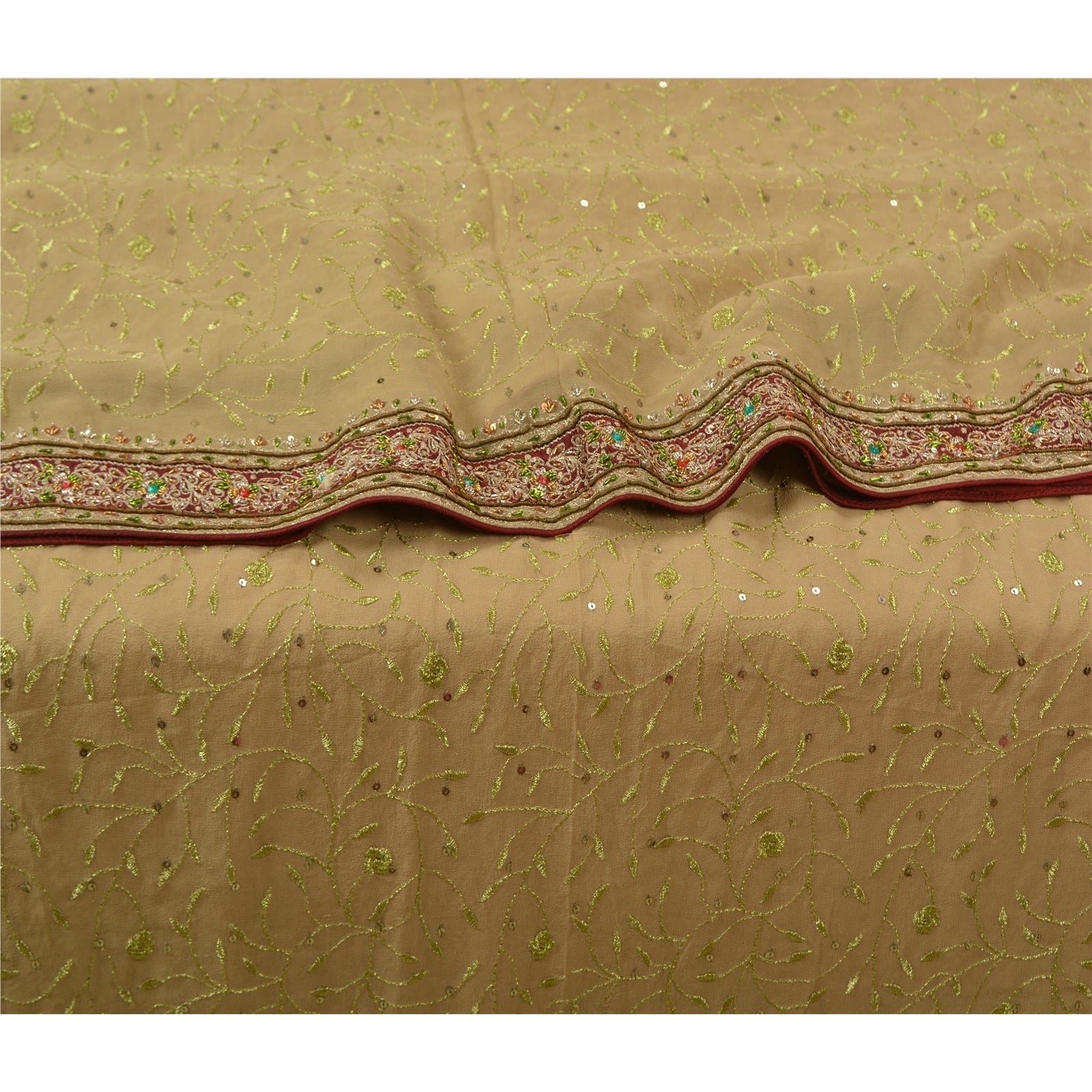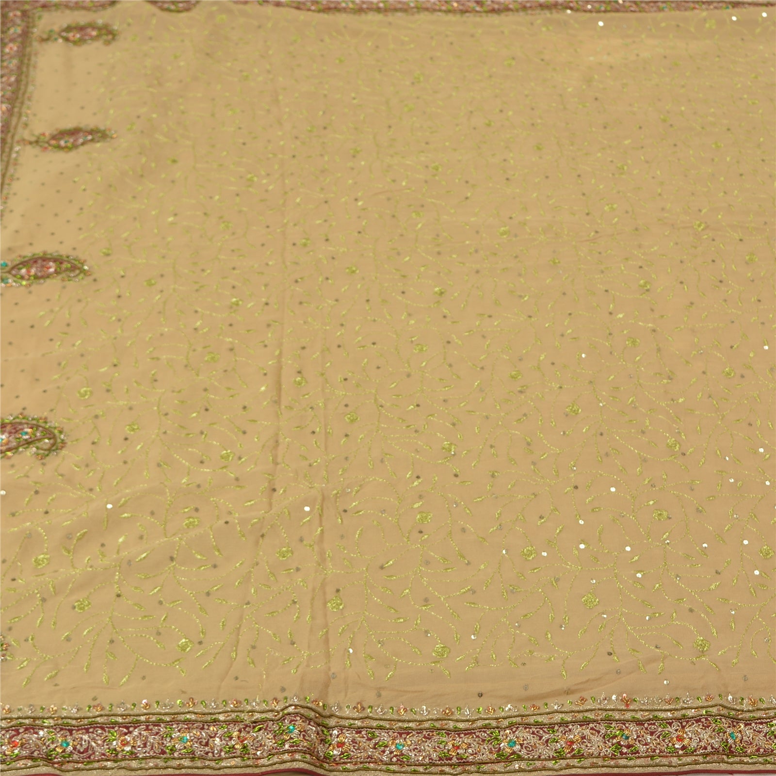 'THE ITEM COLOR OR SHADE MAY BE DARKER OR LIGHTER THAN THE PICTURE.' Beautiful shade of beige colored pure georgette silk hand embroidered Kutch work heavy saree. Pallu & Border Features are floral & paisley pattern embroidered dark red Sustainable Fabric patch work embellished with metallic golden zari/dabka work, multi color zardozi work, green/red rhinestones work. You can see floral design with thread & sequins work in centre part of saree. This heavy saree can be used for various crafting ideas too. Use it for dress designing, as a throw, as window dressing, upholstery, table linen and much more. Let your creative juices flow!