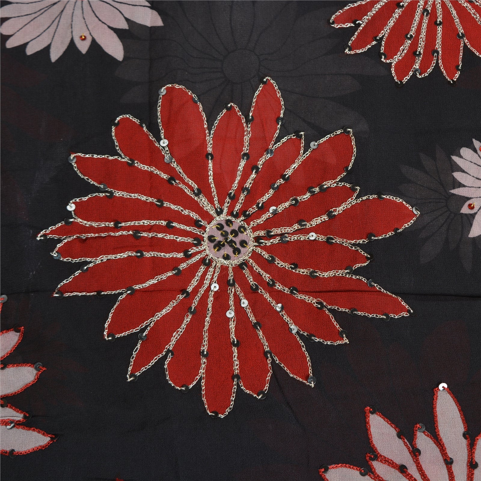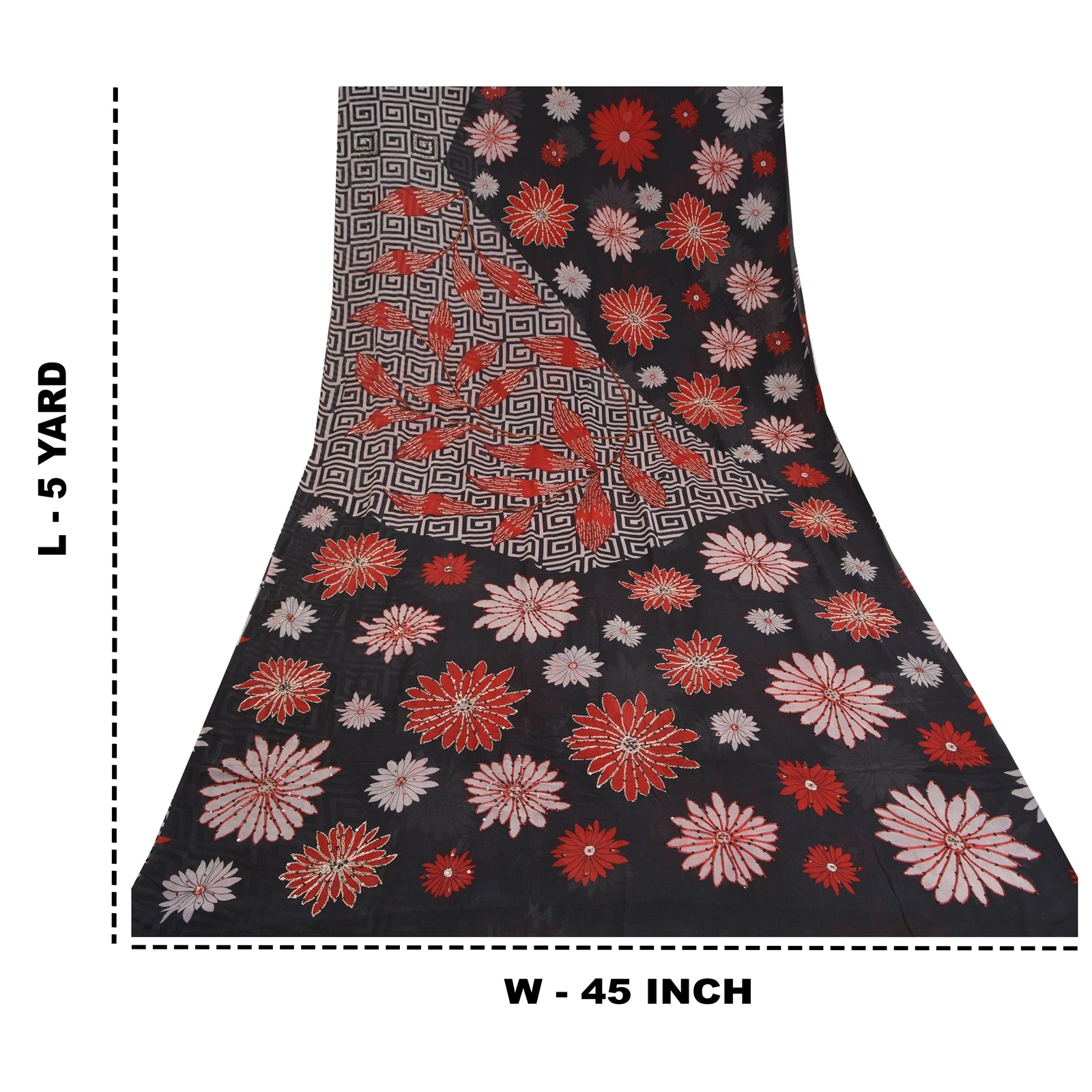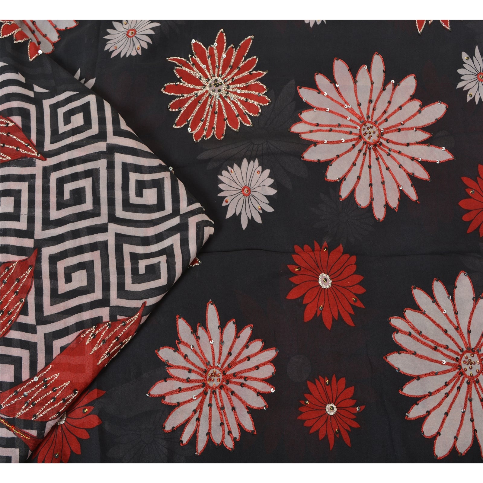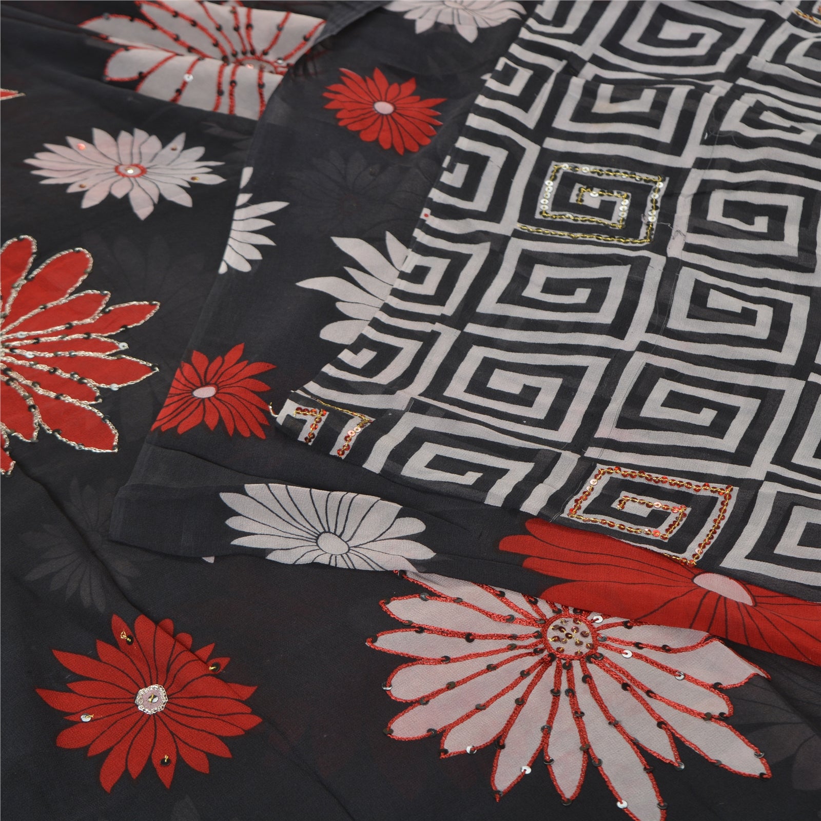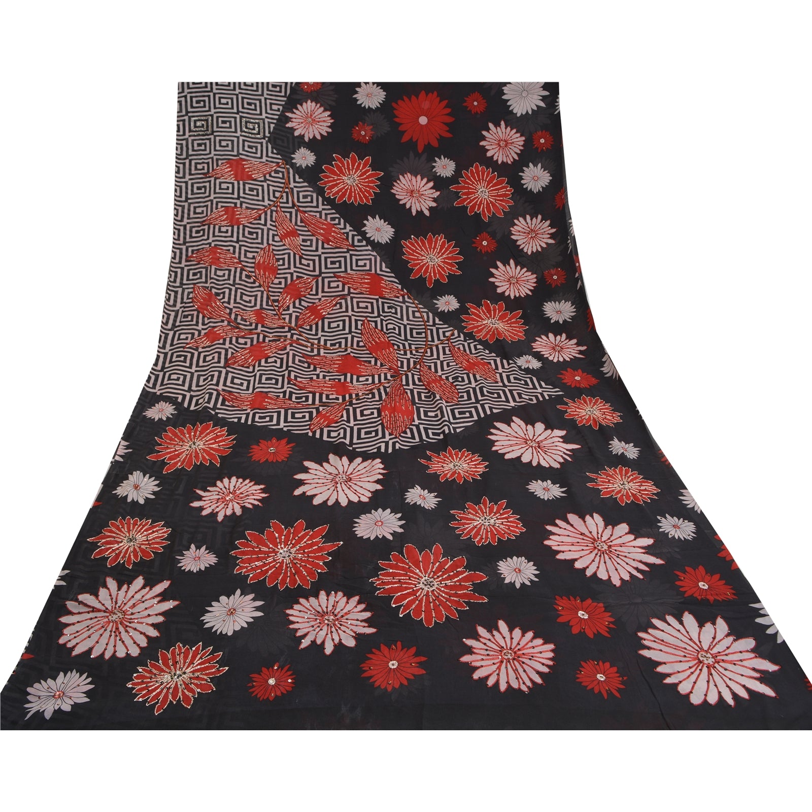 'THE ITEM COLOR OR SHADE MAY BE DARKER OR LIGHTER THAN THE PICTURE.' Beautiful black colored pure georgette hand embroidered printed sari/Sustainable Fabric. Pallu has printed floral design which is embellished with silver zari work, red/black thread work, red thread work. The center of the saree has printed floral design with zari & sequins work. As the item is Vintage, some minor stains and defects are expected. This saree can be used for various crafting ideas too. Use it for dress designing, as a throw, as window dressing, upholstery, table linen and much more. Let your creative juices flow. 'International buyers please note: Import duties, taxes, and charges are not included in the item price or postage cost. These charges are the buyer's responsibility. Please check with your country's customs office to determine what these additional costs will be prior to bidding or buying. Buyer will pay custom duty/tax. It is calculated and charged differently by every country. As a seller I do not have any control over it. VAT or sales tax is calculated by the platform at the time of checkout. Customs charge is payable at the time of delivery.'