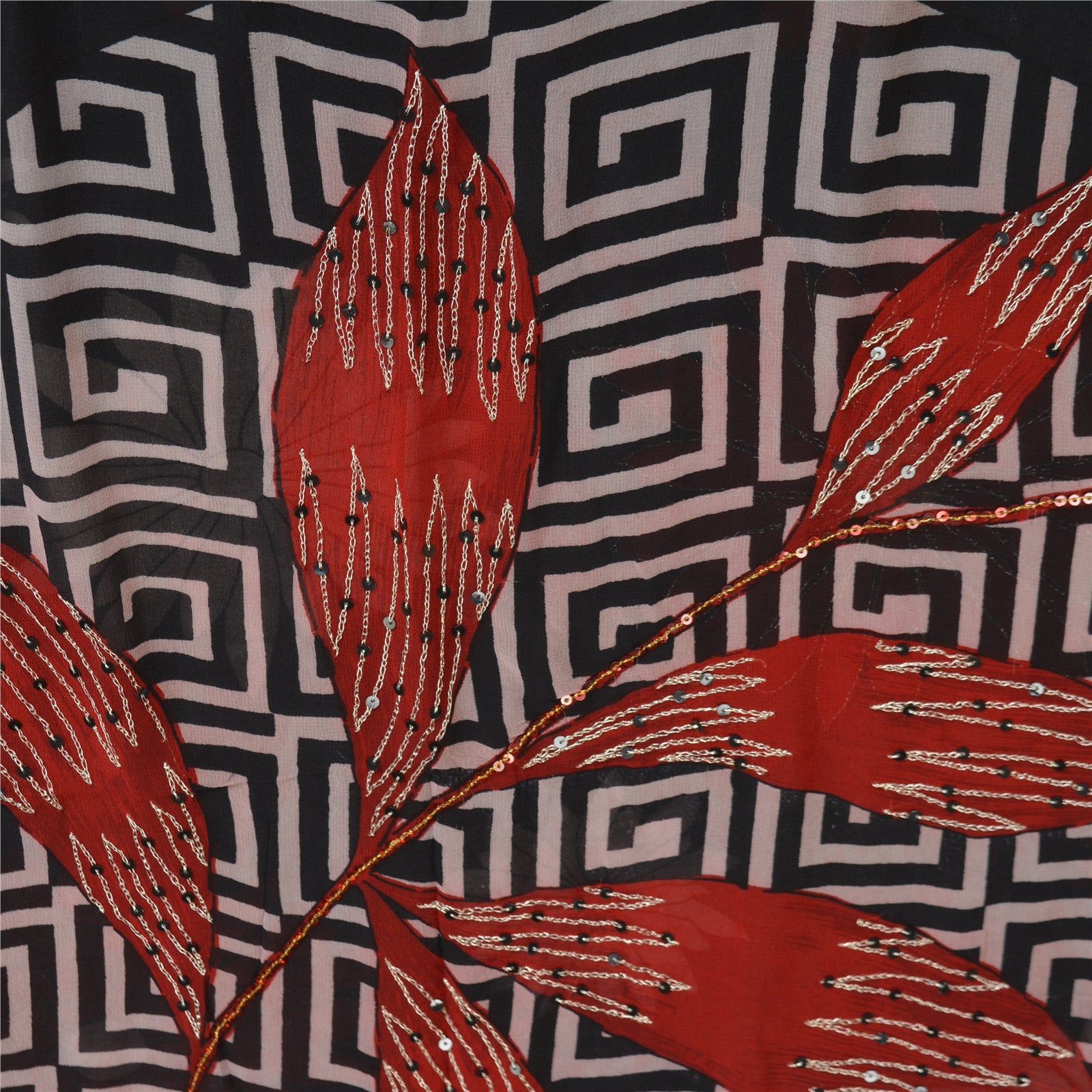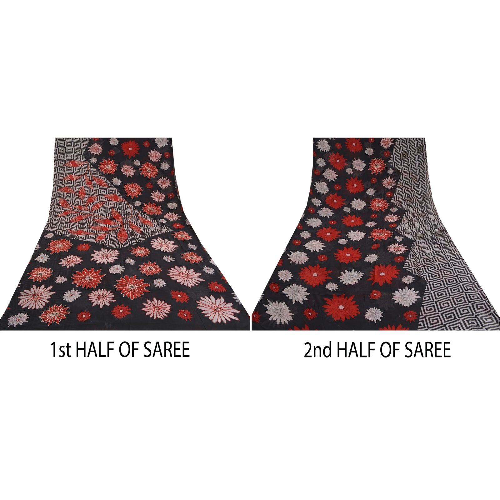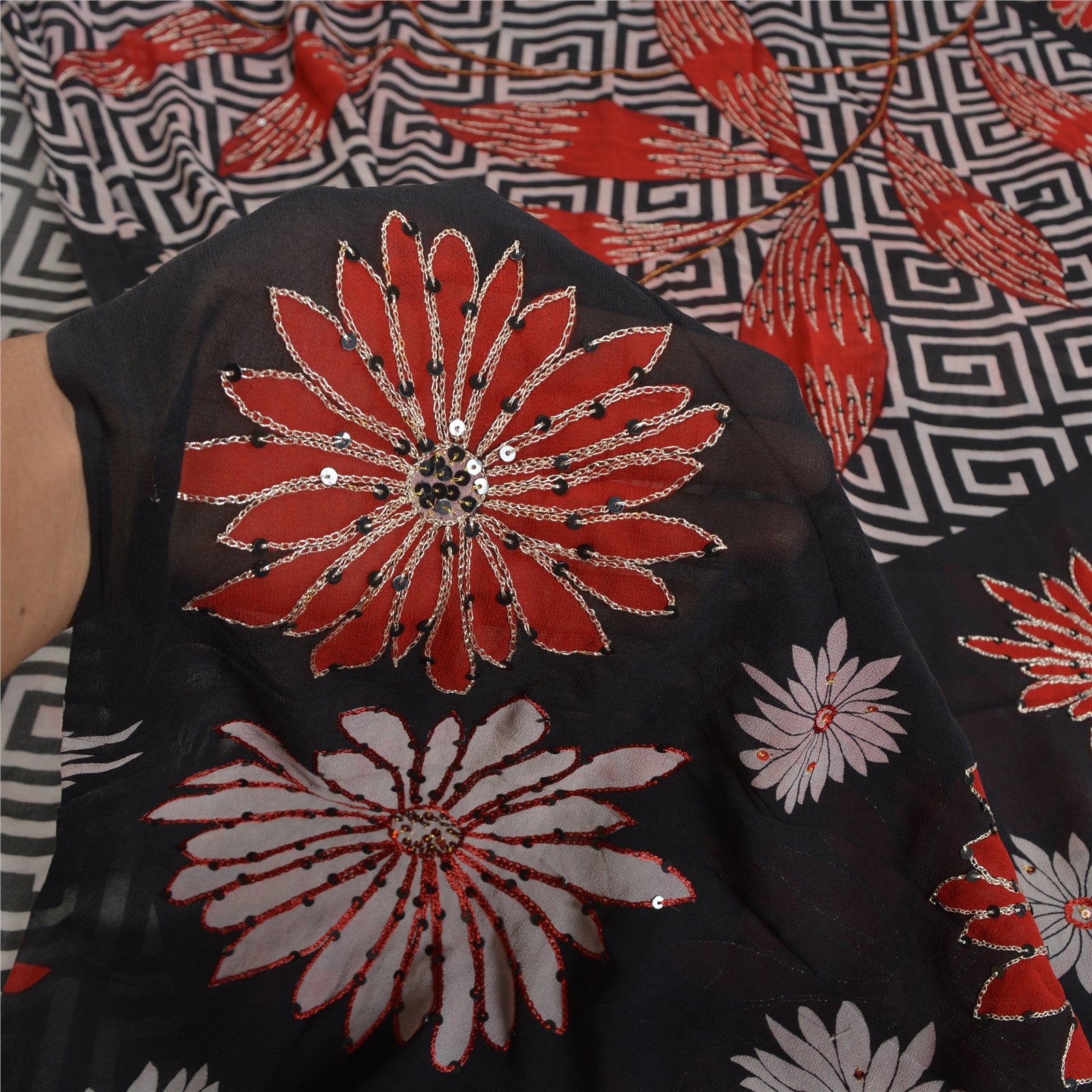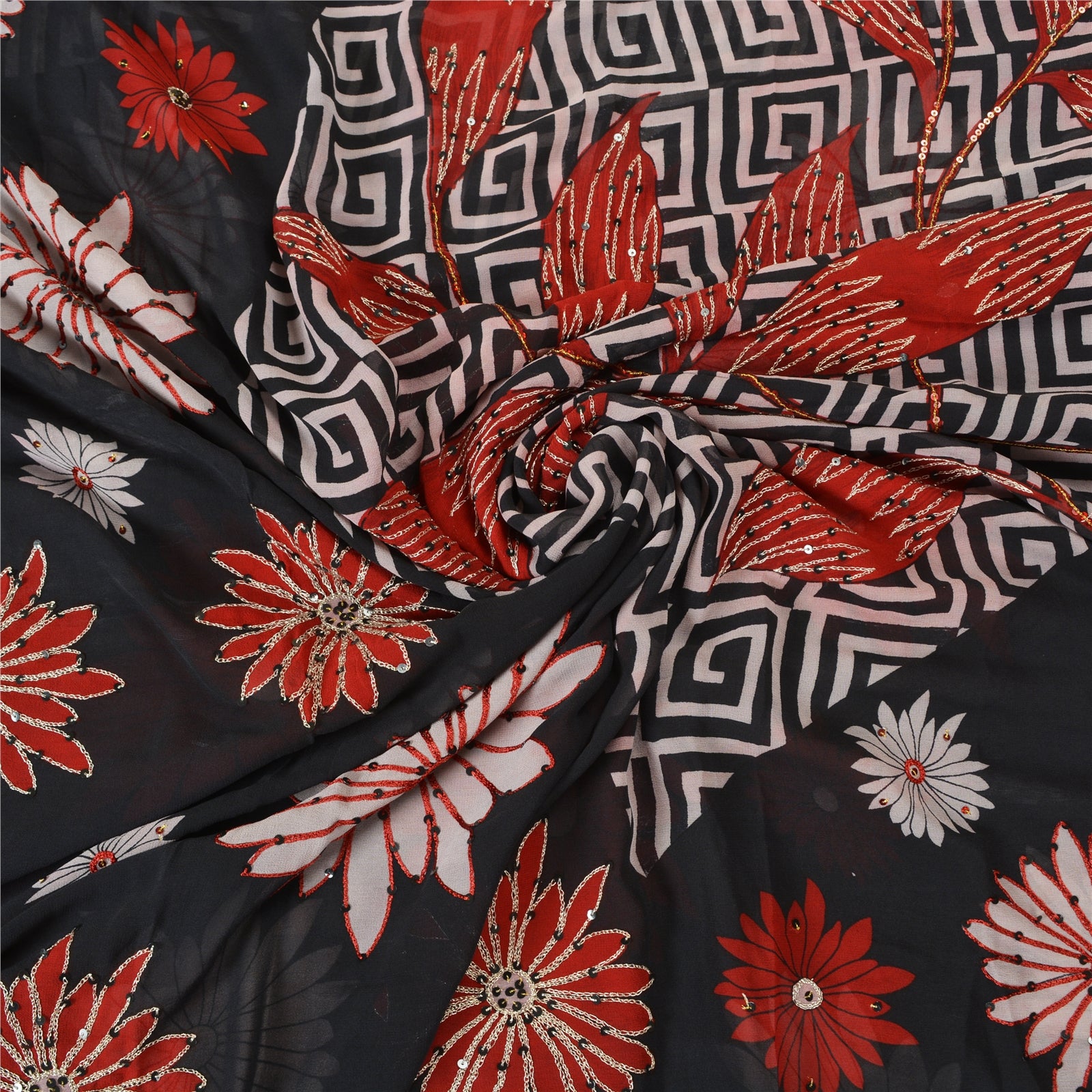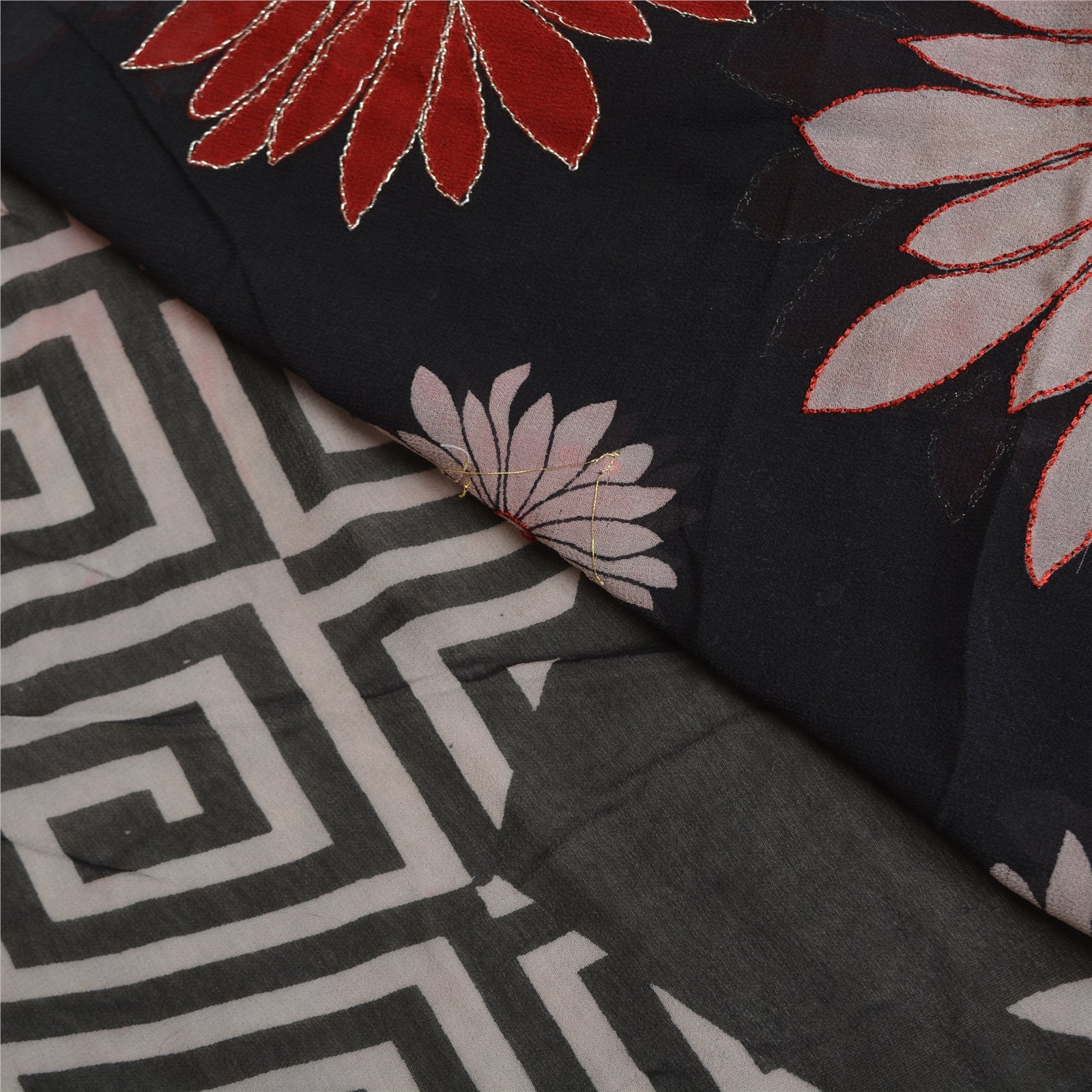 'THE ITEM COLOR OR SHADE MAY BE DARKER OR LIGHTER THAN THE PICTURE.' Beautiful black colored pure georgette hand embroidered printed sari/Sustainable Fabric. Pallu has printed floral design which is embellished with silver zari work, red/black thread work, red thread work. The center of the saree has printed floral design with zari & sequins work. As the item is Vintage, some minor stains and defects are expected. This saree can be used for various crafting ideas too. Use it for dress designing, as a throw, as window dressing, upholstery, table linen and much more. Let your creative juices flow. 'International buyers please note: Import duties, taxes, and charges are not included in the item price or postage cost. These charges are the buyer's responsibility. Please check with your country's customs office to determine what these additional costs will be prior to bidding or buying. Buyer will pay custom duty/tax. It is calculated and charged differently by every country. As a seller I do not have any control over it. VAT or sales tax is calculated by the platform at the time of checkout. Customs charge is payable at the time of delivery.'
