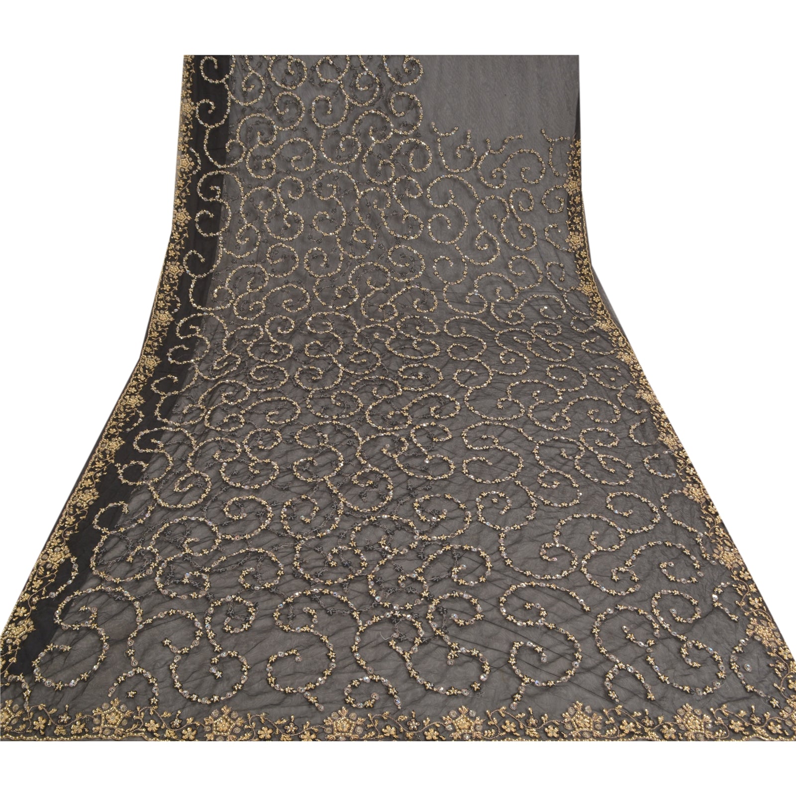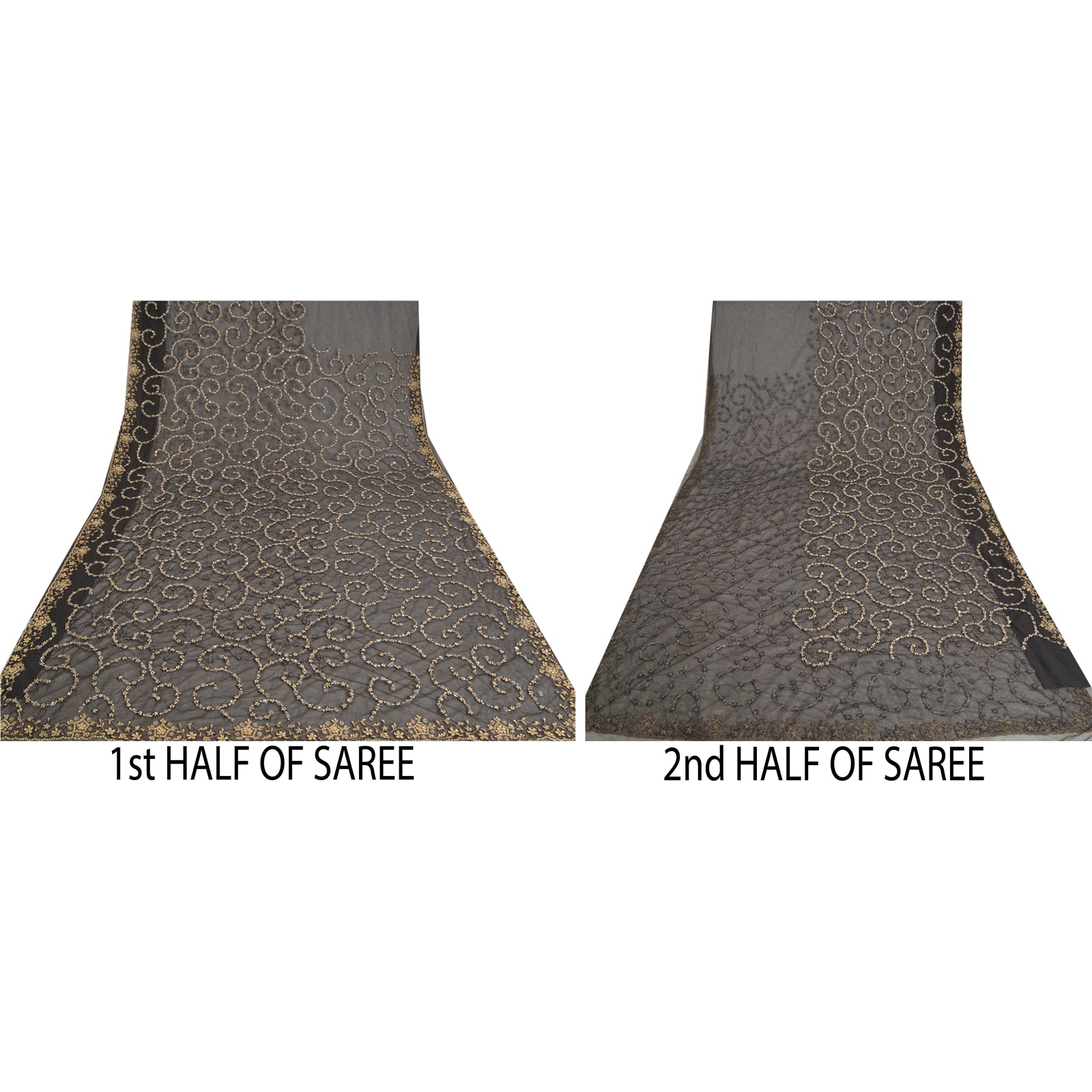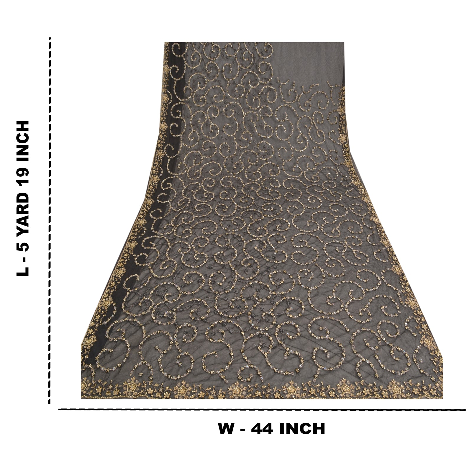 Sanskriti Vintage Black Heavy Sarees Net Mesh Hand Beaded Party Sari Sustainable Fabric