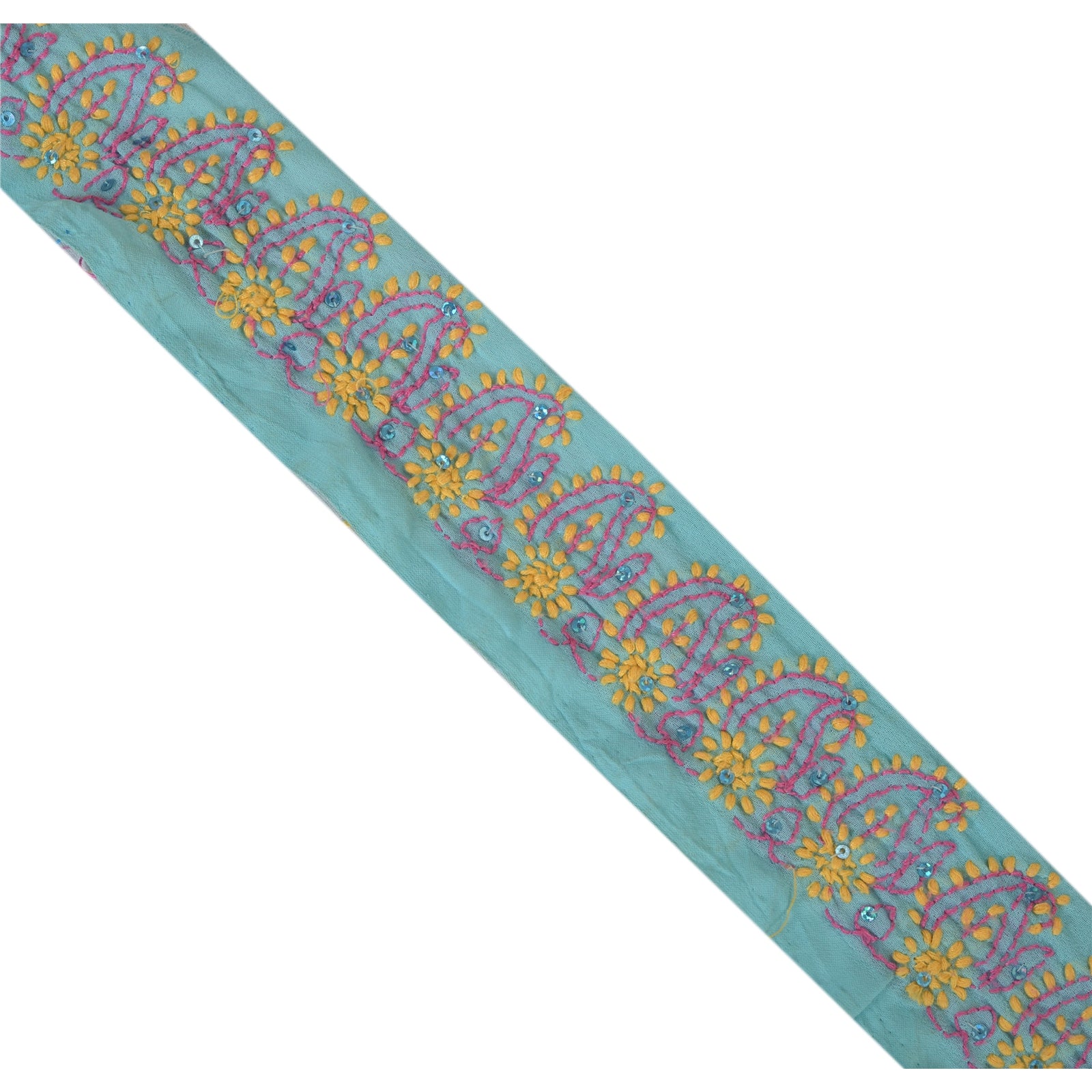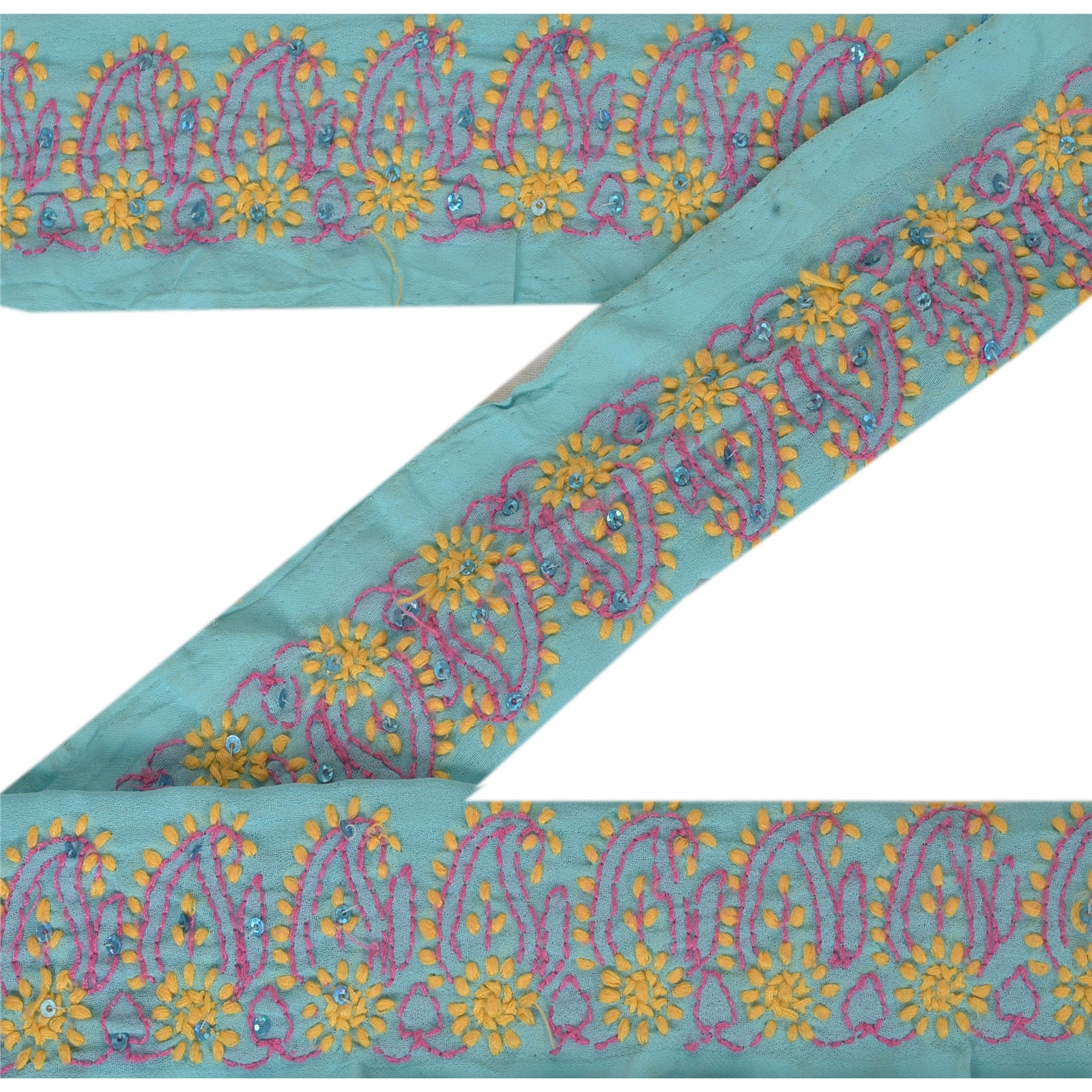THE ITEM COLOR OR SHADE MAY BE DARKER OR LIGHTER THAN THE PICTURE.' Fabulous georgette hand beaded Chikankari sari border in blue color highlighting thread work. Border has beautiful floral & paisley patterns painstakingly hand beaded with pink, yellow thread work. Further you can see fine detailing with blue sequins work. WOW!! an awesome one of a kind versatile border. 1 Quantity = 1 Yard International buyers please note: Import duties, taxes, and charges are not included in the item price or postage cost. These charges are the buyer's responsibility. Please check with your country's customs office to determine what these additional costs will be prior to bidding or buying.Buyer will pay custom duty/tax. It is calculated and charged differently by every country. As a seller I do not have any control over it. VAT or sales tax is calculated by the platform at the time of checkout. Customs charge is payable at the time of delivery. B-12738