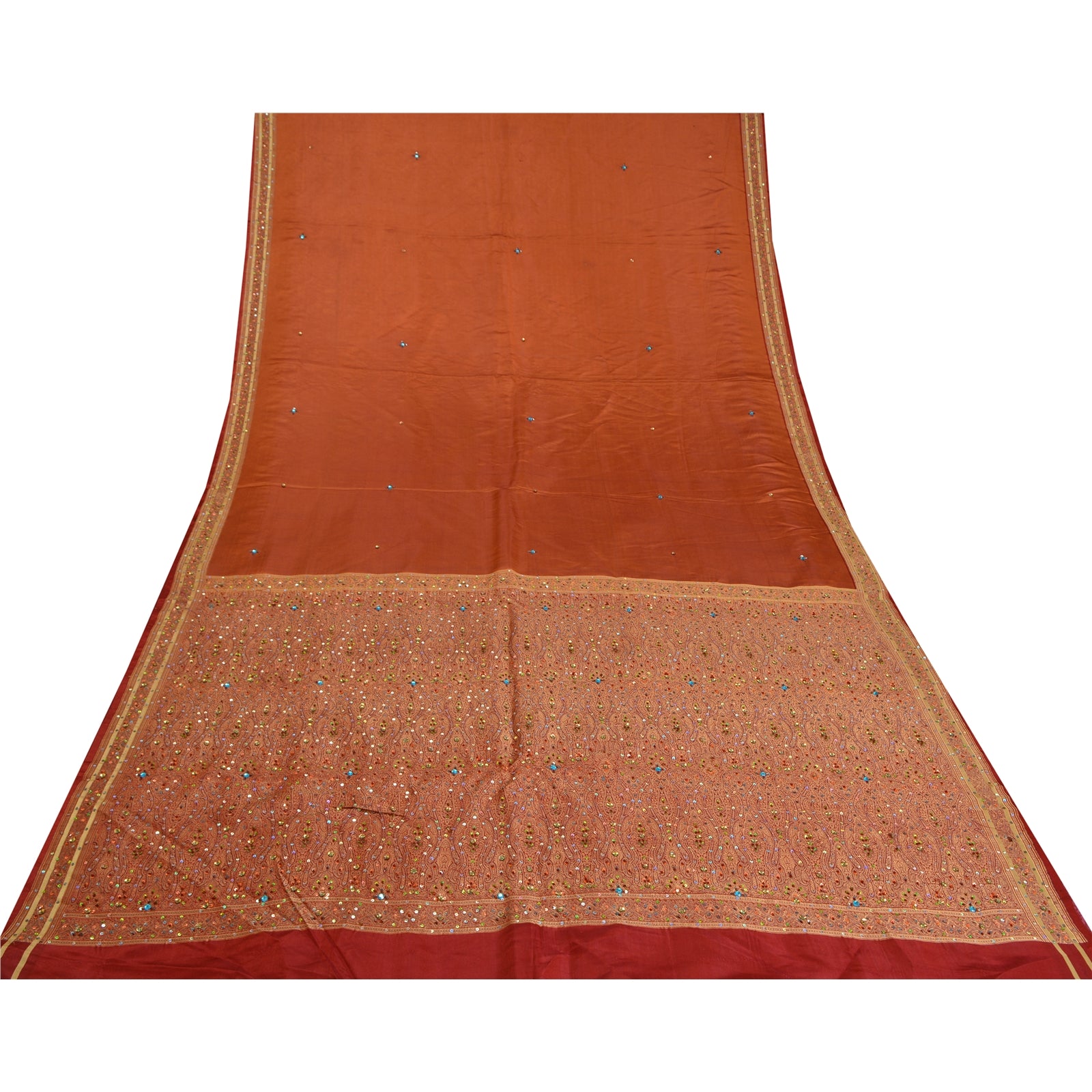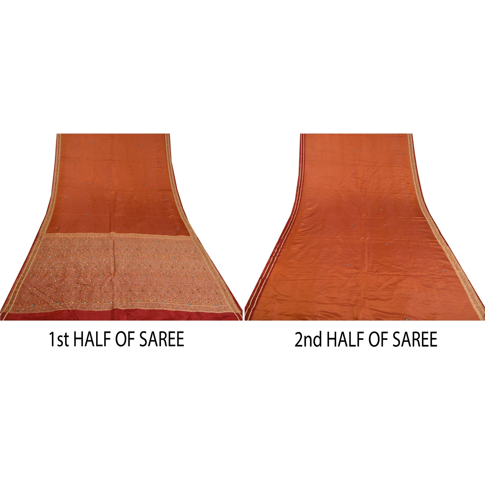 Sanskriti Vintage Copper/Red Sarees Pure Satin Silk Beaded Tanchoi Sari Sustainable Fabric