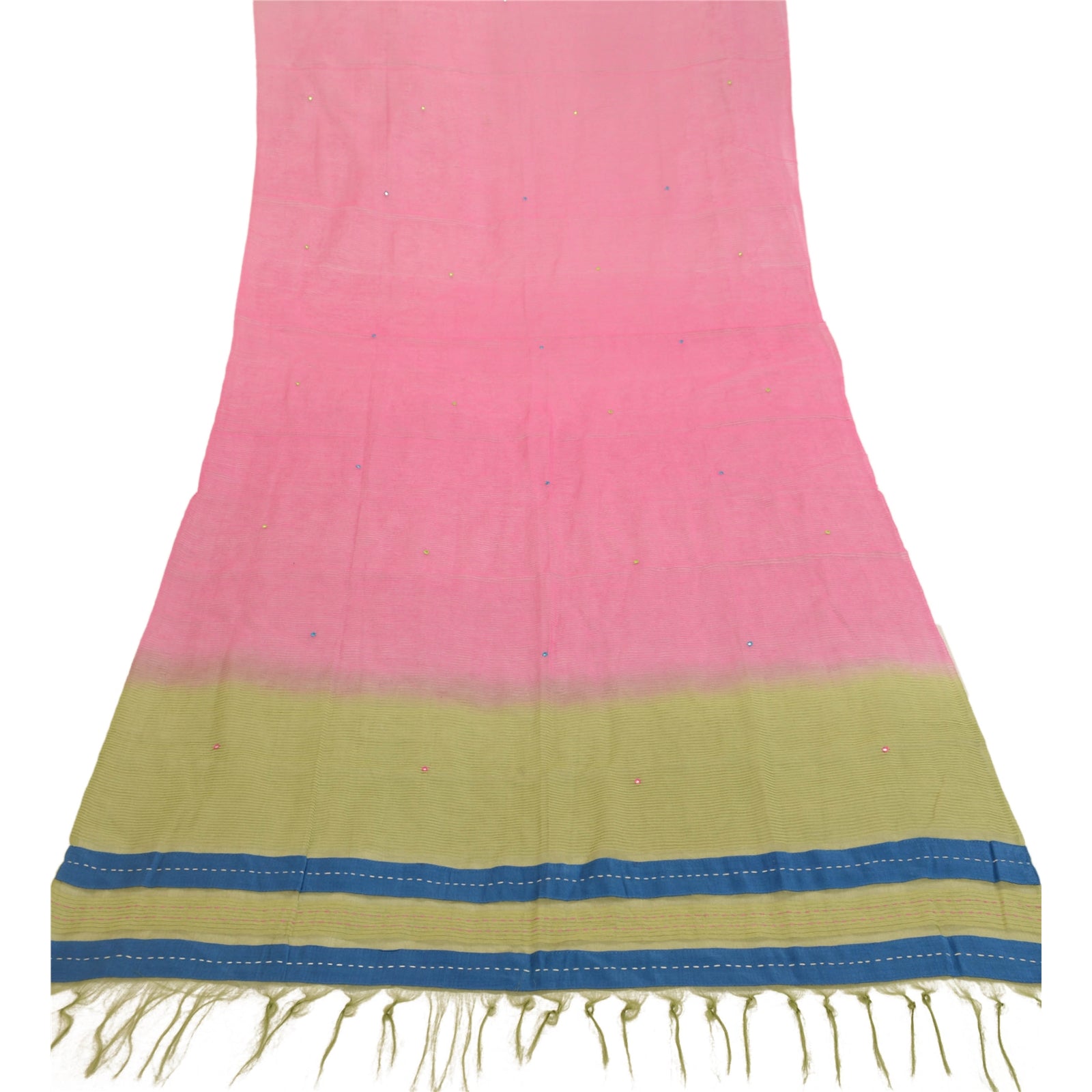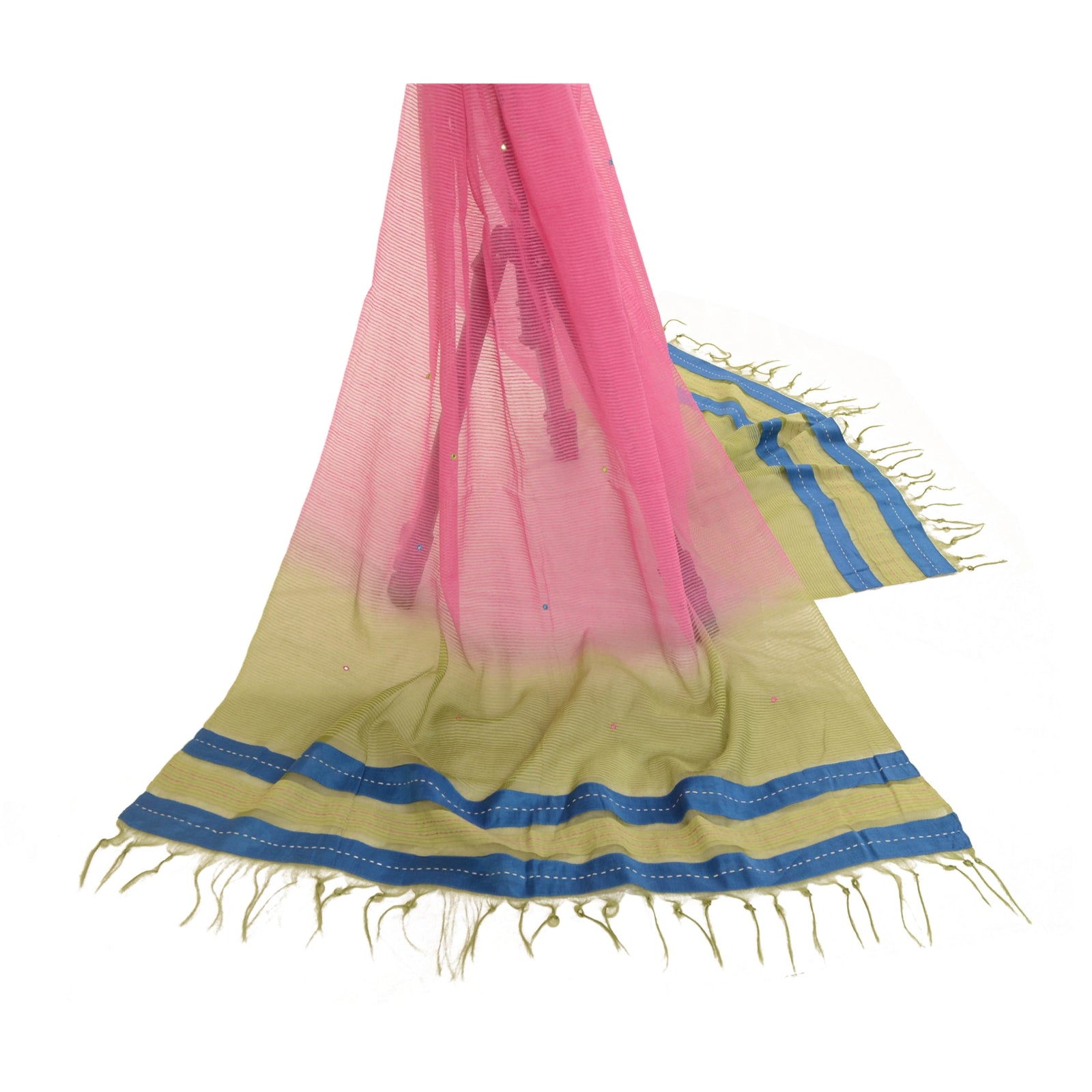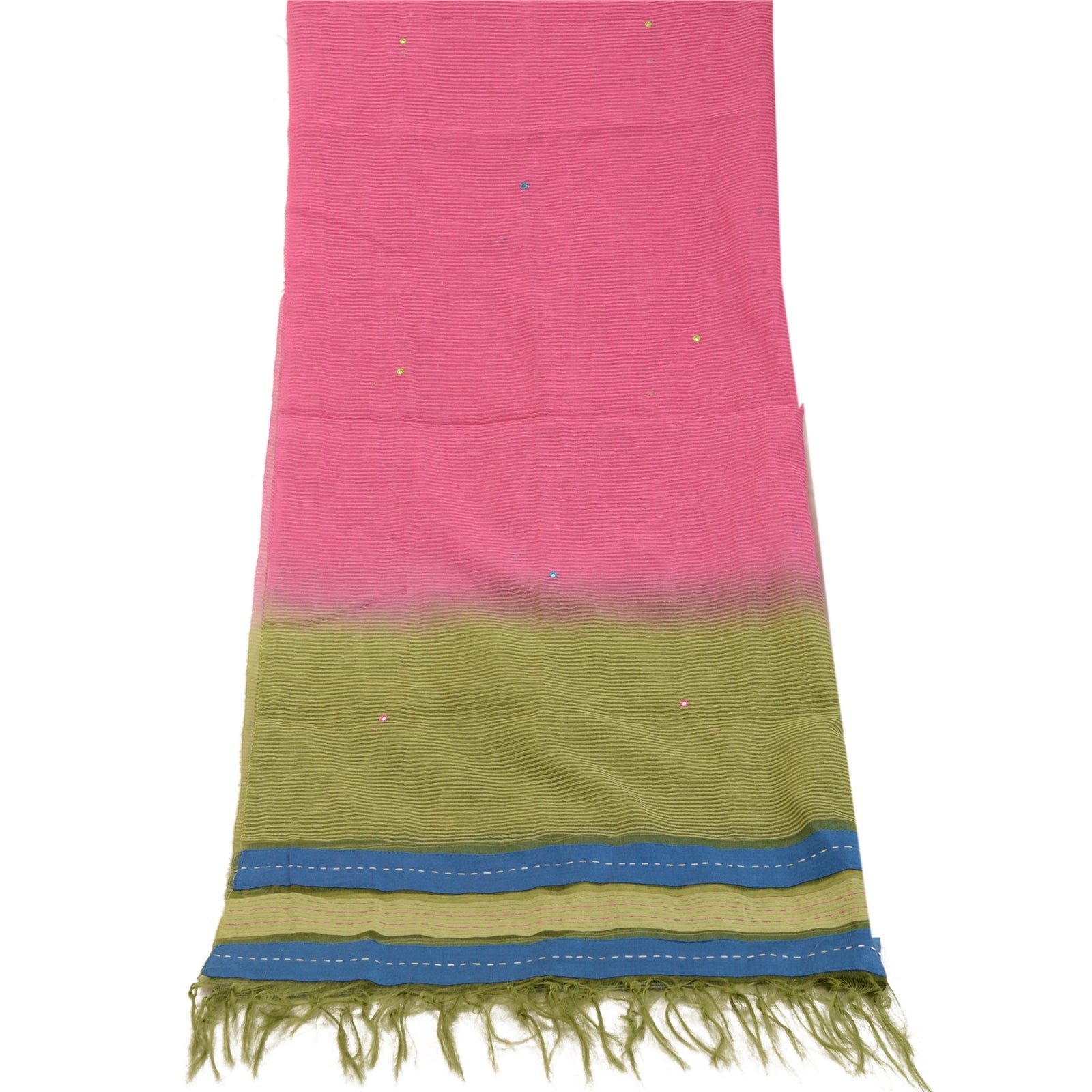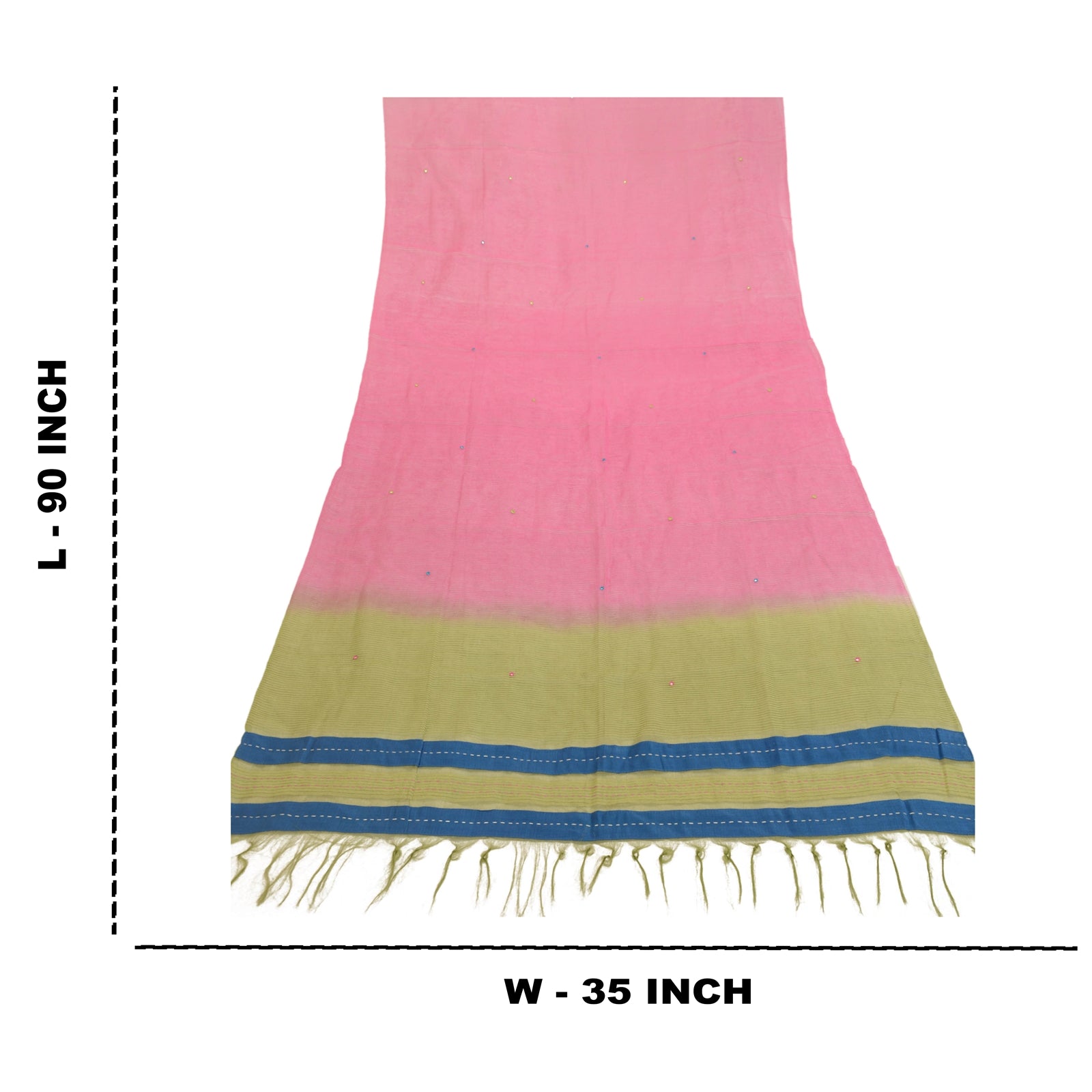 Elegant pink & green colored art (artificial) silk hand embroidered woven long scarf/dupatta. Center portion of the dupatta woven & mirror work. Border has blue Sustainable Fabric patch work & thread work is really enhancing beauty of the dupatta/stole. Dupatta has matching fringes on both ends of borders. This dupatta/stole can be used for various crafting ideas too. Use it for dress designing, as a throw, as window dressing, upholstery, table linen and much more. Let your creative juices flow.