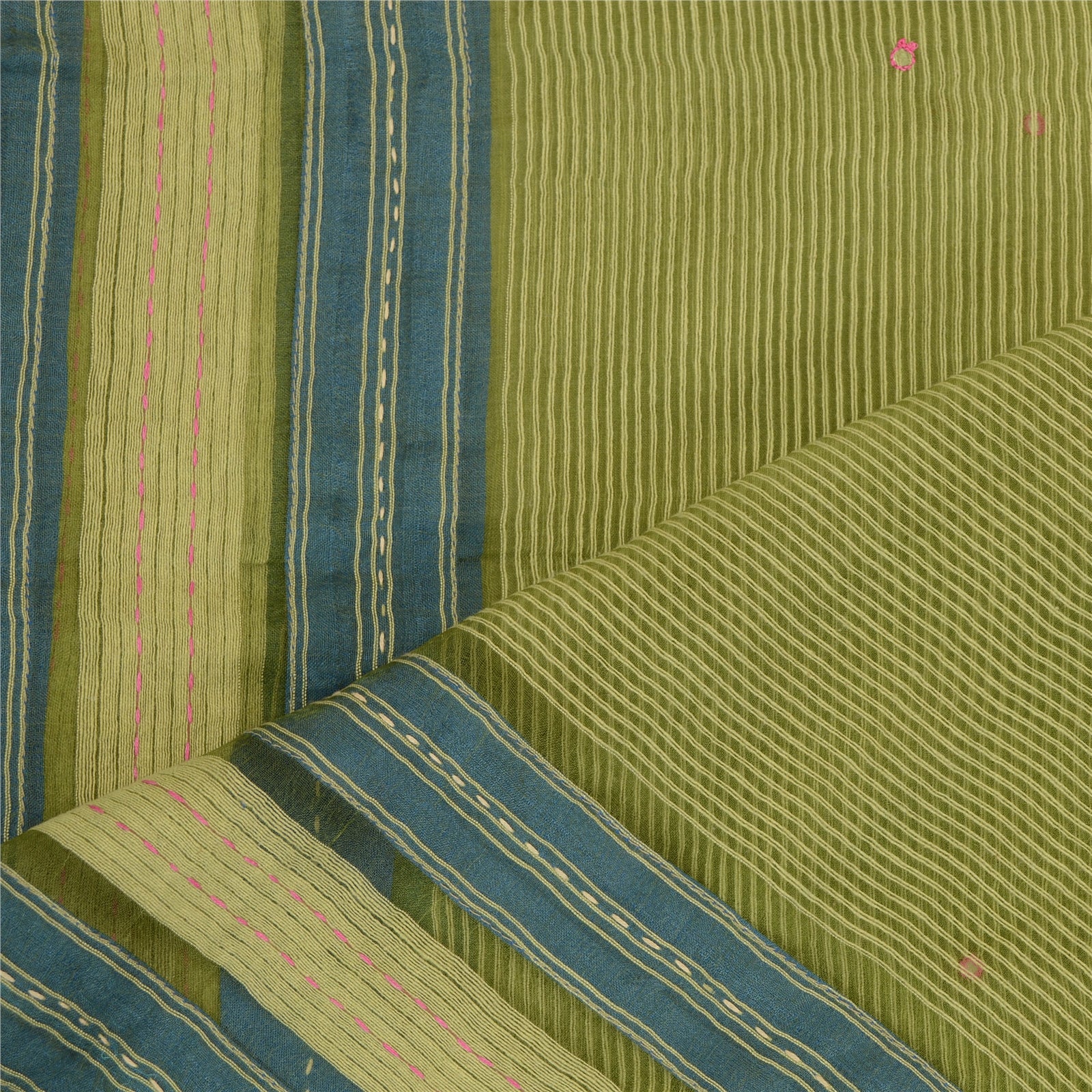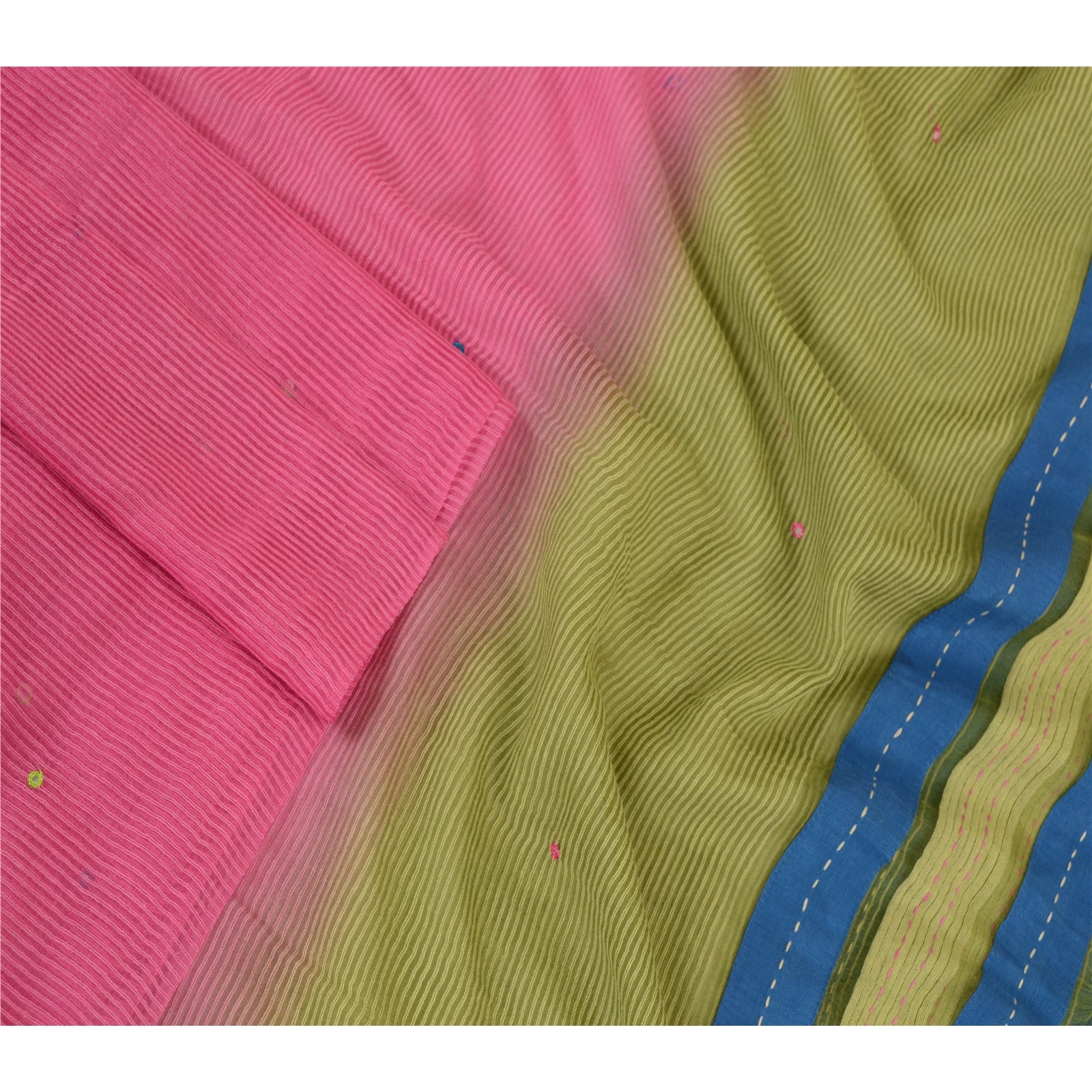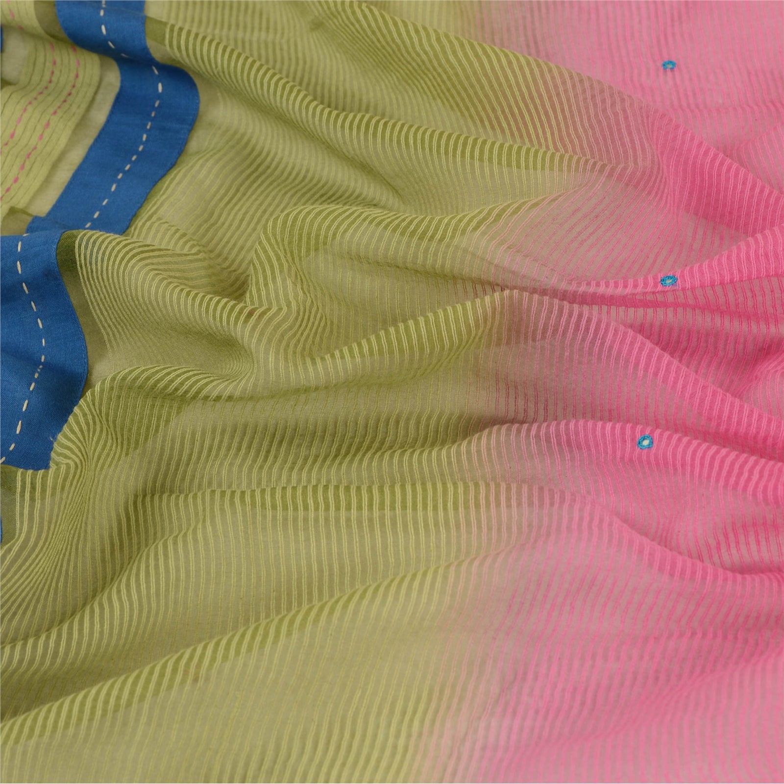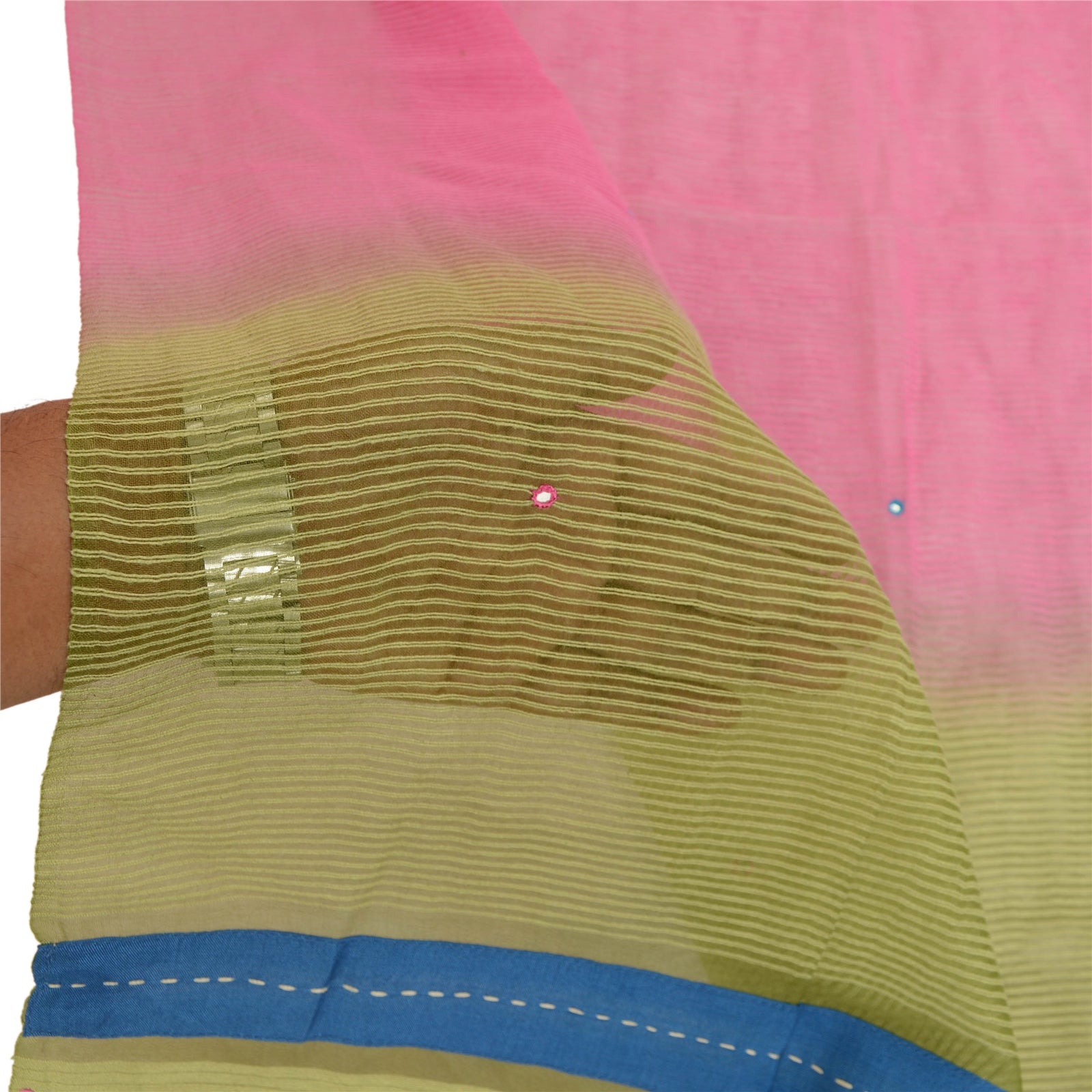 Elegant pink & green colored art (artificial) silk hand embroidered woven long scarf/dupatta. Center portion of the dupatta woven & mirror work. Border has blue Sustainable Fabric patch work & thread work is really enhancing beauty of the dupatta/stole. Dupatta has matching fringes on both ends of borders. This dupatta/stole can be used for various crafting ideas too. Use it for dress designing, as a throw, as window dressing, upholstery, table linen and much more. Let your creative juices flow.