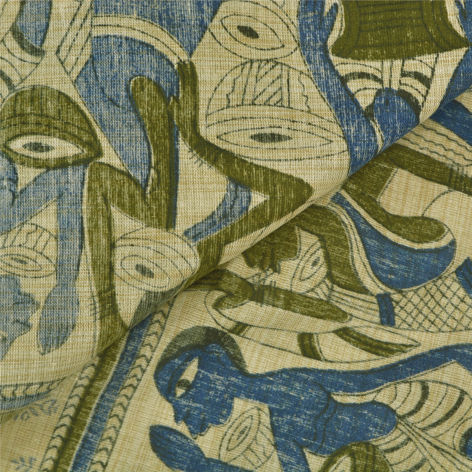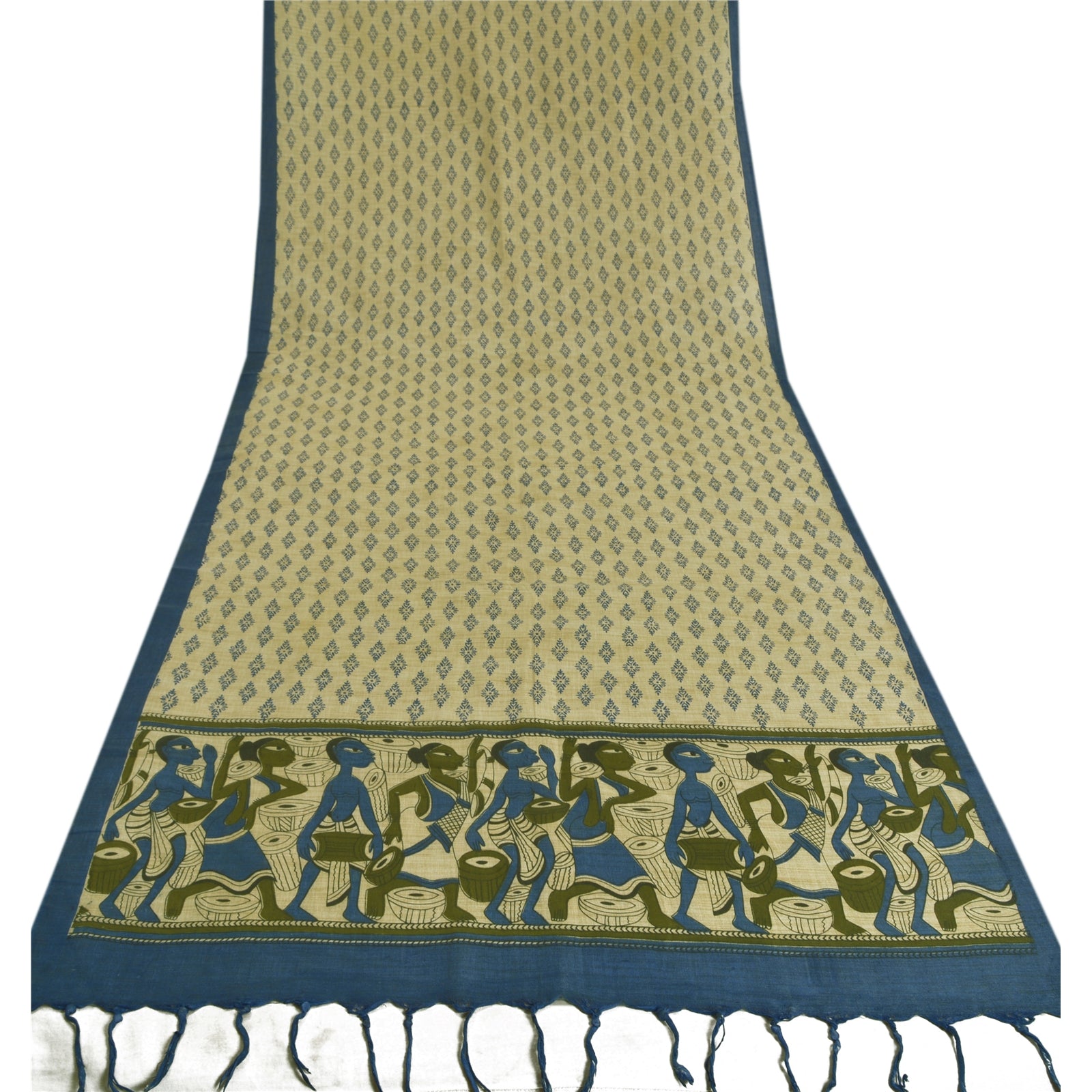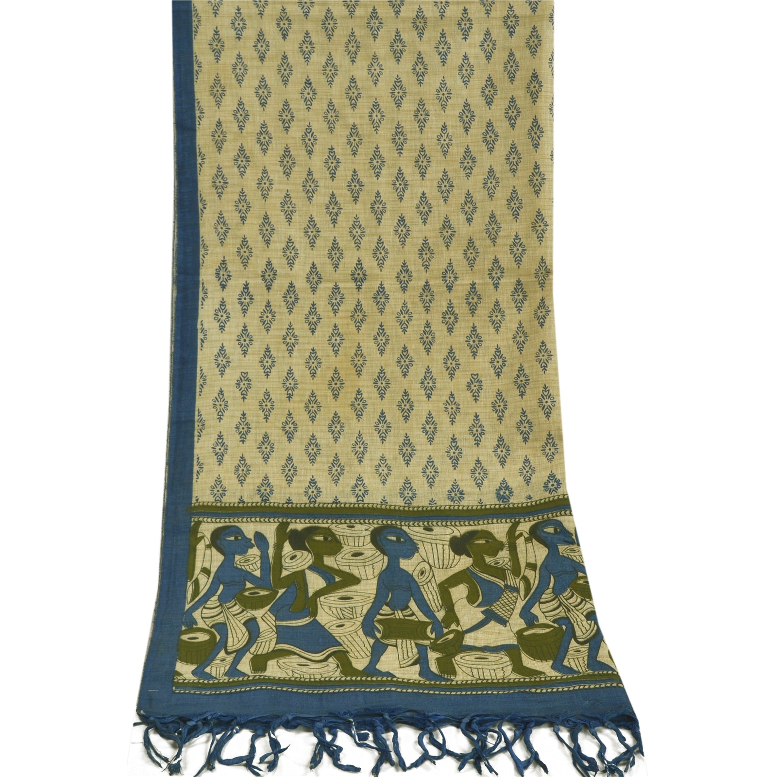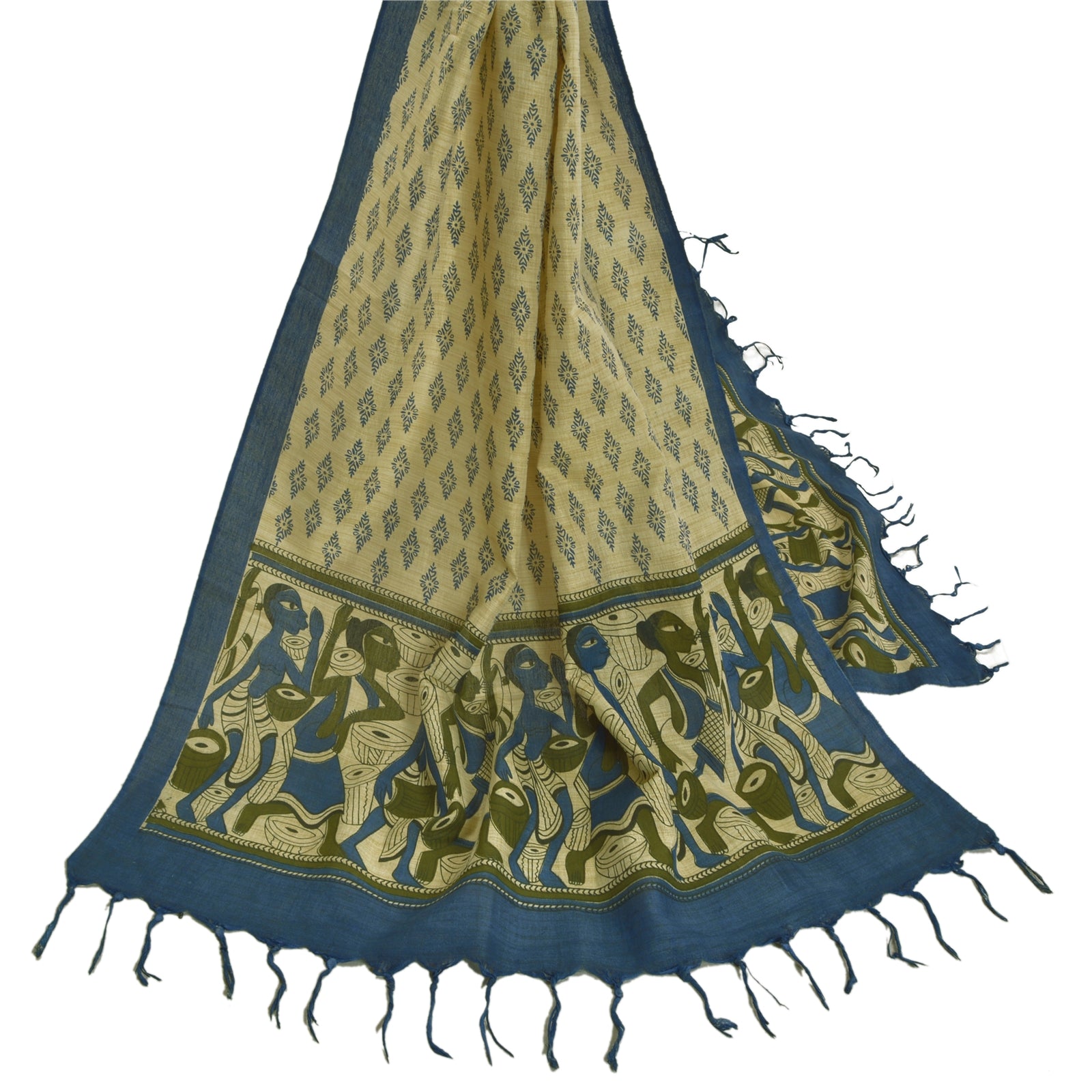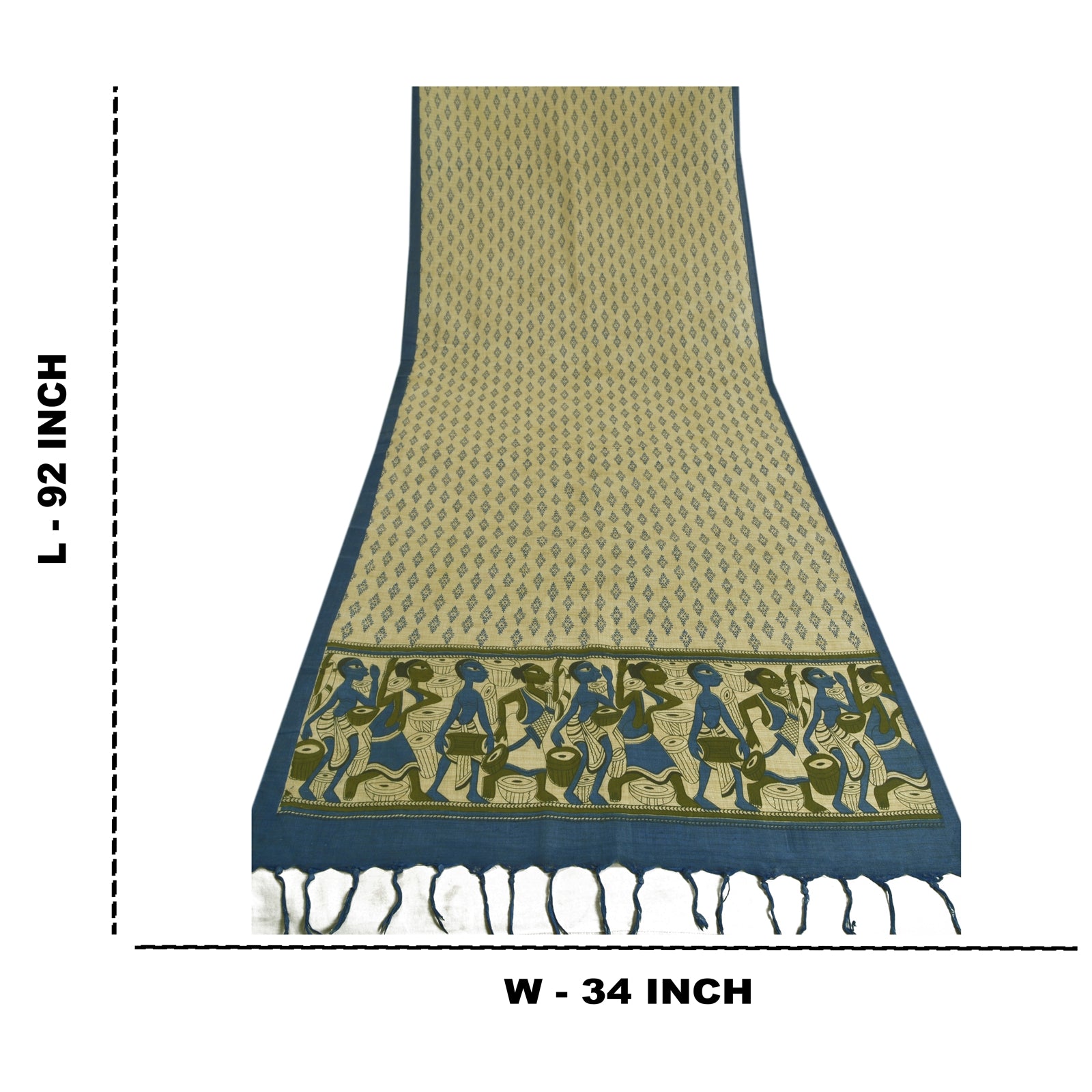 Beautiful ivory & blue colored 100% pure cotton block printed long scarf/dupatta. Center portion of the dupatta block printed floral motifs. Border has printed human pattern is really enhancing beauty of the dupatta/stole. Dupatta has matching fringes on both ends of borders. This dupatta/stole can be used for various crafting ideas too. Use it for dress designing, as a throw, as window dressing, upholstery, table linen and much more. Let your creative juices flow.