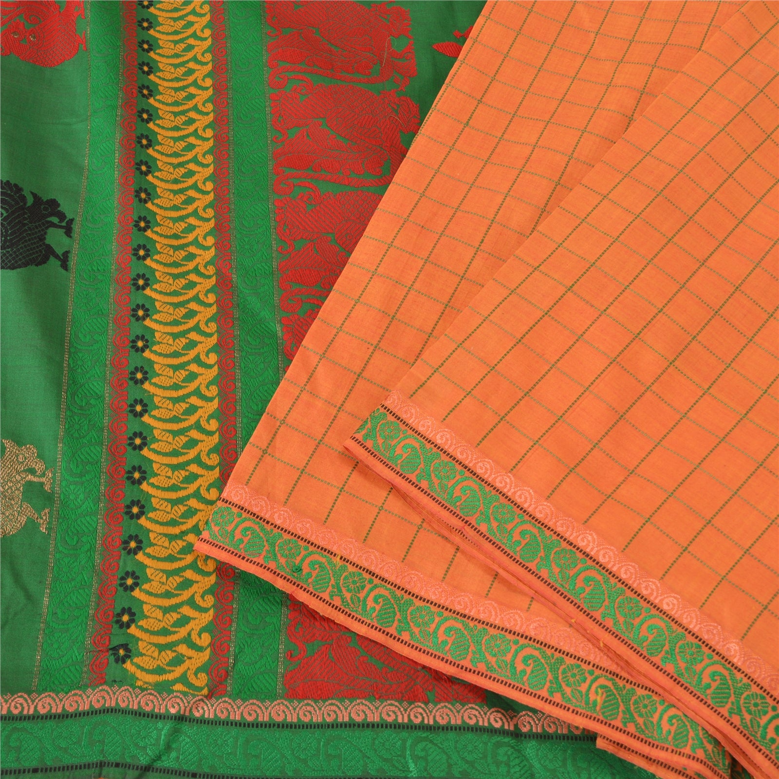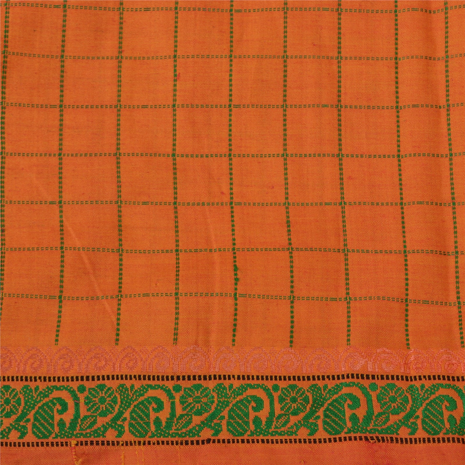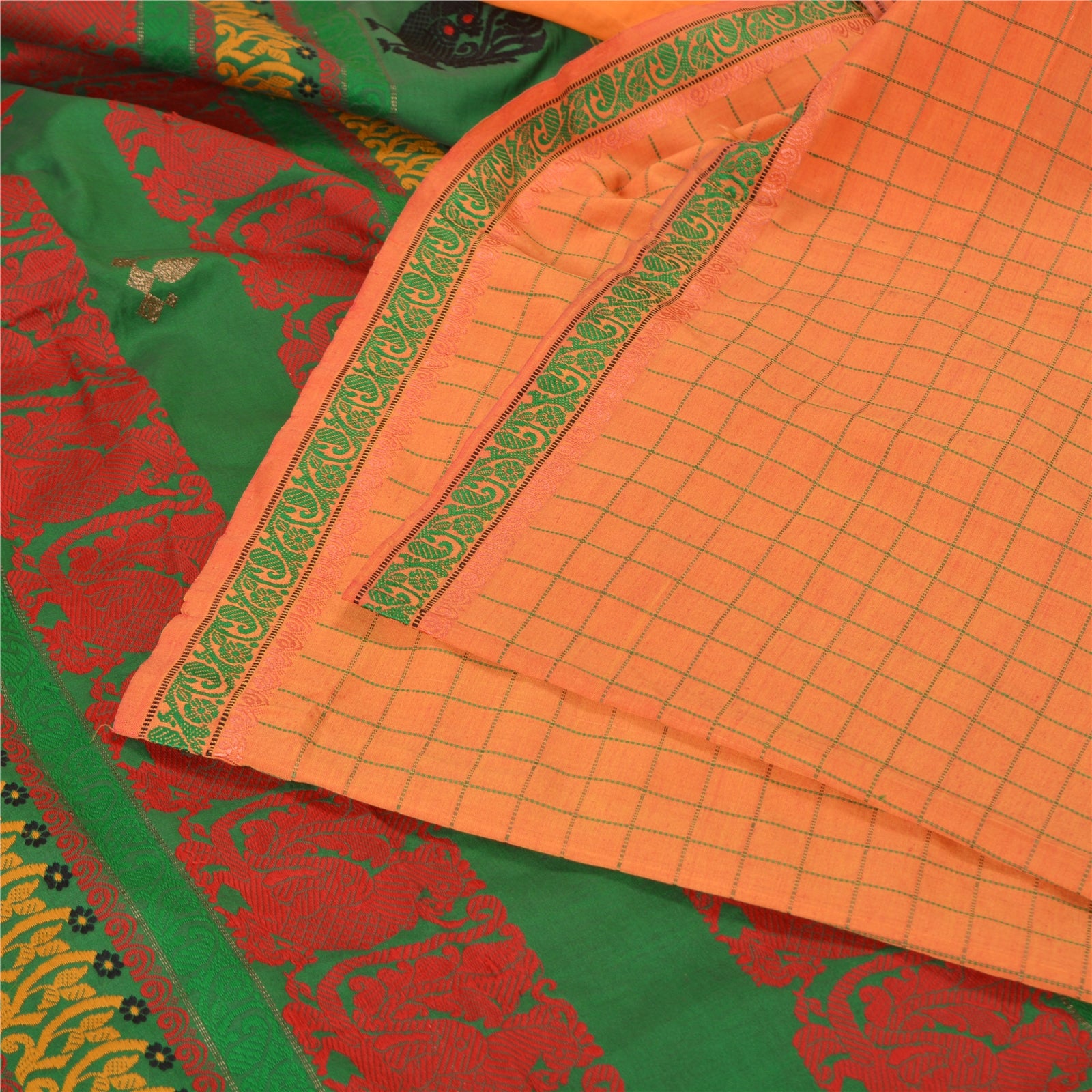 'THE ITEM COLOR OR SHADE MAY BE DARKER OR LIGHTER THAN THE PICTURE.' Beautiful Green & Orange Colored Blend Silk Woven Sari/Sustainable Fabric. Pallu & Border has multi color woven thread work with amazing floral & peacock design. Also you can see lovely zari pattern. The center of the saree has similar woven grid design. As the item is Vintage, some minor stains and defects are expected. This saree can be used for various crafting ideas too. Use it for dress designing, as a throw, as window dressing, upholstery, table linen and much more. Let your creative juices flow. 'International buyers please note: Import duties, taxes, and charges are not included in the item price or postage cost. These charges are the buyer's responsibility. Please check with your country's customs office to determine what these additional costs will be prior to bidding or buying. Buyer will pay custom duty/tax. It is calculated and charged differently by every country. As a seller I do not have any control over it. VAT or sales tax is calculated by the platform at the time of checkout. Customs charge is payable at the time of delivery.'
