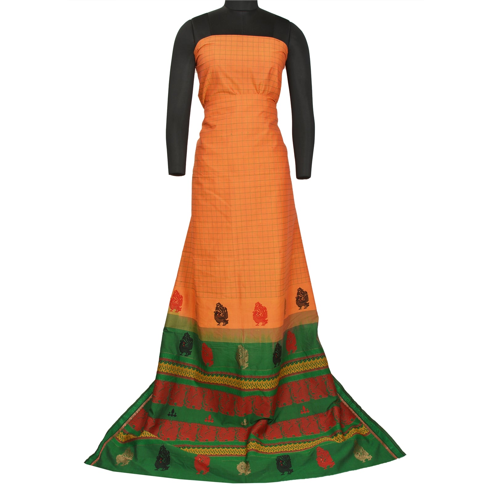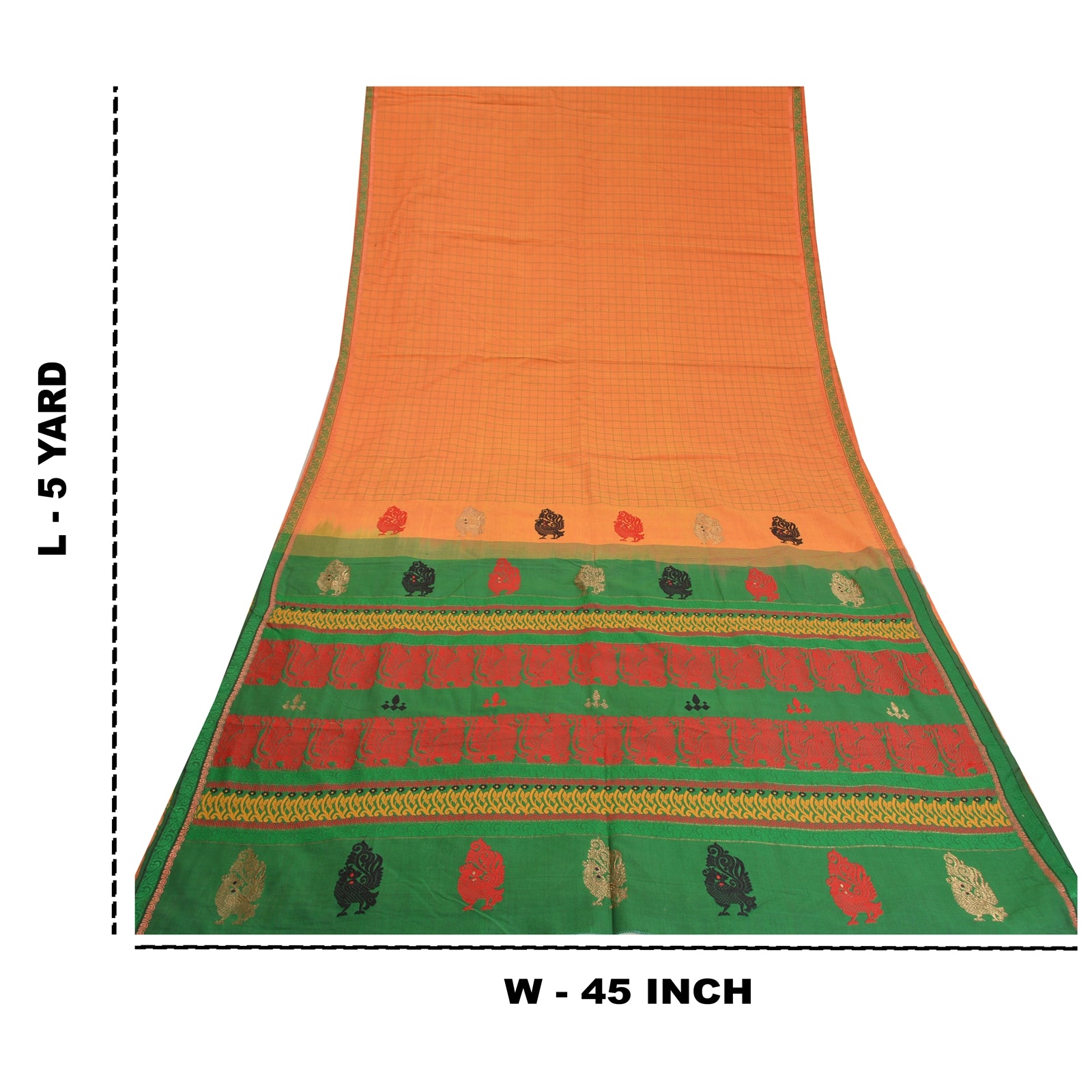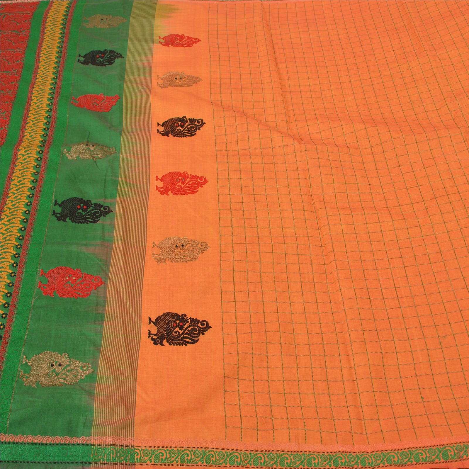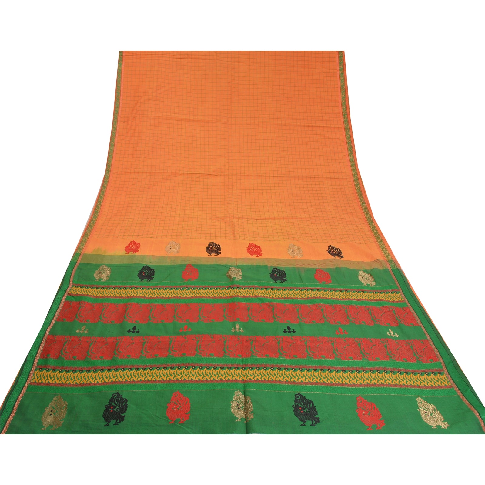 'THE ITEM COLOR OR SHADE MAY BE DARKER OR LIGHTER THAN THE PICTURE.' Beautiful Green & Orange Colored Blend Silk Woven Sari/Sustainable Fabric. Pallu & Border has multi color woven thread work with amazing floral & peacock design. Also you can see lovely zari pattern. The center of the saree has similar woven grid design. As the item is Vintage, some minor stains and defects are expected. This saree can be used for various crafting ideas too. Use it for dress designing, as a throw, as window dressing, upholstery, table linen and much more. Let your creative juices flow. 'International buyers please note: Import duties, taxes, and charges are not included in the item price or postage cost. These charges are the buyer's responsibility. Please check with your country's customs office to determine what these additional costs will be prior to bidding or buying. Buyer will pay custom duty/tax. It is calculated and charged differently by every country. As a seller I do not have any control over it. VAT or sales tax is calculated by the platform at the time of checkout. Customs charge is payable at the time of delivery.'
