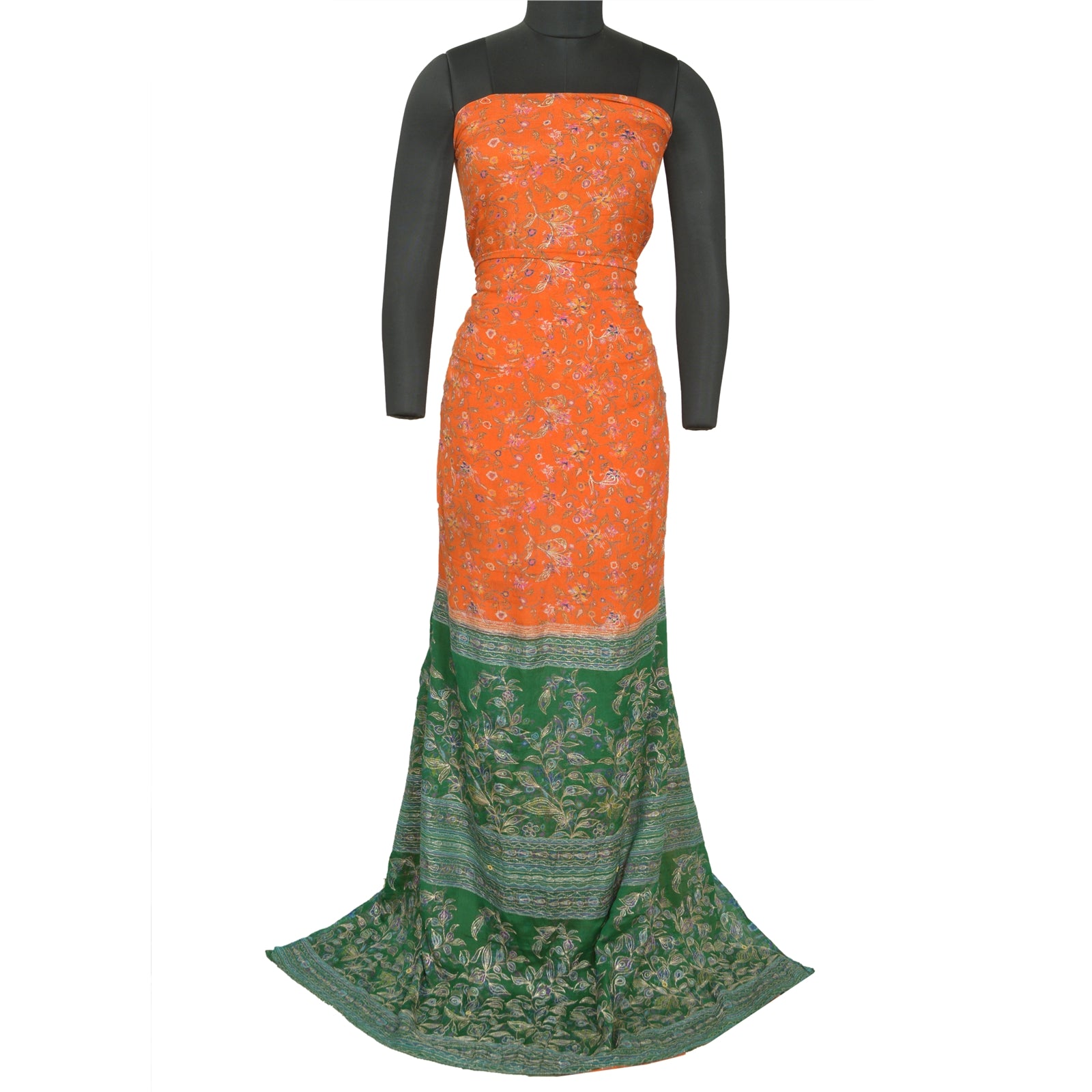 'THE ITEM COLOR OR SHADE MAY BE DARKER OR LIGHTER THAN THE PICTURE.' Beautiful green & orange colored pure silk hand embroidered printed sari. Pallu & border features printed floral design embroidered golden zari work, shining sequins work. The center of the saree has printed floral design with zari work. This saree can be used for various crafting ideas too. Use it for dress designing, as a throw, as window dressing, upholstery, table linen and much more. Let your creative juices flow. 'International buyers please note: Import duties, taxes, and charges are not included in the item price or postage cost. These charges are the buyer's responsibility. Please check with your country's customs office to determine what these additional costs will be prior to bidding or buying. Buyer will pay custom duty/tax. It is calculated and charged differently by every country. As a seller I do not have any control over it. VAT or sales tax is calculated by the platform at the time of checkout. Customs charge is payable at the time of delivery.'