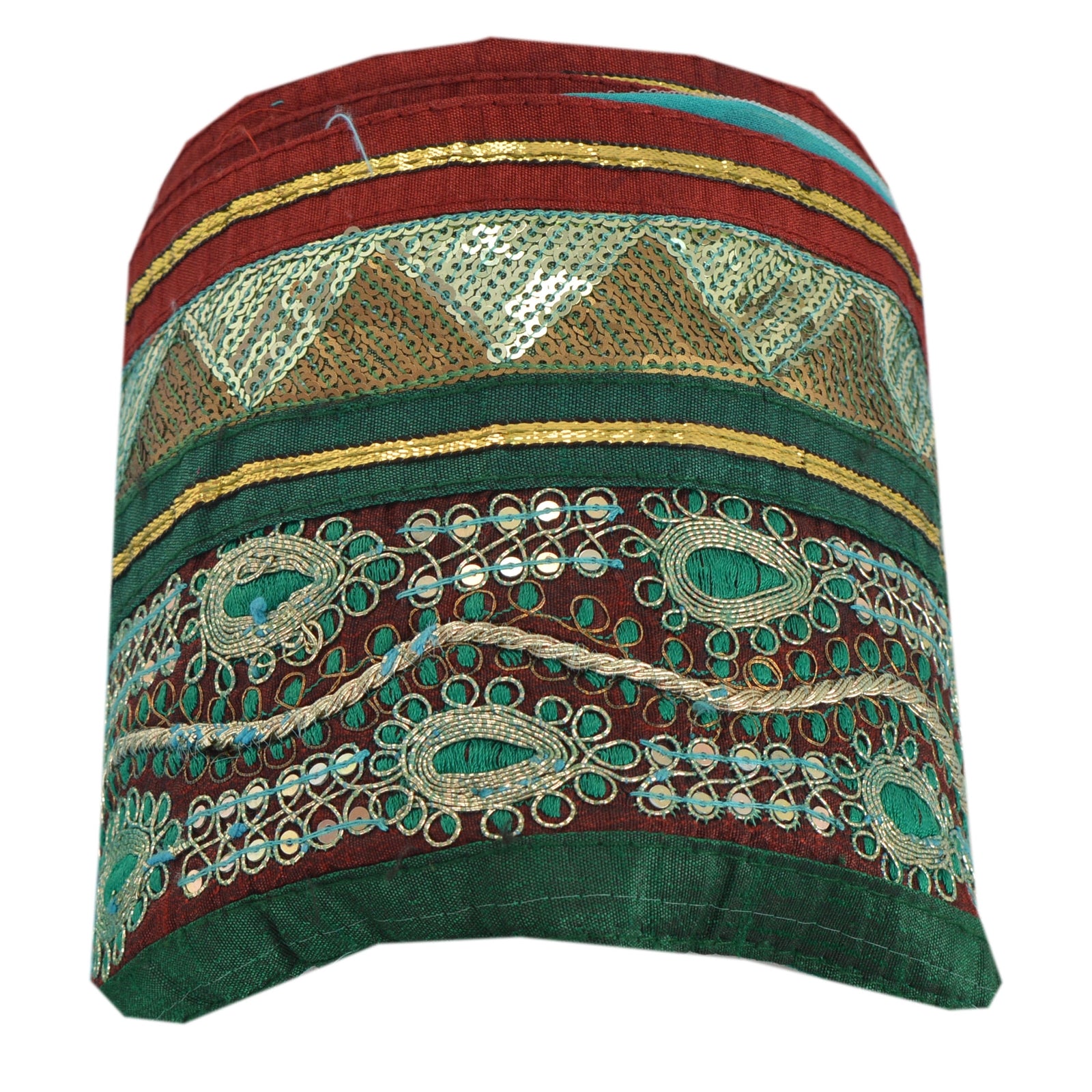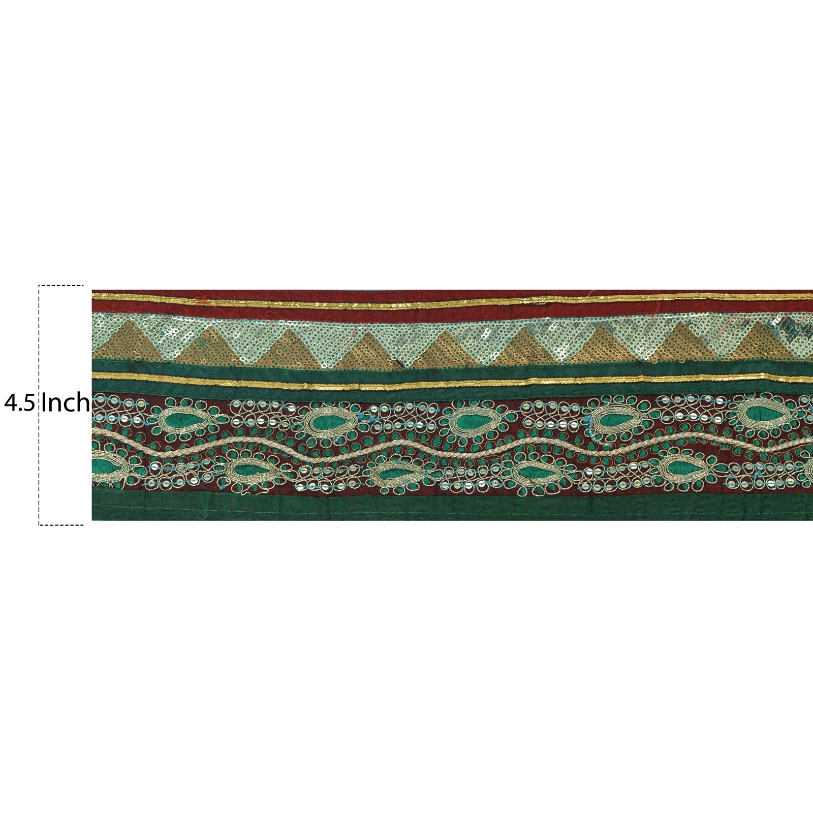 Fabulous art silk embroidered sari border in green color highlighting sequins work. Border has beautiful floral patterns painstakingly embroidered with gold dori work, silver/gold sequins work. Further you can see fine detailing with gold gota, maroon/green Sustainable Fabric patch work. WOW!! an awesome one of a kind versatile border. 1 Quantity = 1 Yard