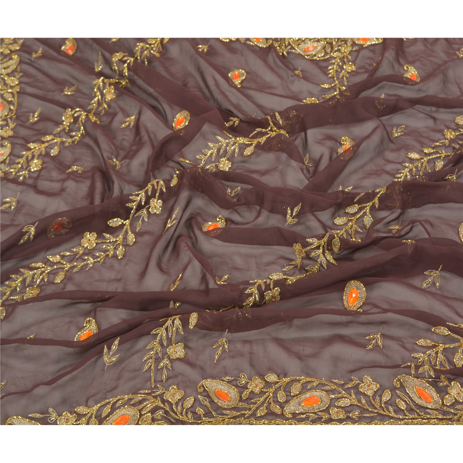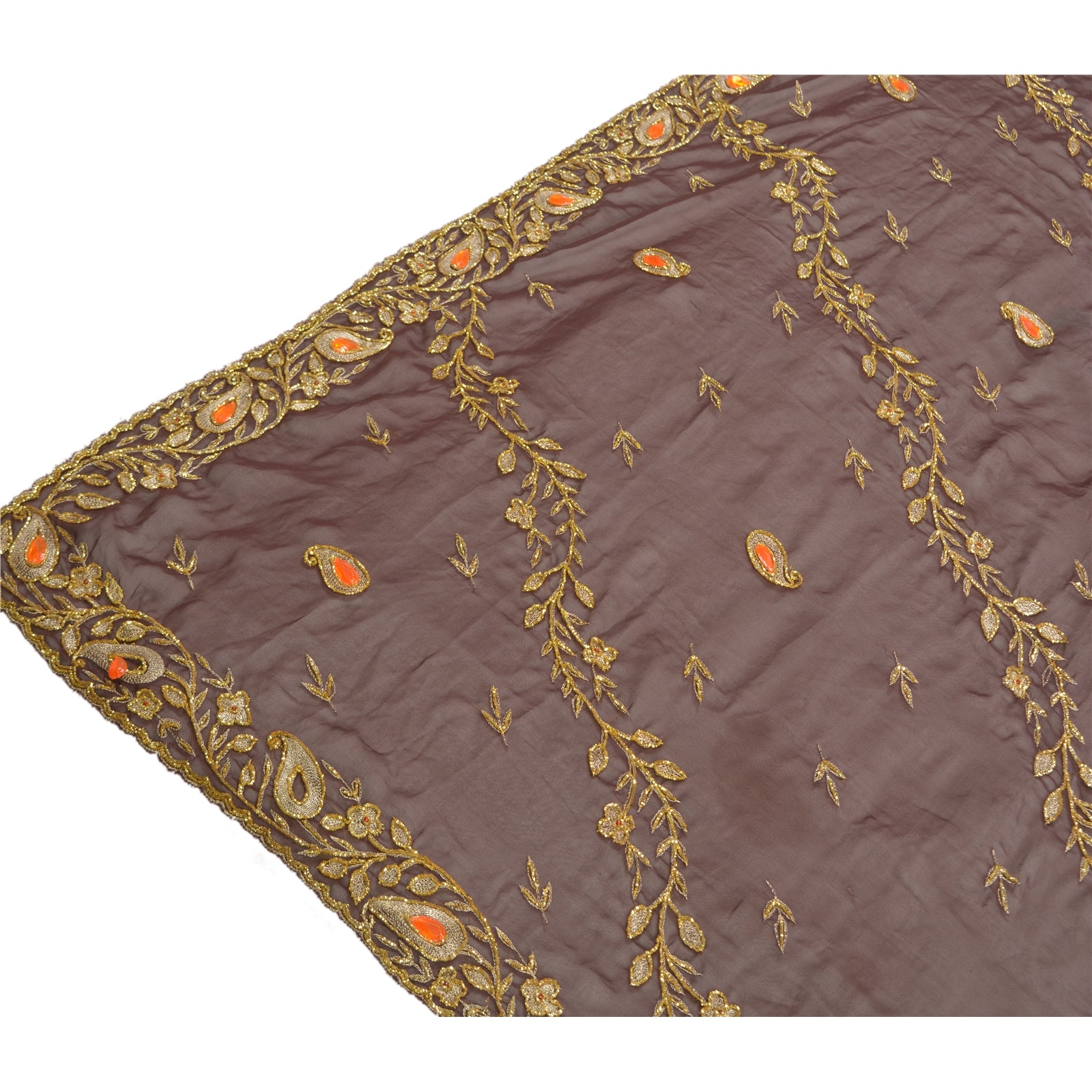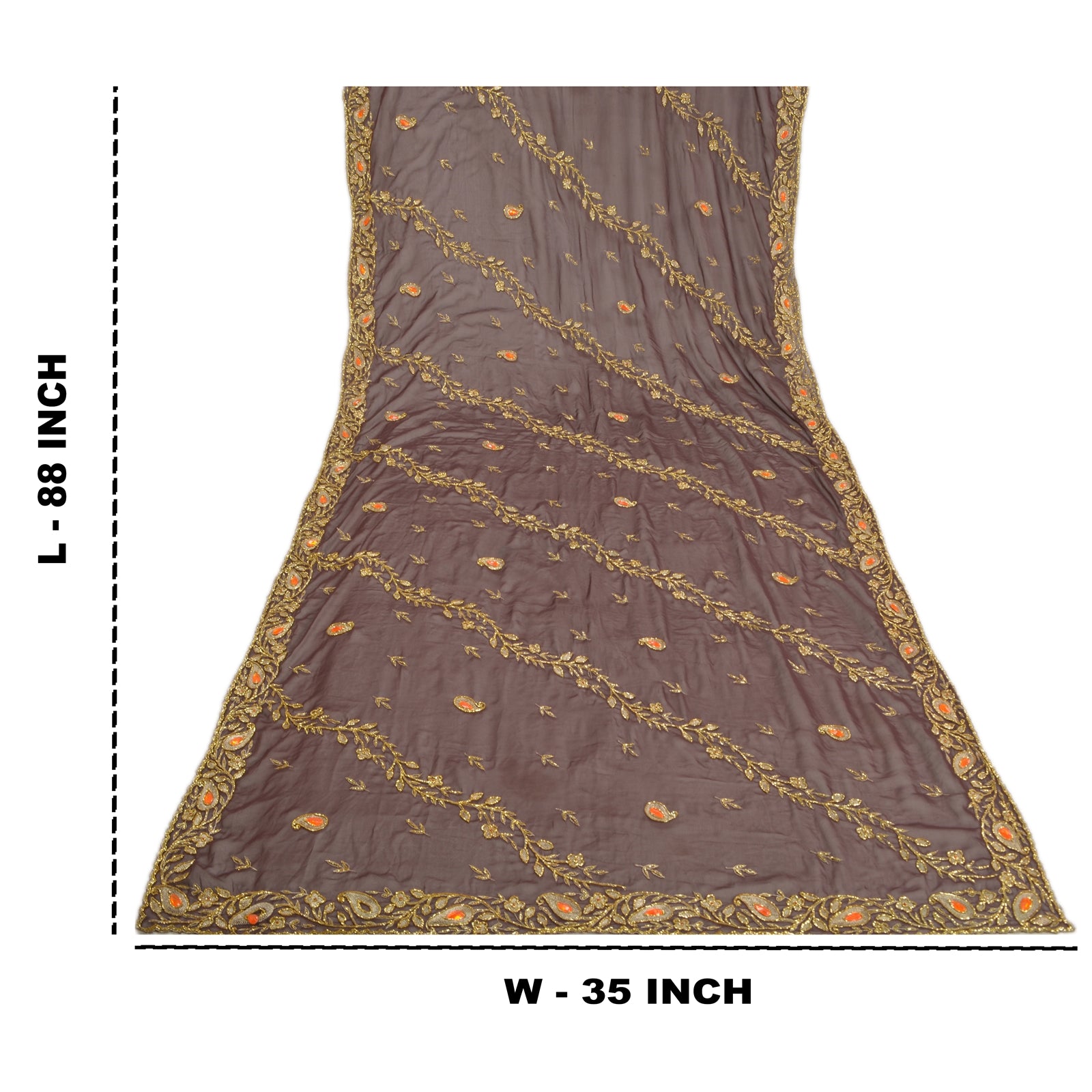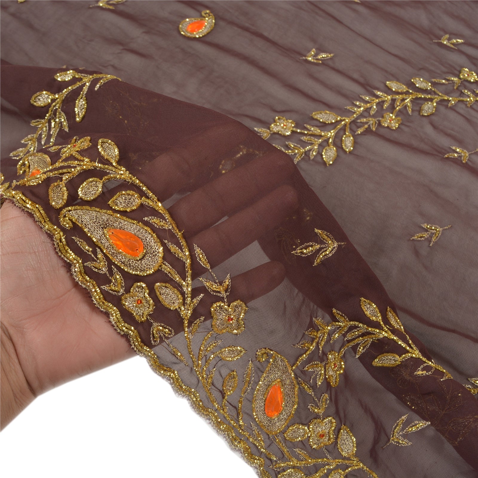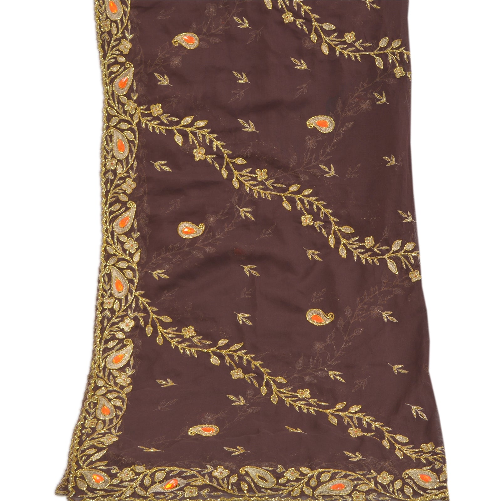 One Of A Kind Item. Stunning Very Heavy Dupatta 100% Pure Chiffon Silk Hand Embroidered Dupatta/Stole In Shade Of Brown Color Sustainable Fabric. The center part of the dupatta has floral & paisley design with dabka work. Border feature is floral & paisley design embellished with metallic golden zari/dabka work, red glass beads, orange rhinestones work is main highlight of the dupatta. Rhinestone work is giving a fabulous look to the dupatta. Awesome one !!! For USA buyers - Single item ships via registered air mail, buy 1 more to get FedEx.