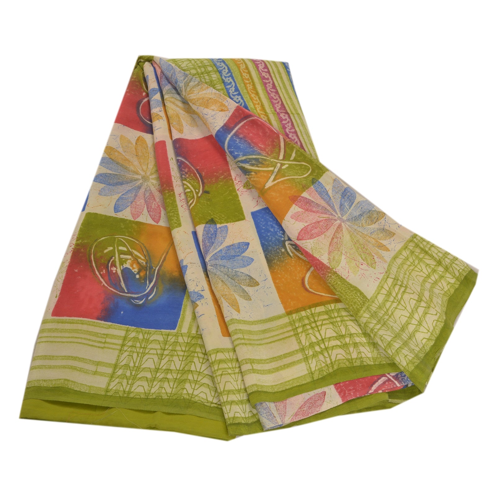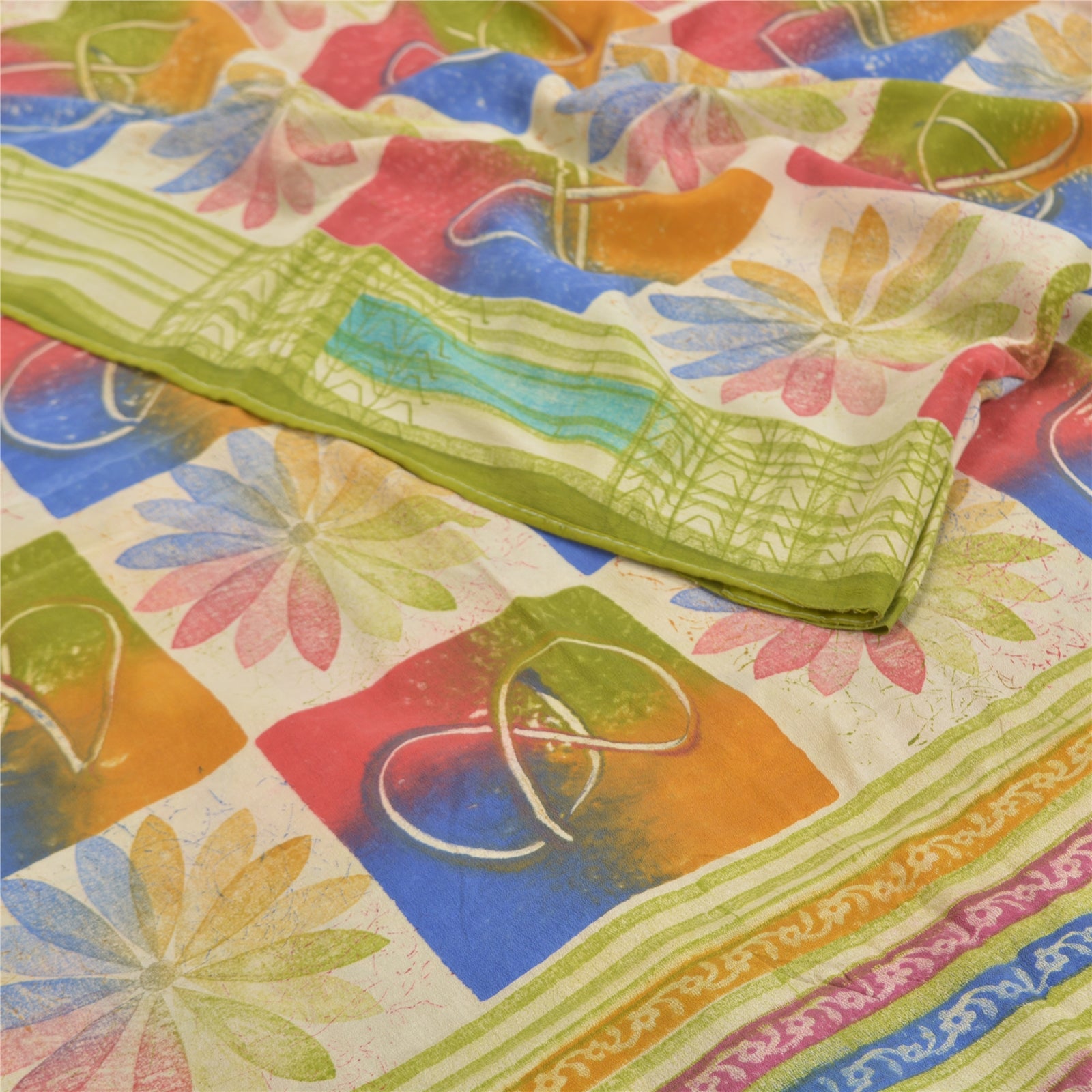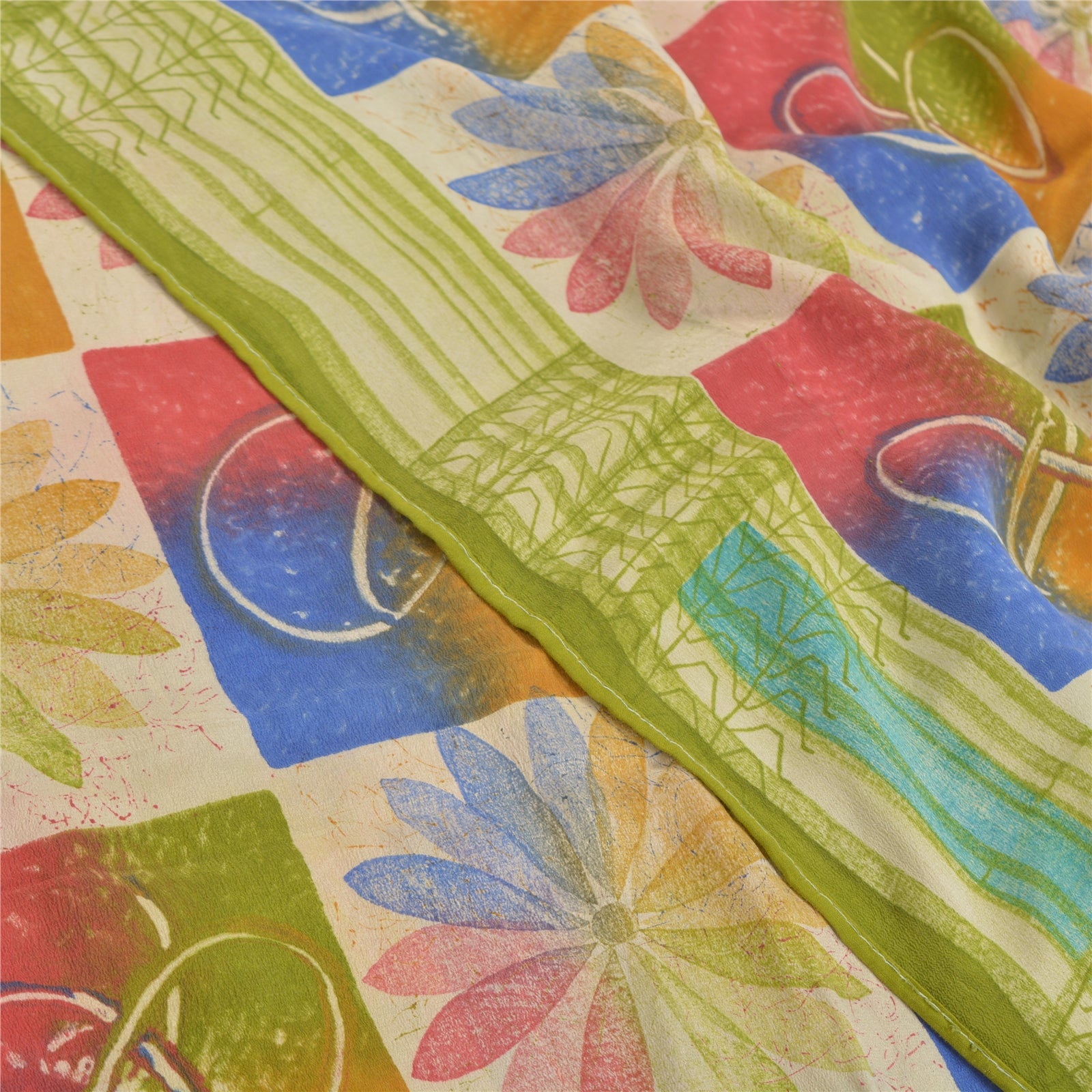 Beautiful Multi Color Colored Saree 100% Pure Crepe Silk Printed Base Sustainable Fabric Pallu & Border has printed floral design. Center part of the sari has printed floral design. This unique vintage saree can be used for various crafting ideas even if you don't want to use it as a sari. Design a dress, use it as a throw, as window dressing, upholstery, sarongs, table linen and much more. Let your creative juices flow and use this decorated Sustainable Fabric in multiple fashion. As the item is vintage some mild stains are visible.