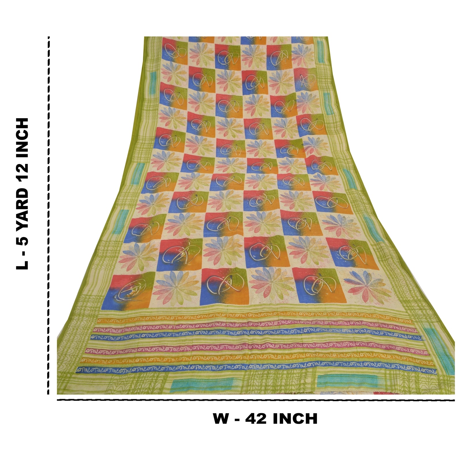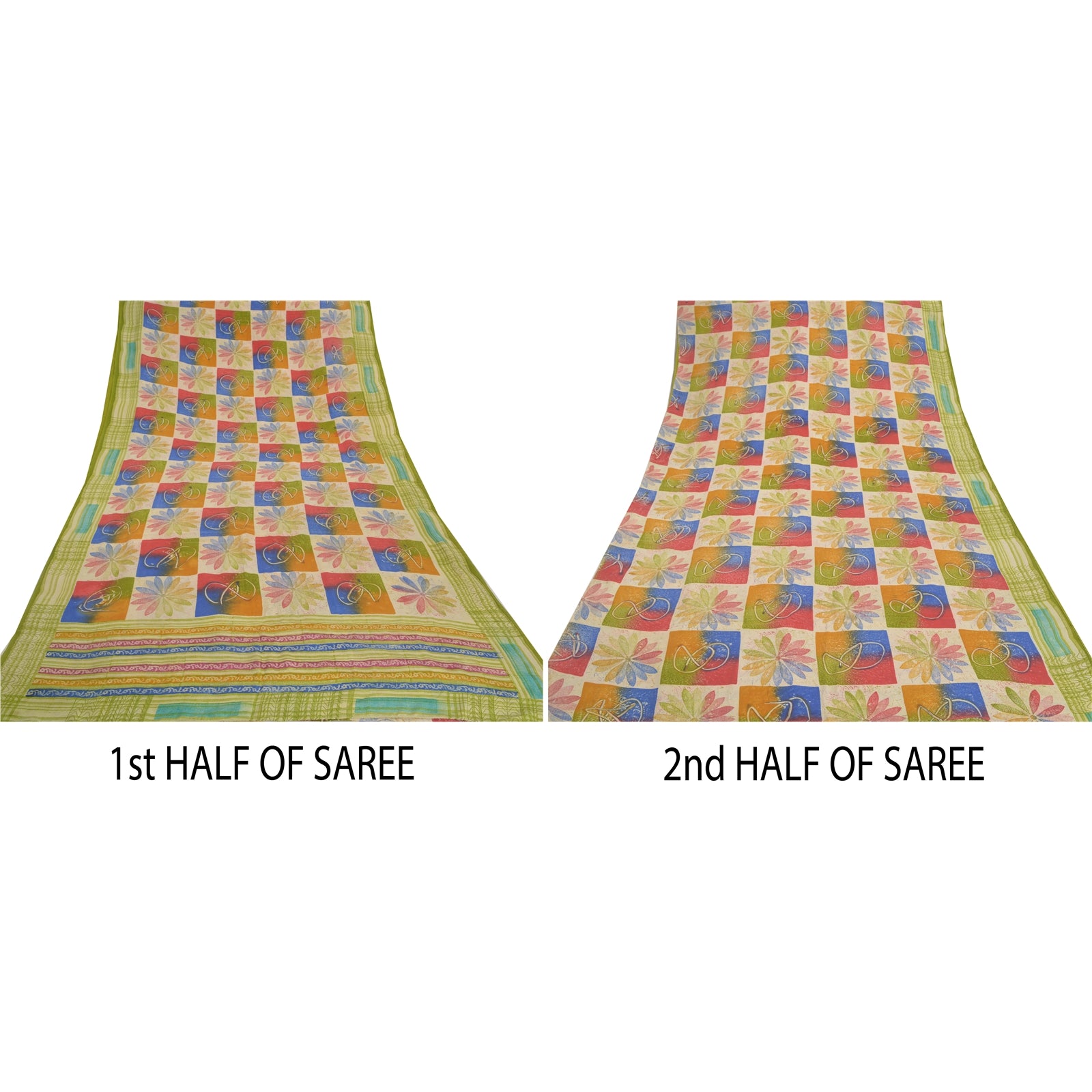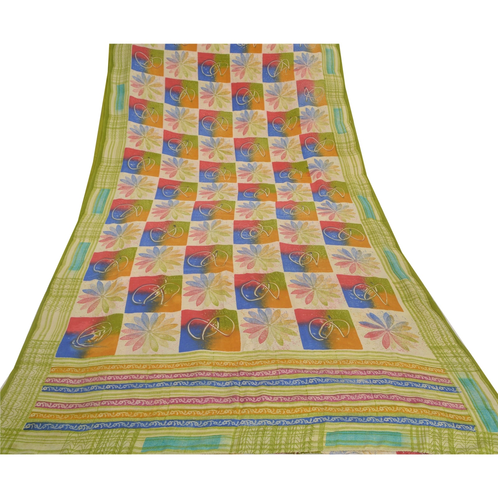 Beautiful Multi Color Colored Saree 100% Pure Crepe Silk Printed Base Sustainable Fabric Pallu & Border has printed floral design. Center part of the sari has printed floral design. This unique vintage saree can be used for various crafting ideas even if you don't want to use it as a sari. Design a dress, use it as a throw, as window dressing, upholstery, sarongs, table linen and much more. Let your creative juices flow and use this decorated Sustainable Fabric in multiple fashion. As the item is vintage some mild stains are visible.