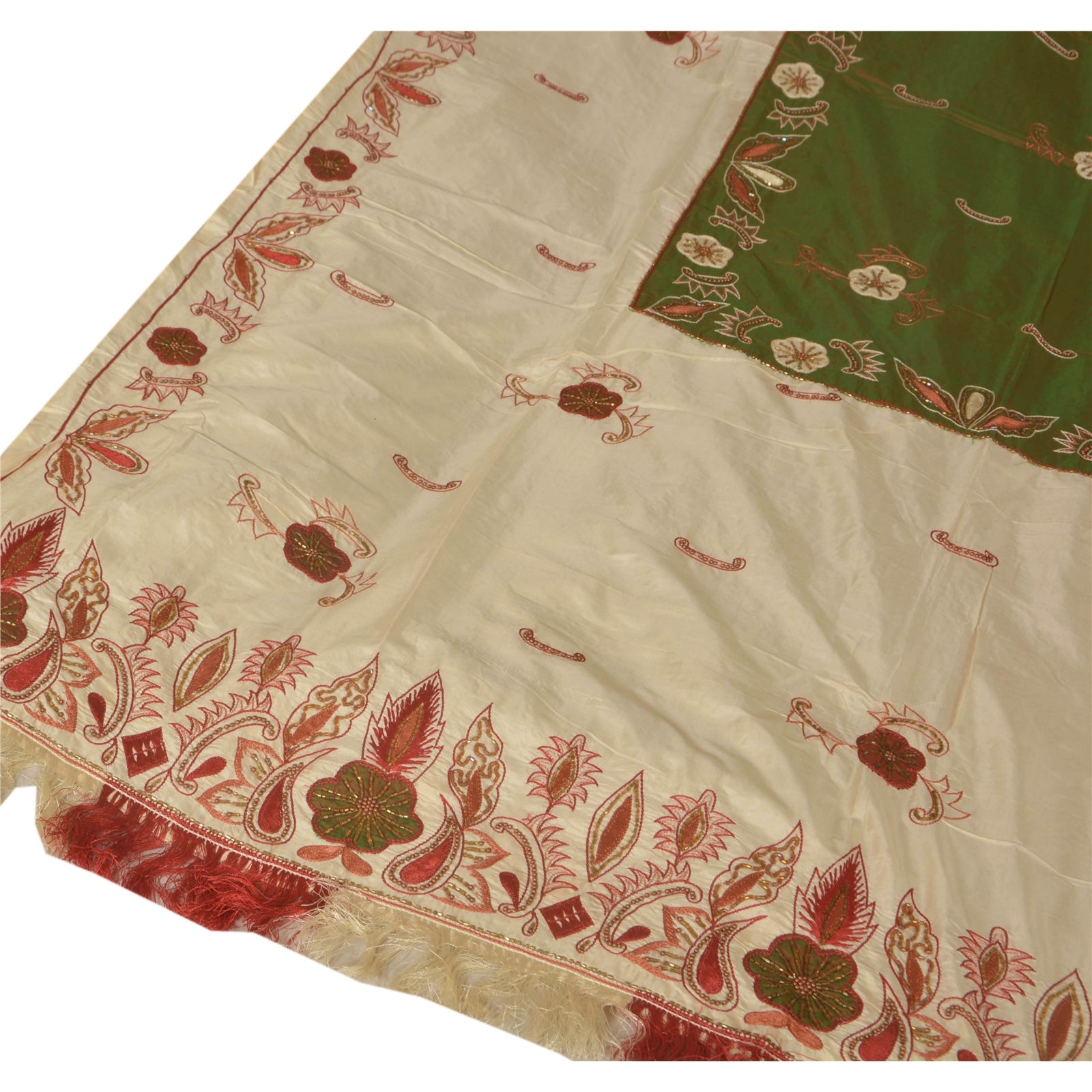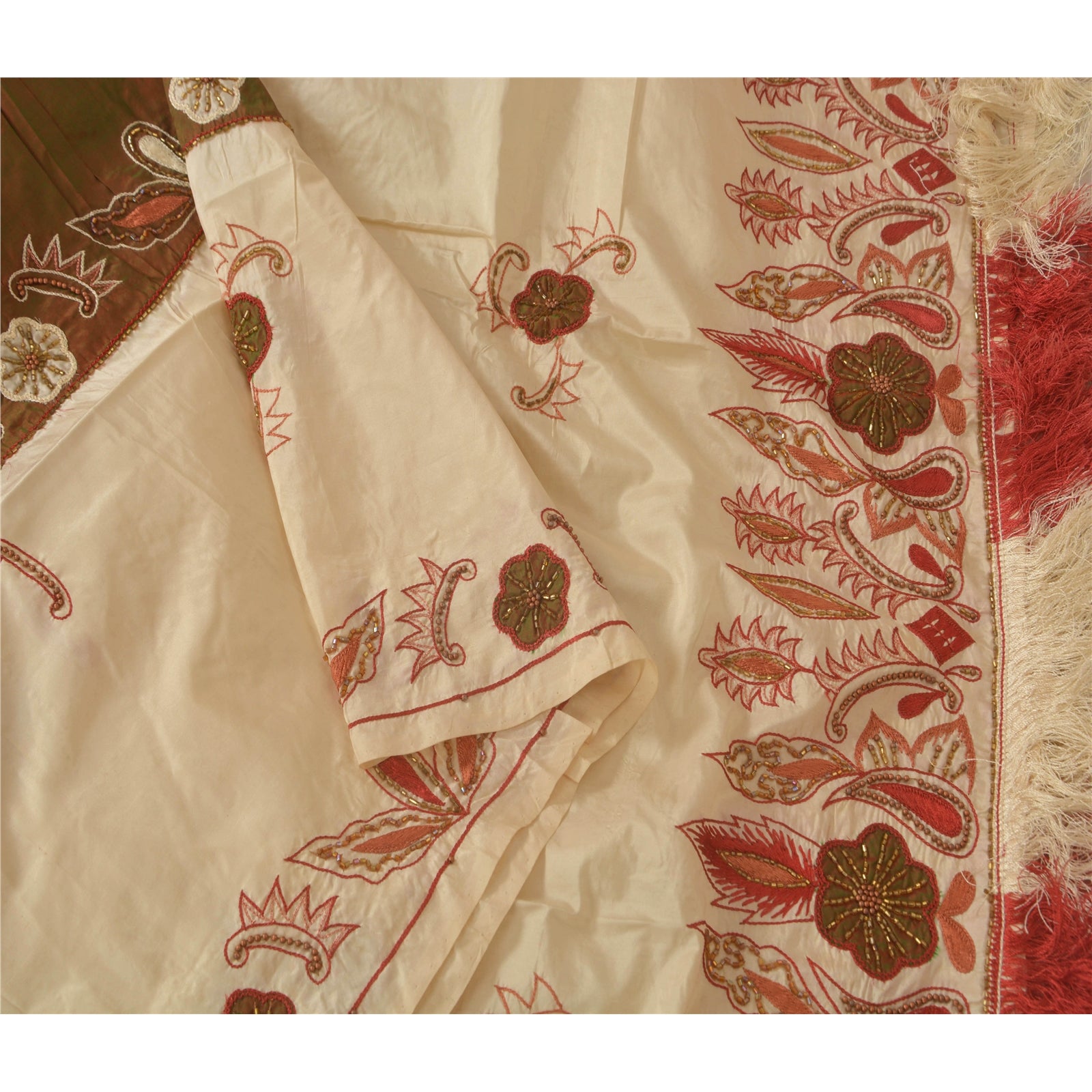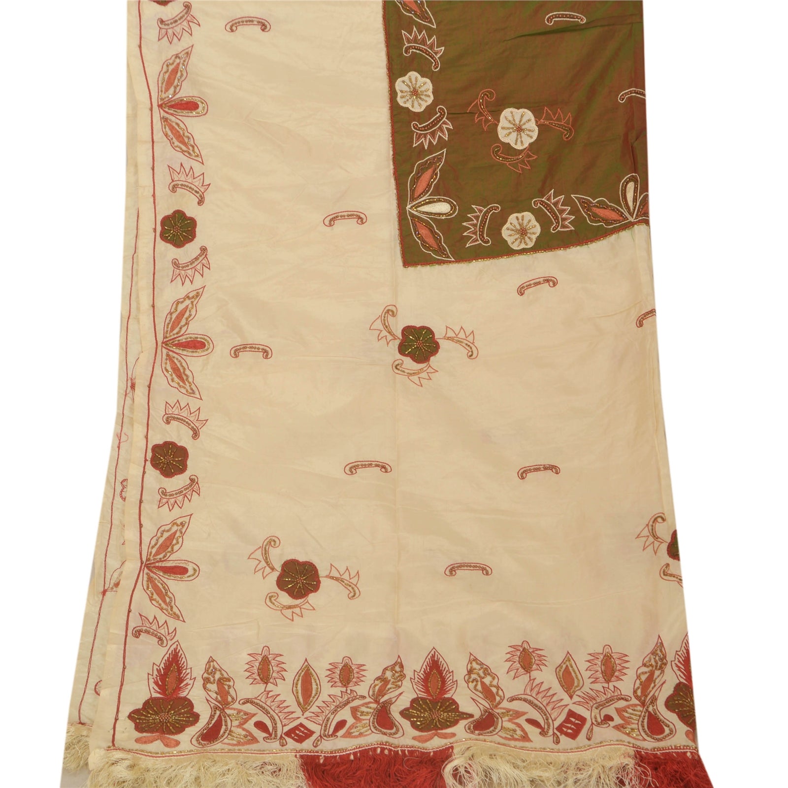 Sanskriti Vintage Ivory Long Dupatta 100% Pure Silk Stole Hand Beaded Veil