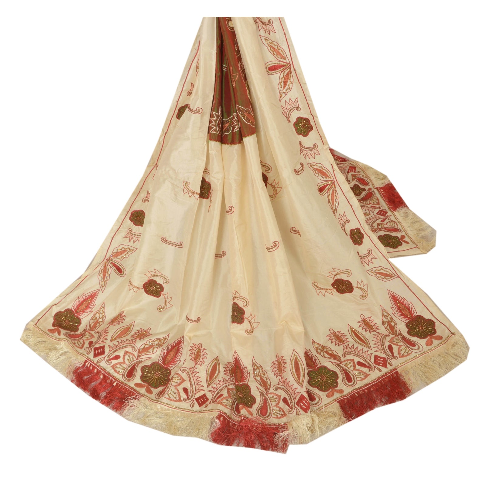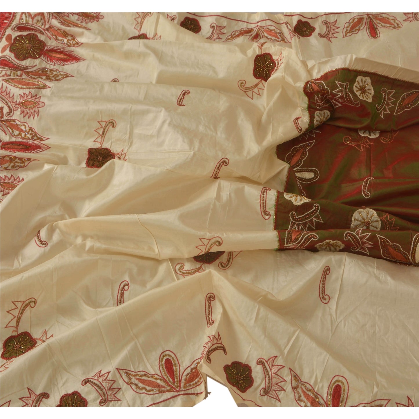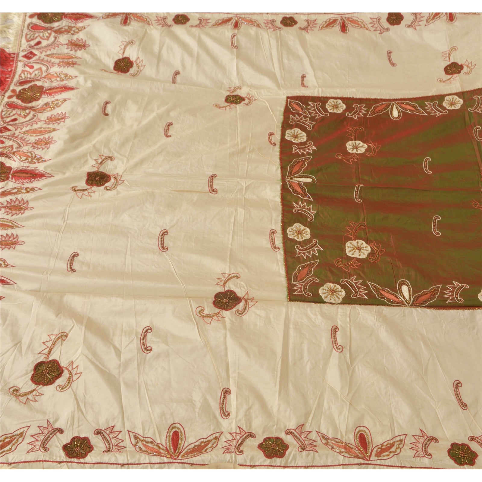 Sanskriti Vintage Ivory Long Dupatta 100% Pure Silk Stole Hand Beaded Veil