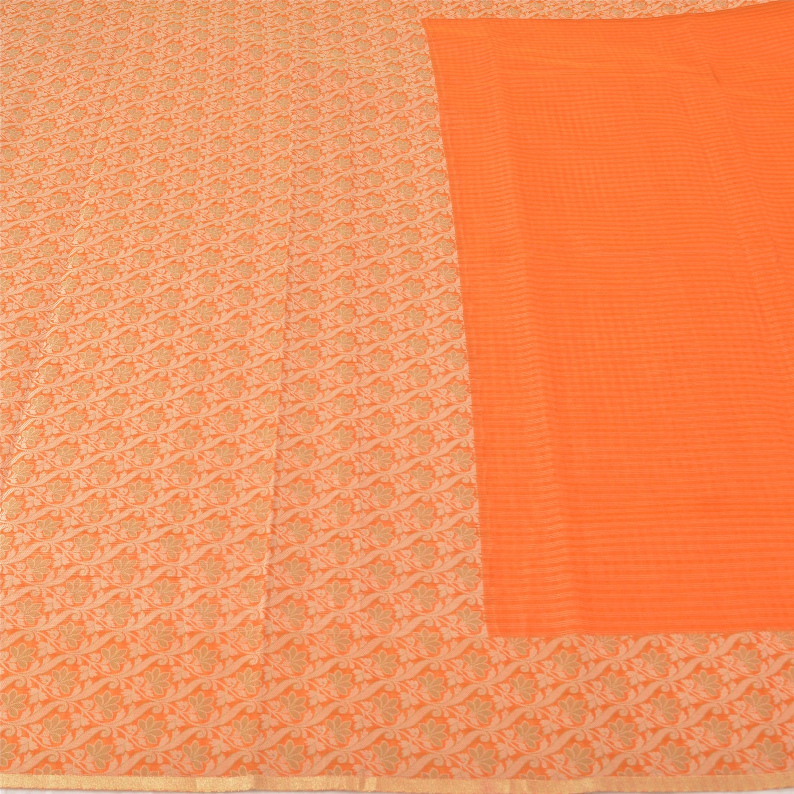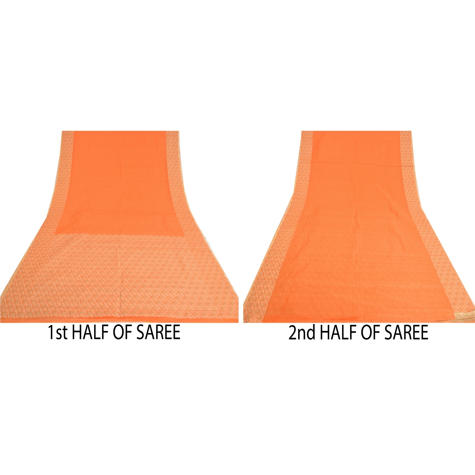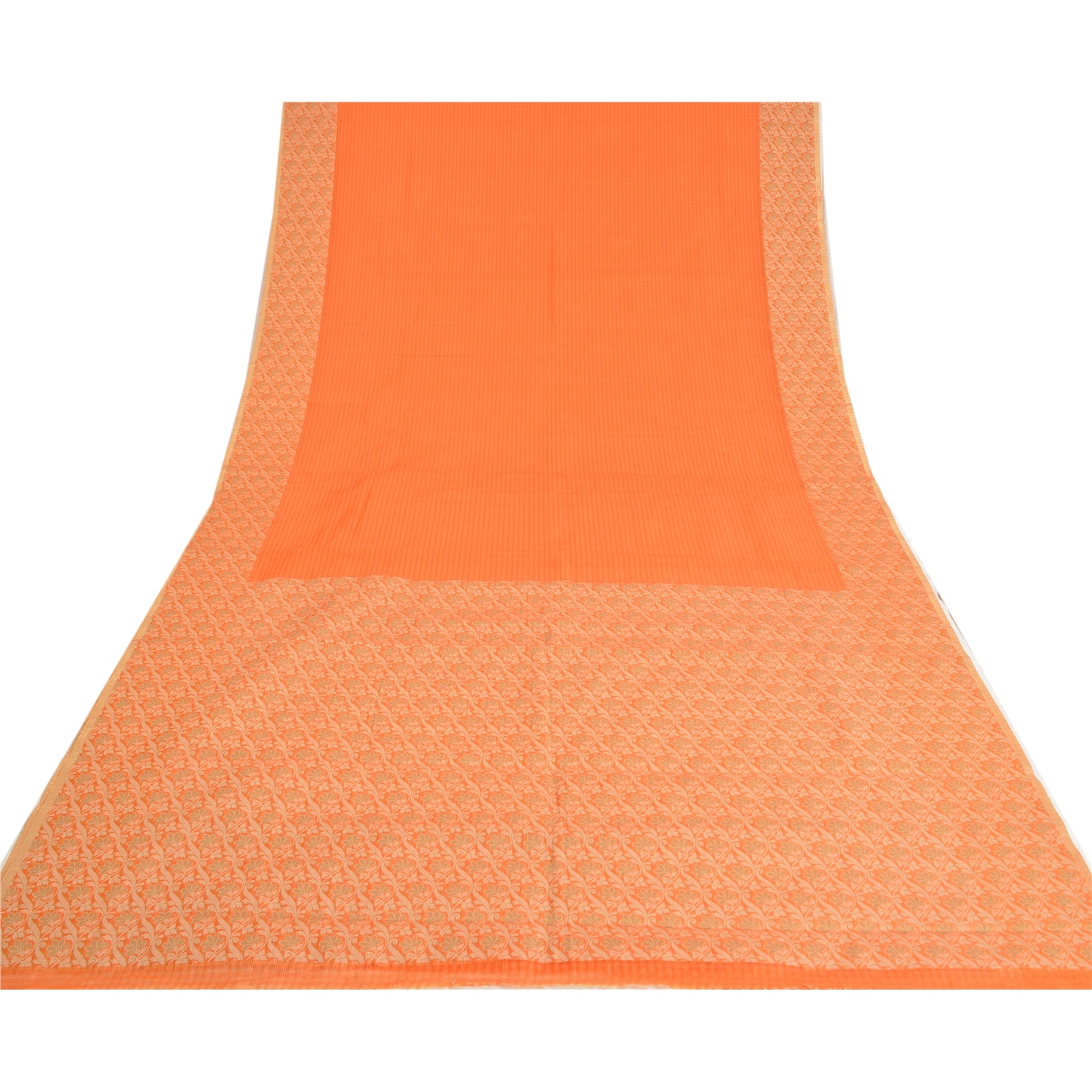 'THE ITEM COLOR OR SHADE MAY BE DARKER OR LIGHTER THAN THE PICTURE.' Beautiful orange colored art (artificial) silk woven sari. Pallu & border has cream/green woven work with floral design. The center of the saree has similar woven design. This saree can be used for various crafting ideas too. Use it for dress designing, as a throw, as window dressing, upholstery, table linen and much more. Let your creative juices flow. 'International buyers please note: Import duties, taxes, and charges are not included in the item price or postage cost. These charges are the buyer's responsibility. Please check with your country's customs office to determine what these additional costs will be prior to bidding or buying. Buyer will pay custom duty/tax. It is calculated and charged differently by every country. As a seller I do not have any control over it. VAT or sales tax is calculated by the platform at the time of checkout. Customs charge is payable at the time of delivery.'