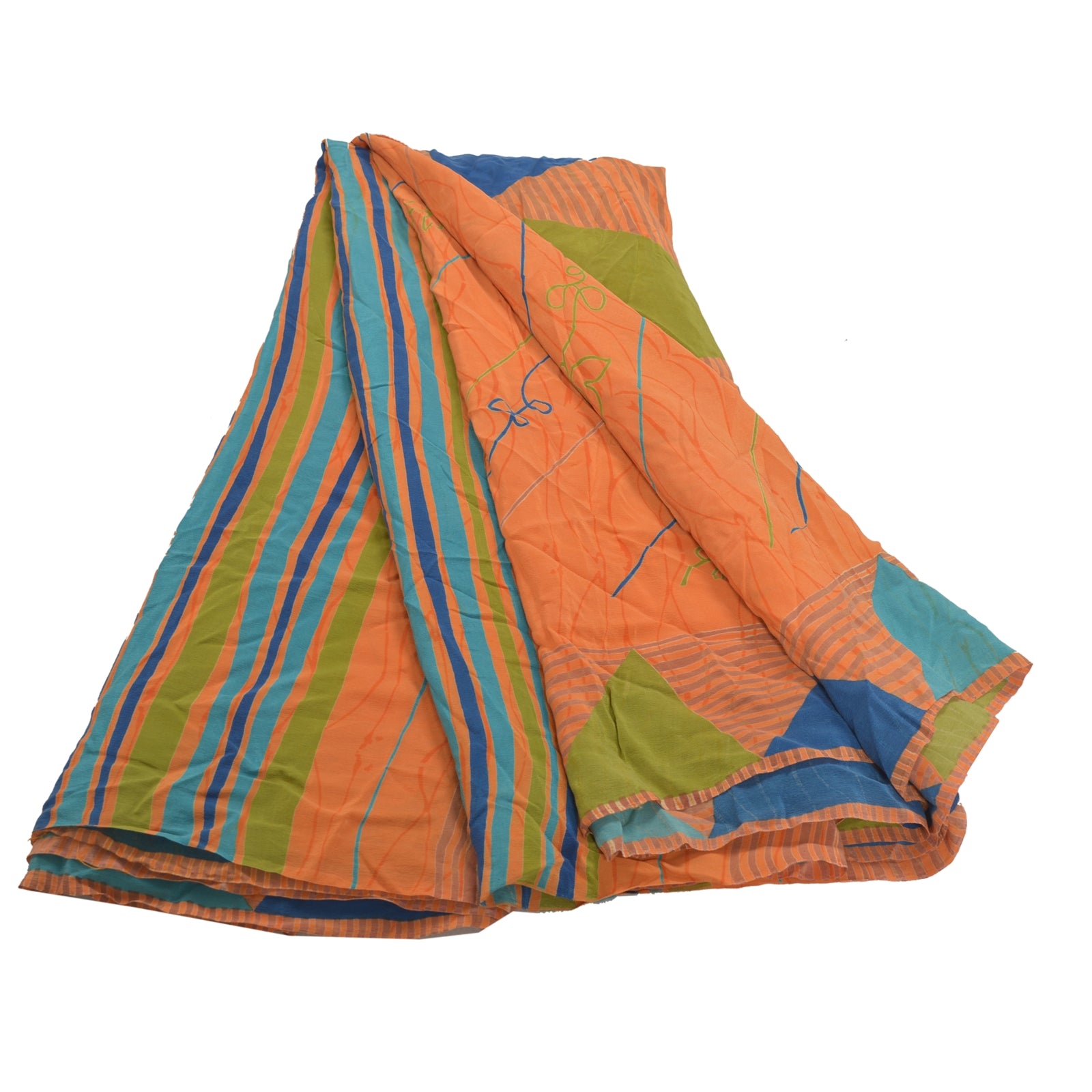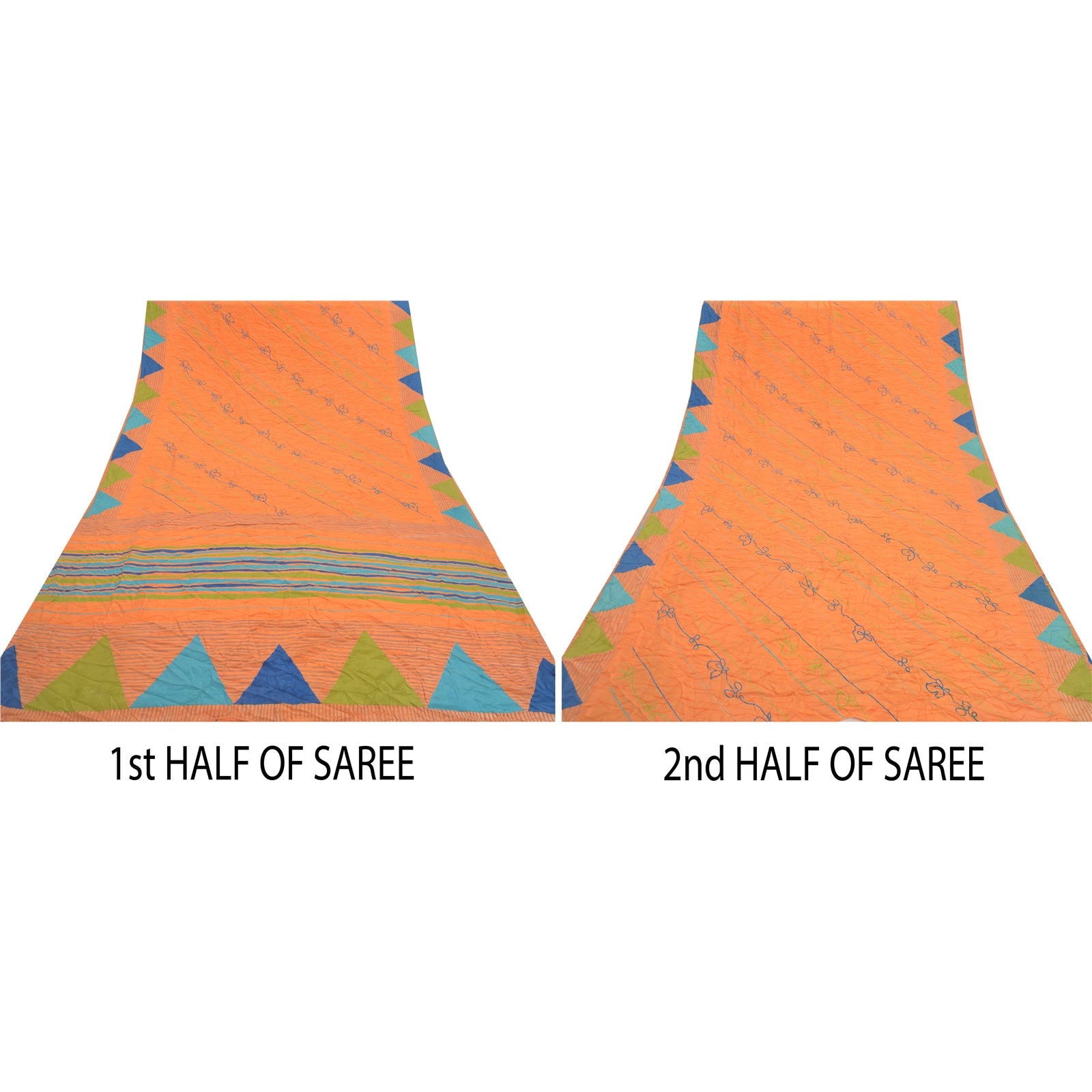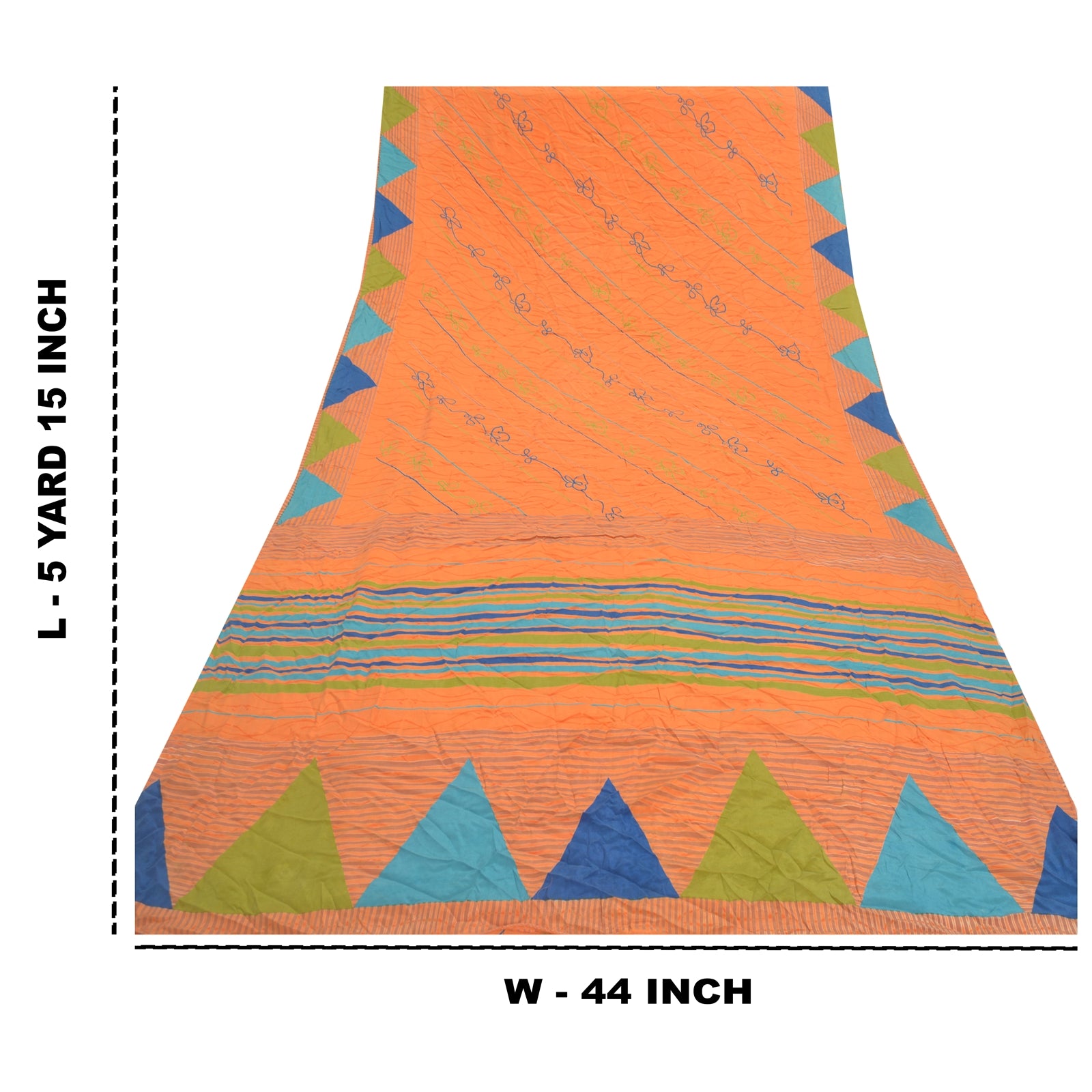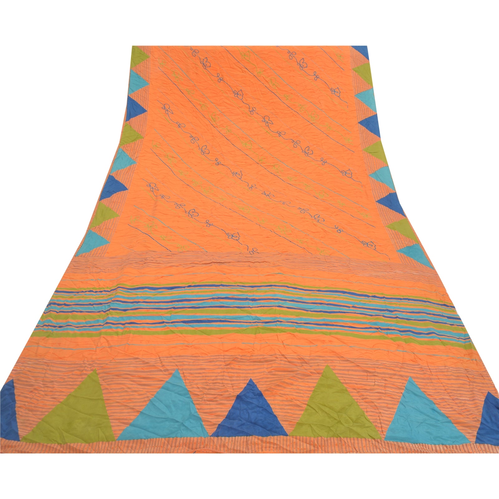 Beautiful Orange Colored Saree 100% Pure Crepe Silk Printed Base Sustainable Fabric Pallu & Border has printed triangular shape design. The center part of sari boasts similar printed floral design. This unique vintage saree can be used for various crafting ideas even if you don't want to use it as a sari. Design a dress, use it as a throw, as window dressing, upholstery, sarongs, table linen and much more. Let your creative juices flow and use this decorated Sustainable Fabric in multiple fashion.
