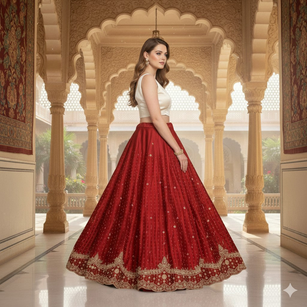 Sanskriti Vintage Red Long Unstitched Lehenga Pure Satin Hand Embroidery Zardozi