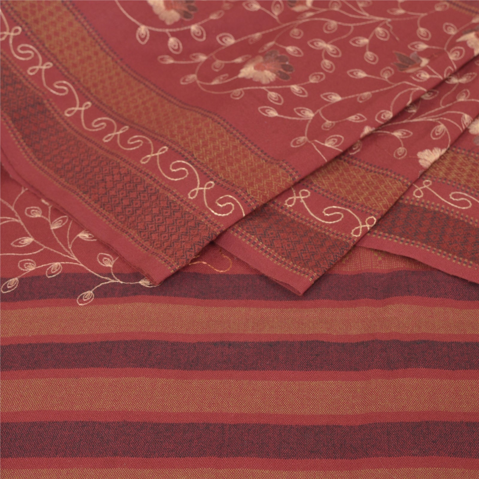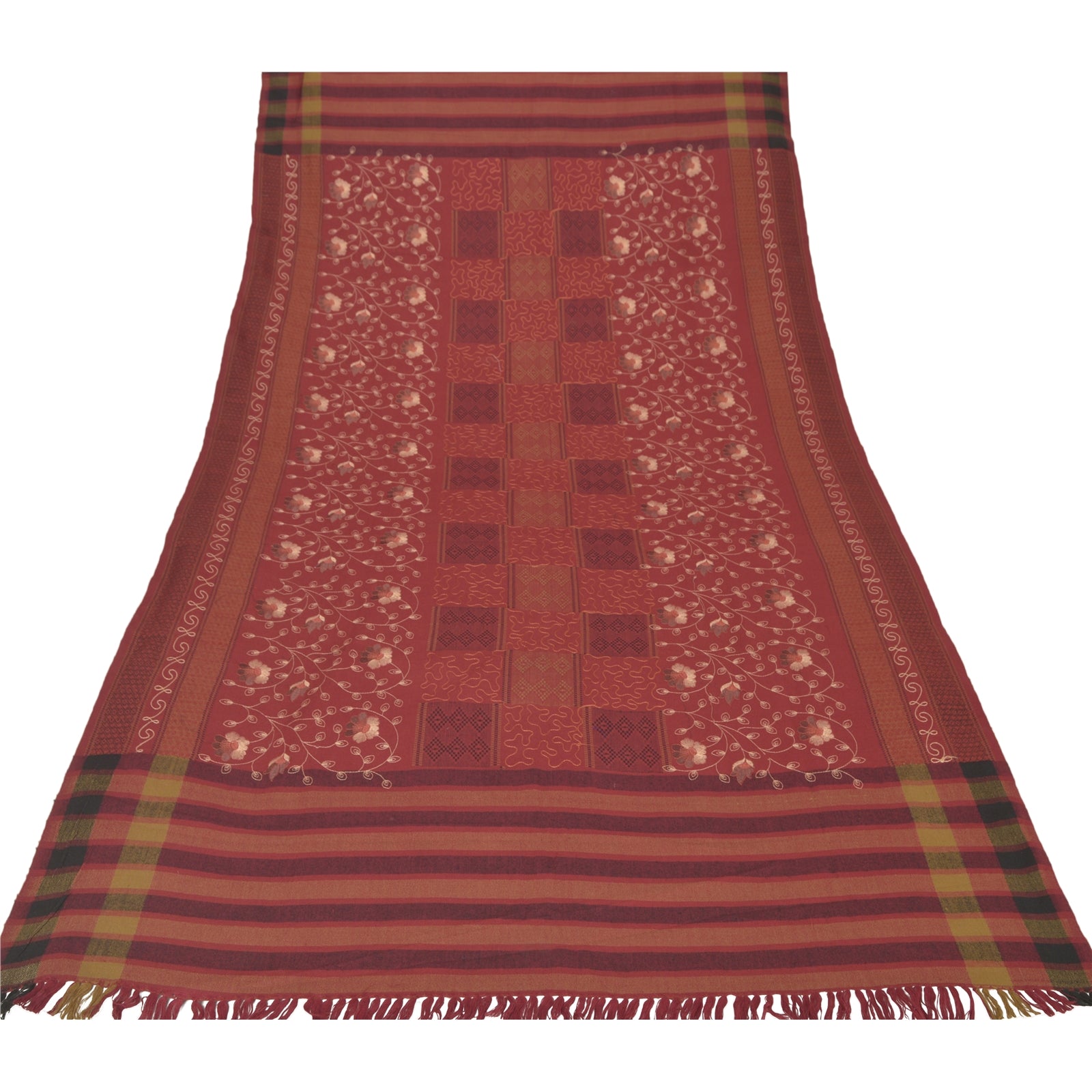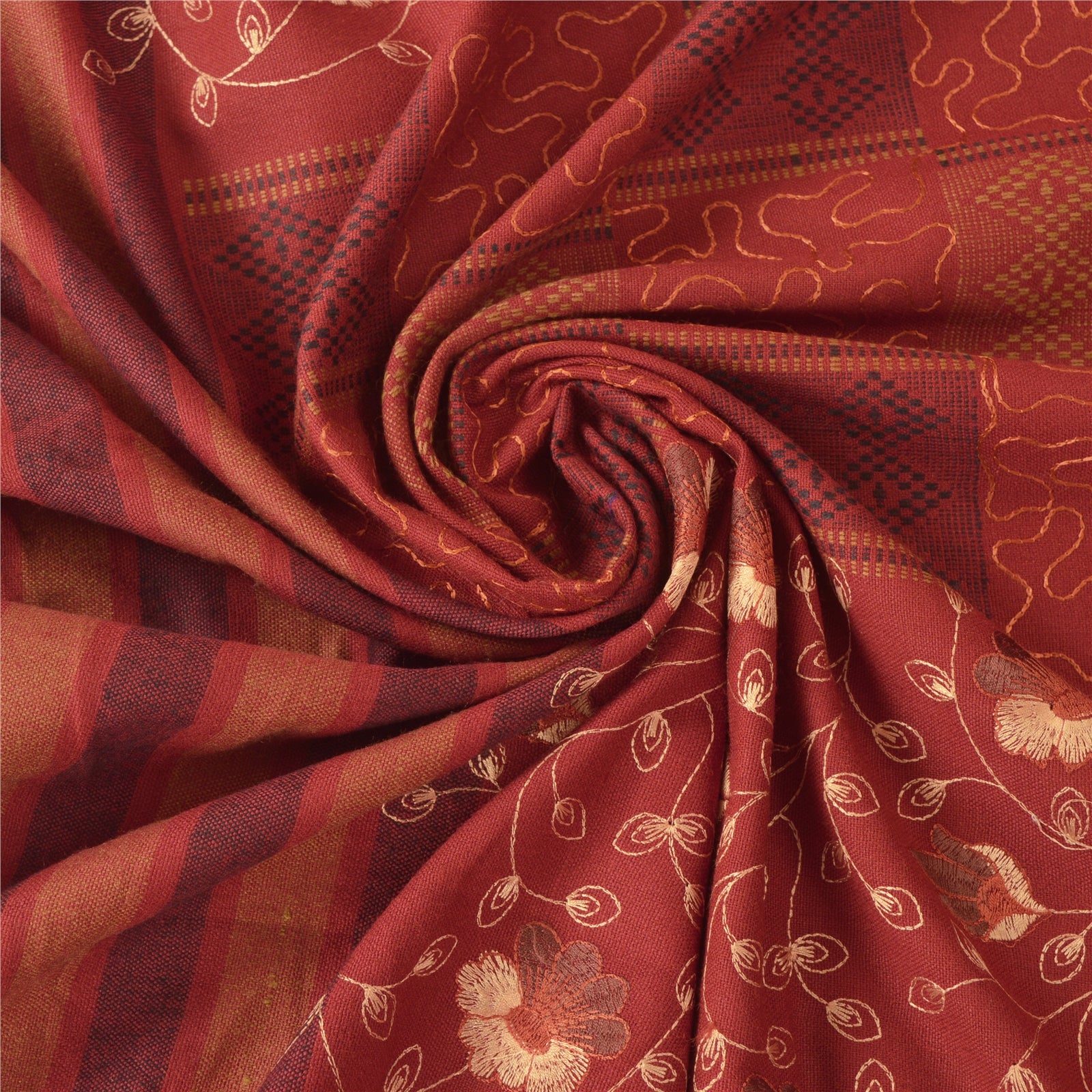 We Are Offering You A Vintage Rusty Orange Color Wool Stole/Shawl Which Adorns Embroidered Woven Work. The shawl or stole border features floral & geometric design with woven work. Multi color thread work in center portion of the shawl. Shawl has multi color fringes on both ends of borders. This cozy, warm and fuzzy stool is soft against skin due to the mellow woolen Sustainable Fabric. A truly gorgeous piece which will also make an admirable gift.