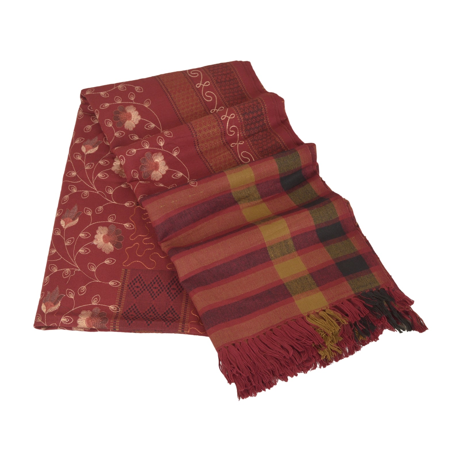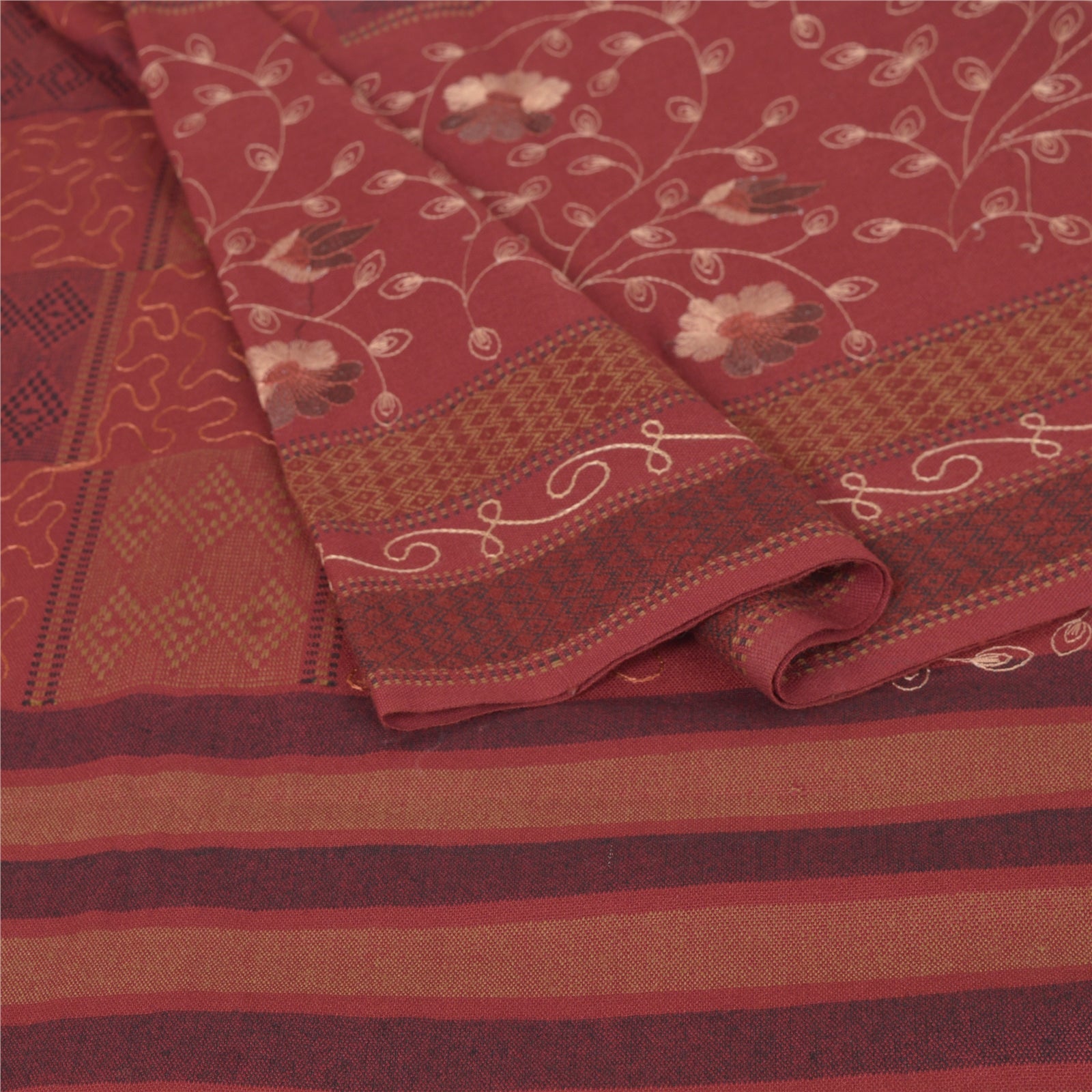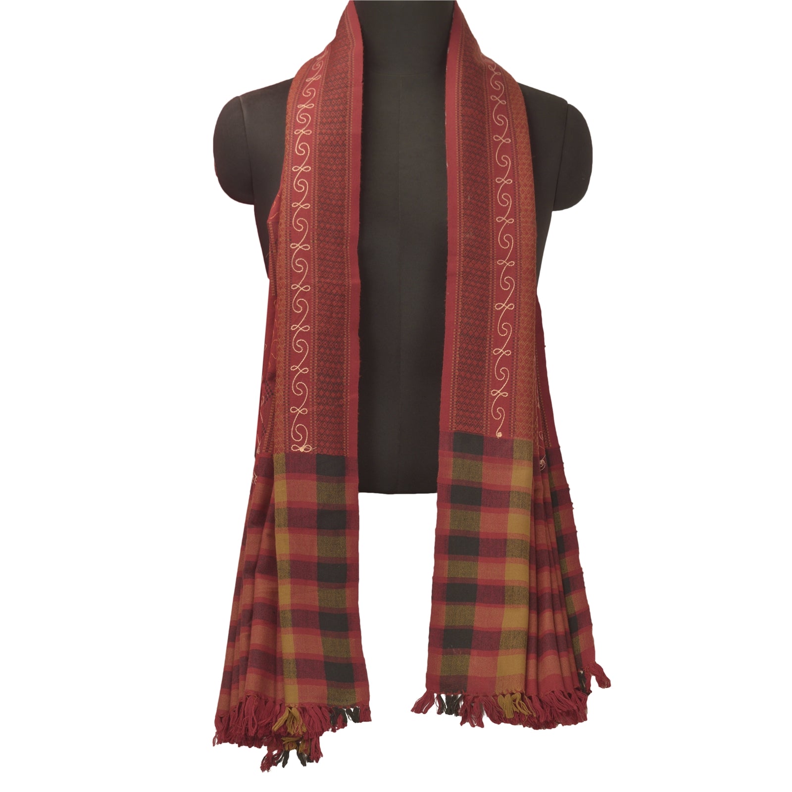 We Are Offering You A Vintage Rusty Orange Color Wool Stole/Shawl Which Adorns Embroidered Woven Work. The shawl or stole border features floral & geometric design with woven work. Multi color thread work in center portion of the shawl. Shawl has multi color fringes on both ends of borders. This cozy, warm and fuzzy stool is soft against skin due to the mellow woolen Sustainable Fabric. A truly gorgeous piece which will also make an admirable gift.