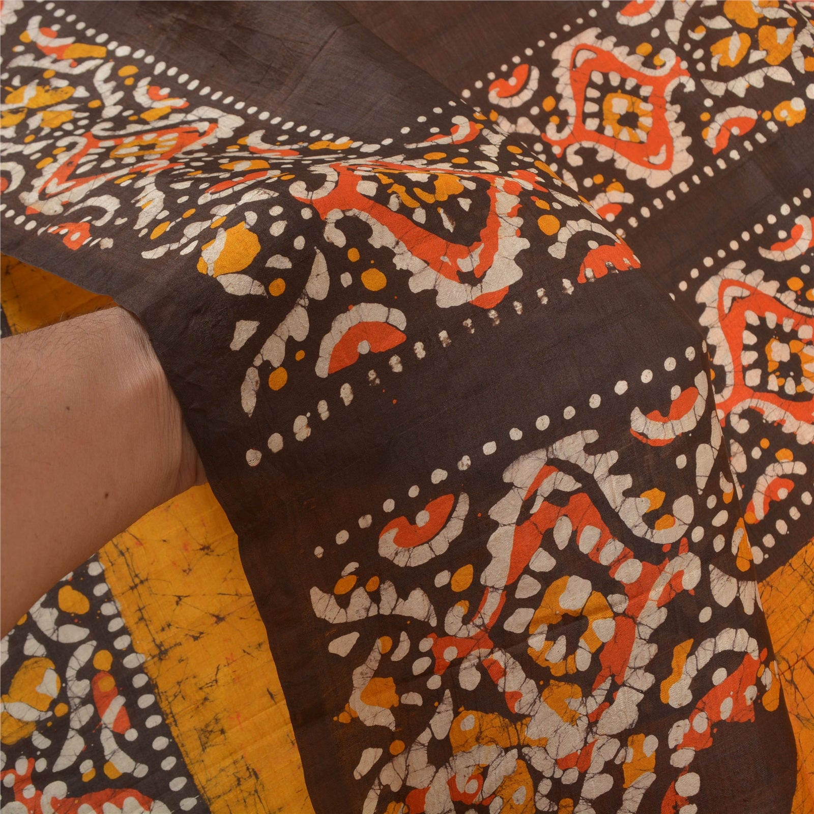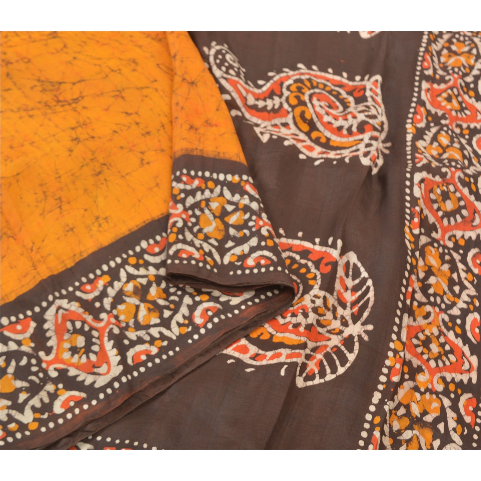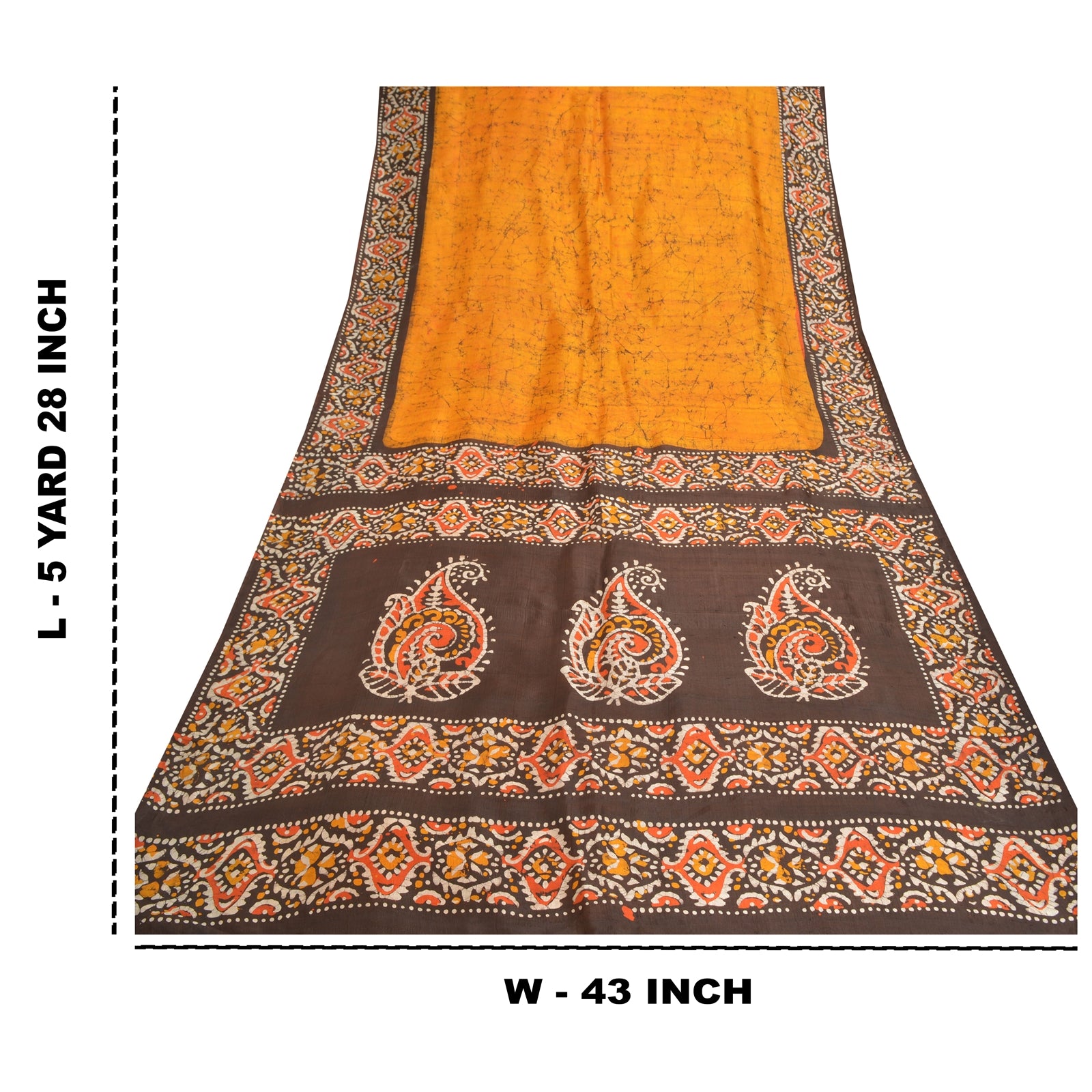Lovely Batik Work Heavy Sari In 100% Pure Silk Yellow & Brown Colored Base Sustainable Fabric. Batik is an ancient art which uses wax and dyes to create a visual magic on Sustainable Fabrics. It is an art appreciated all over the world. Overall the process is one where firstly the wax is used for creating designs on certain predefined areas on the Sustainable Fabric. Secondly the Sustainable Fabric is dyed and then the wax is removed by scraping or by boiling the cloth so that the wax peels off. The result is a beautiful piece of cloth with some very unconventional designs. This saree has 100% Pure Silk Sustainable Fabric with Batik Work. Full saree is painted on yellow & brown base with batik work and then floral & abstract designs are made on it with multi color. Pallu & Border of this saree has a big floral, paisley & abstract design and other designs made on it with. Center part of this saree has abstract pattern made on it with same colors. It is a beautiful ethnic saree with unique batik work. A One Of Kind Unique Saree Must In Your Collection. This unique vintage saree can be used for various crafting ideas for example design a dress, use it as a throw, as window dressing, upholstery, table linen and much more. Let your creative juices flow and use this decorated Sustainable Fabric in multiple fashion. As the product is vintage, some mild stains/damages are expected.