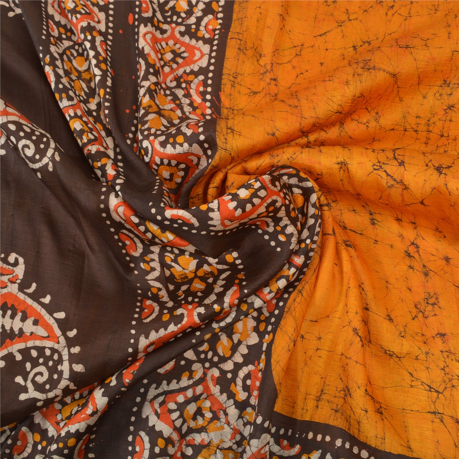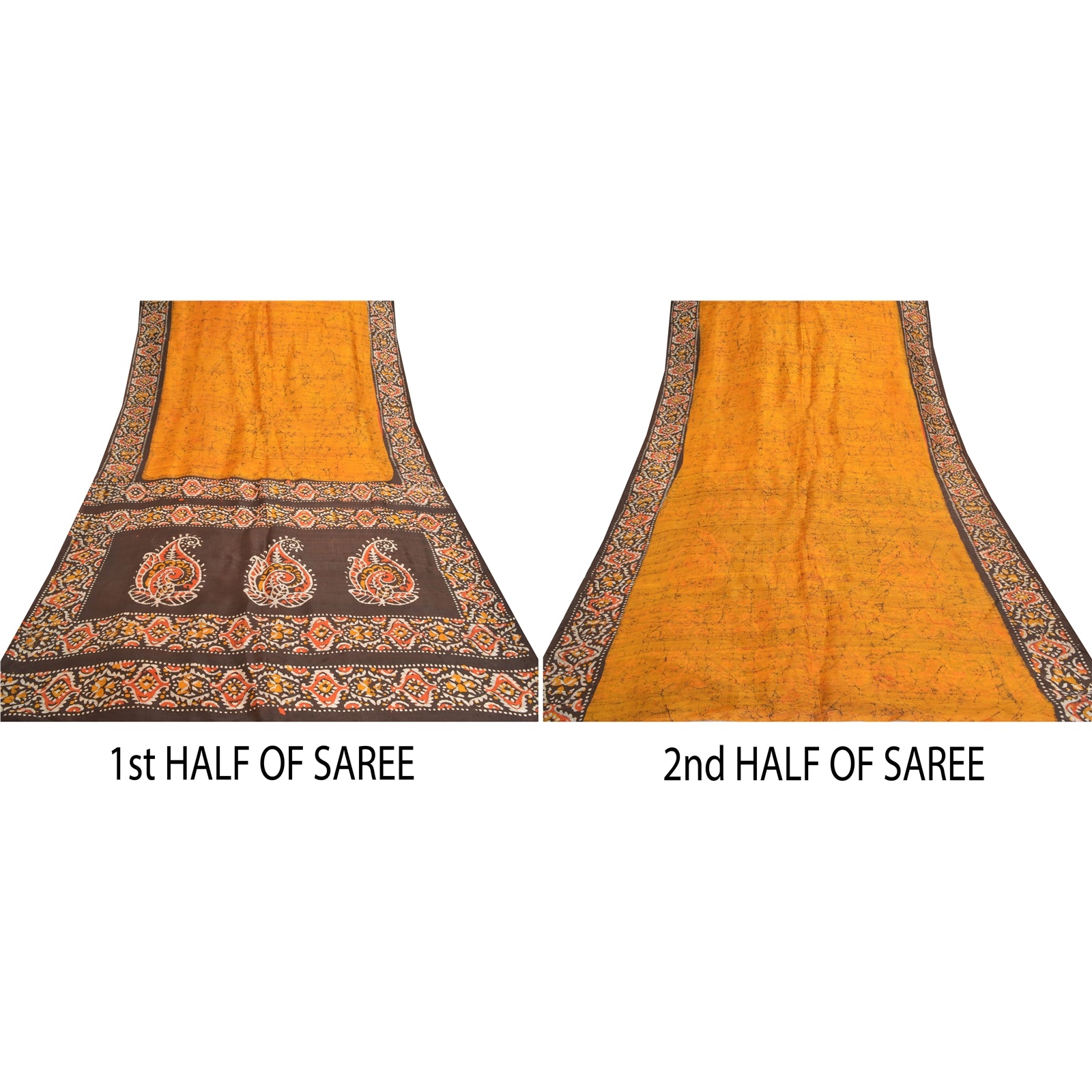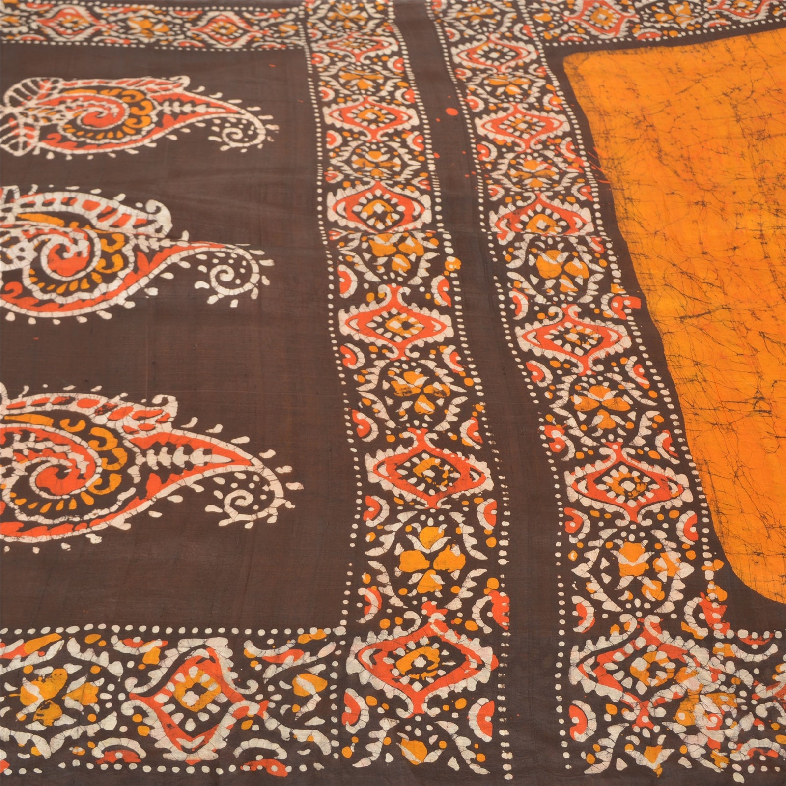 Lovely Batik Work Heavy Sari In 100% Pure Silk Yellow & Brown Colored Base Sustainable Fabric. Batik is an ancient art which uses wax and dyes to create a visual magic on Sustainable Fabrics. It is an art appreciated all over the world. Overall the process is one where firstly the wax is used for creating designs on certain predefined areas on the Sustainable Fabric. Secondly the Sustainable Fabric is dyed and then the wax is removed by scraping or by boiling the cloth so that the wax peels off. The result is a beautiful piece of cloth with some very unconventional designs. This saree has 100% Pure Silk Sustainable Fabric with Batik Work. Full saree is painted on yellow & brown base with batik work and then floral & abstract designs are made on it with multi color. Pallu & Border of this saree has a big floral, paisley & abstract design and other designs made on it with. Center part of this saree has abstract pattern made on it with same colors. It is a beautiful ethnic saree with unique batik work. A One Of Kind Unique Saree Must In Your Collection. This unique vintage saree can be used for various crafting ideas for example design a dress, use it as a throw, as window dressing, upholstery, table linen and much more. Let your creative juices flow and use this decorated Sustainable Fabric in multiple fashion. As the product is vintage, some mild stains/damages are expected.