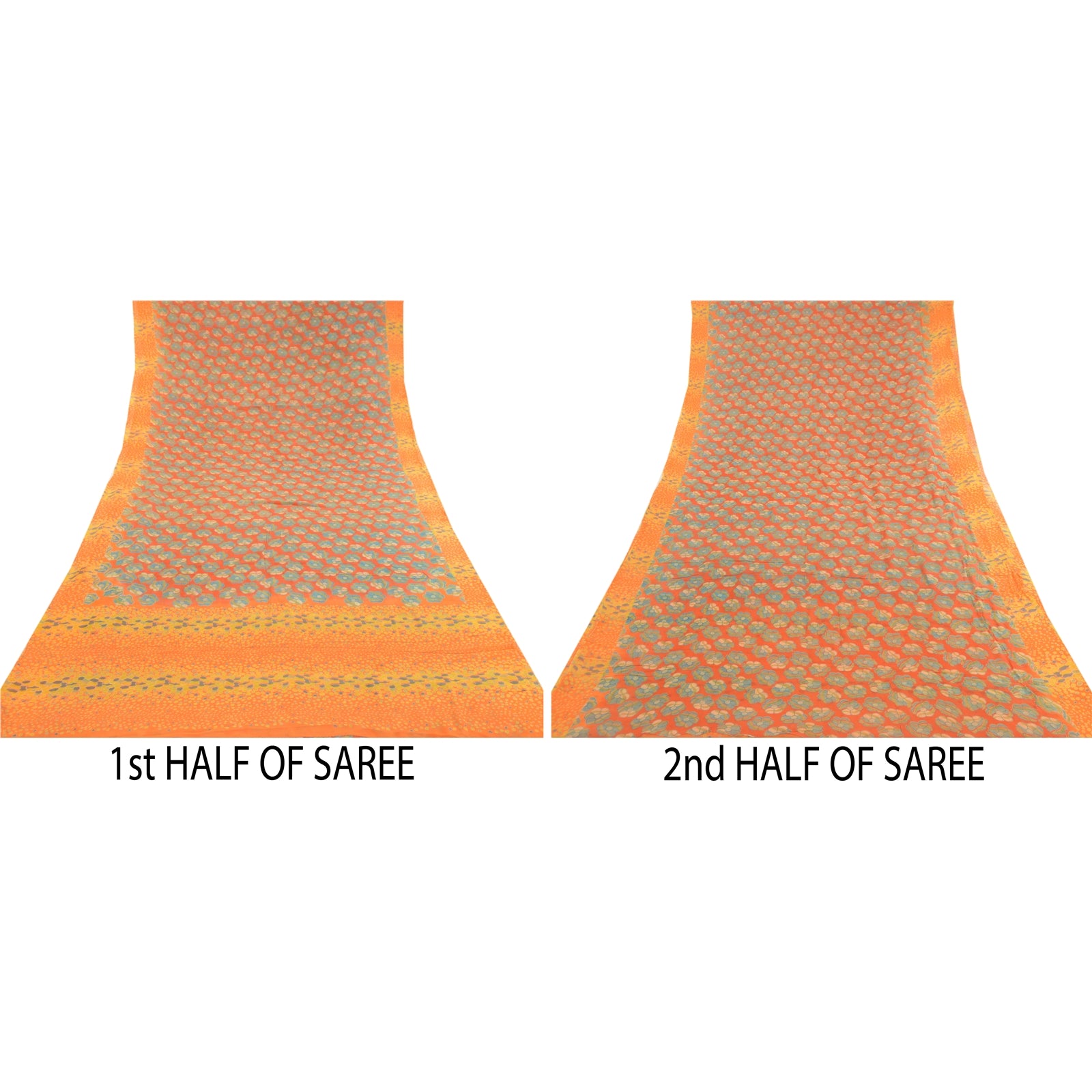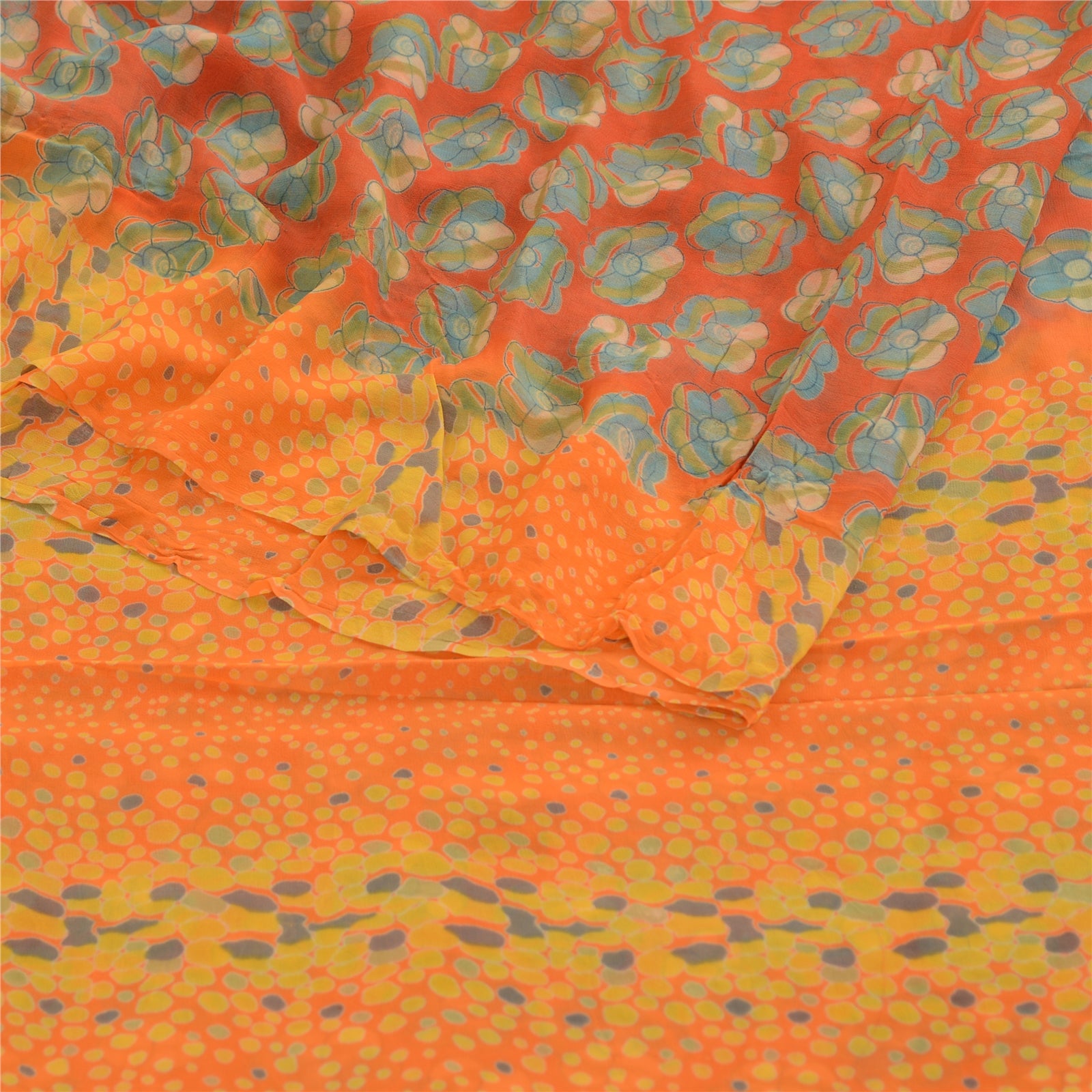 Beautiful red & orange colored blend georgette printed saree. Pallu & Border has printed floral design. Similar design in center part of saree. What is special about this saree? Brilliant design on soft Sustainable Fabric is really enhancing the beauty of the saree.This unique vintage saree can be used for various crafting ideas even if you don't want to use it as a sari. Design a dress, use it as a as window dressing, upholstery, sarongs, throw, dress making and table linen much more. Let your creative juices flow and use this decorated Sustainable Fabric in multiple fashion.