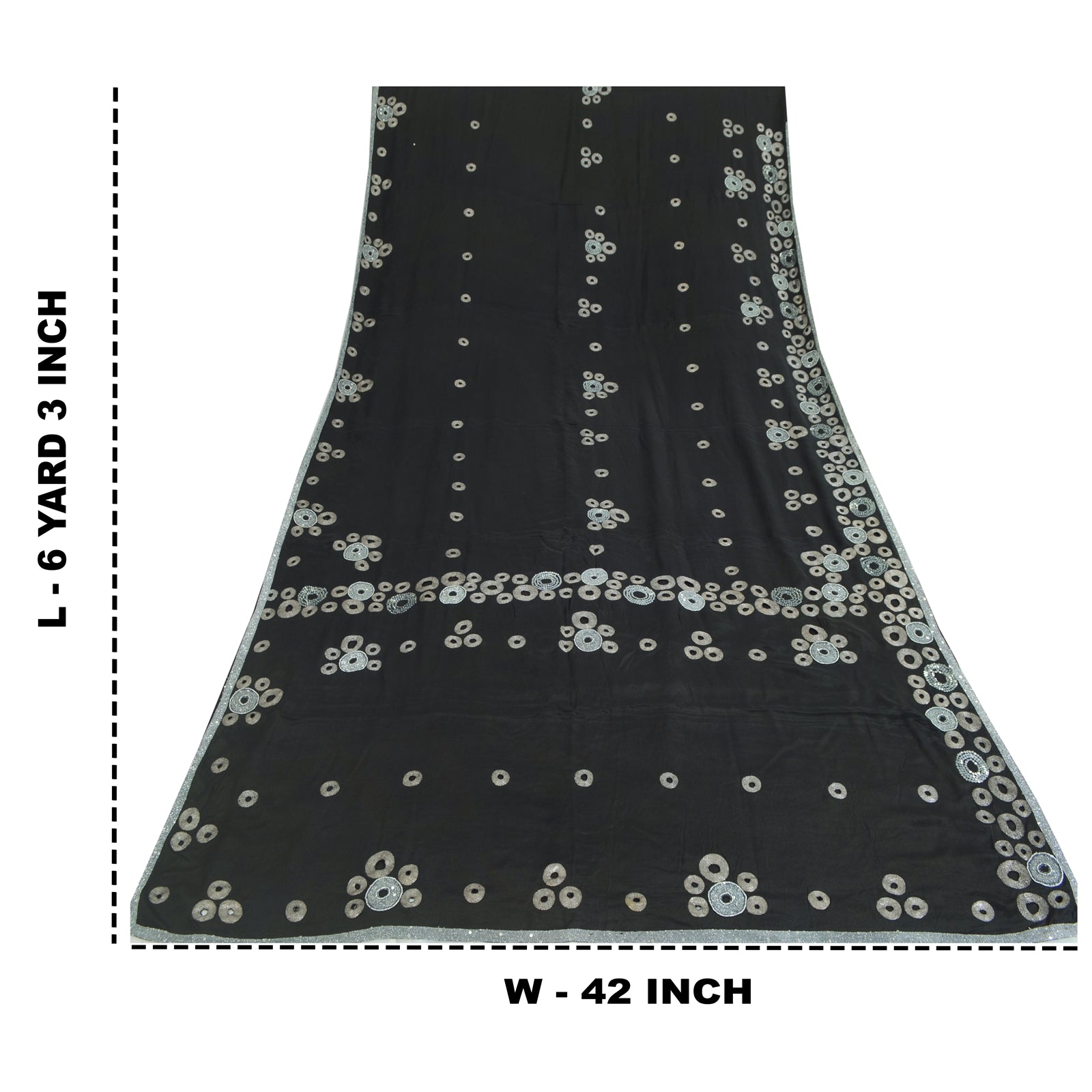 Sanskriti Vintage Sarees Black Hand Beaded Cut Work Pure Crepe Sari 6yd Sustainable Fabric