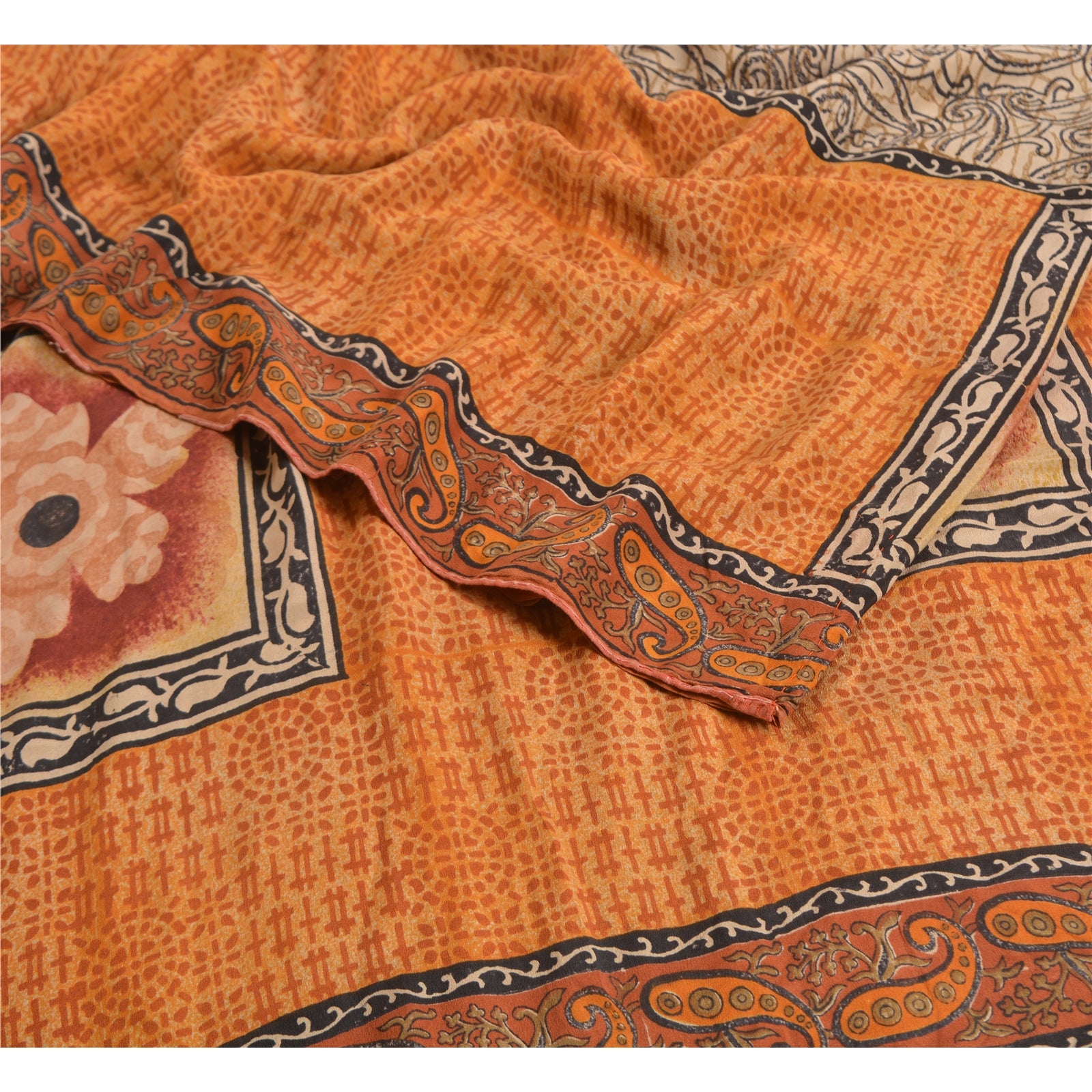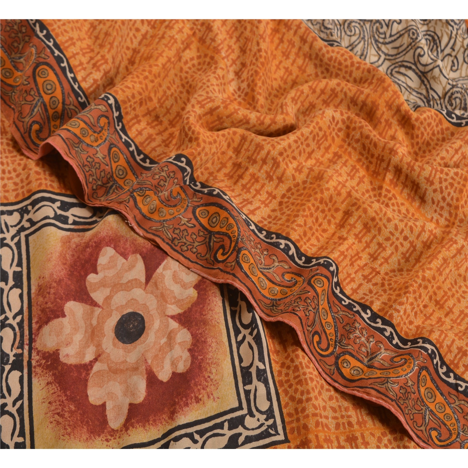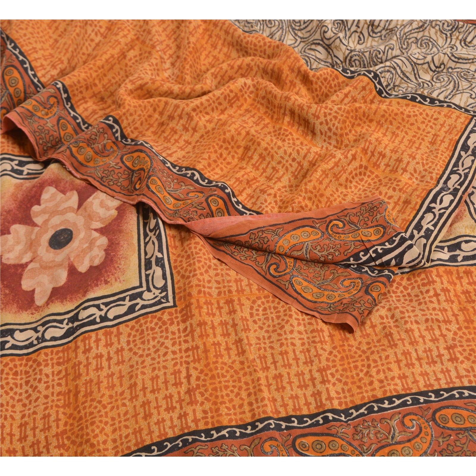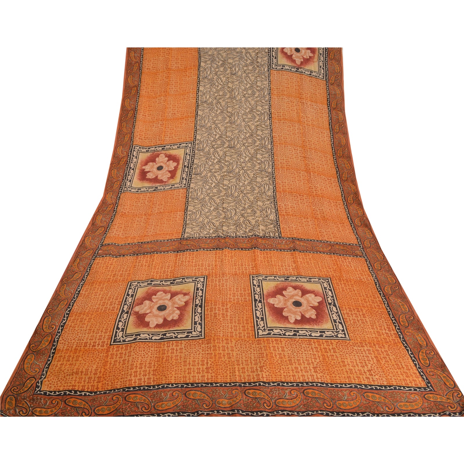 Sanskriti Vintage Sarees Black/Orange Pure Crepe Silk Printed Sari Craft Sustainable Fabric