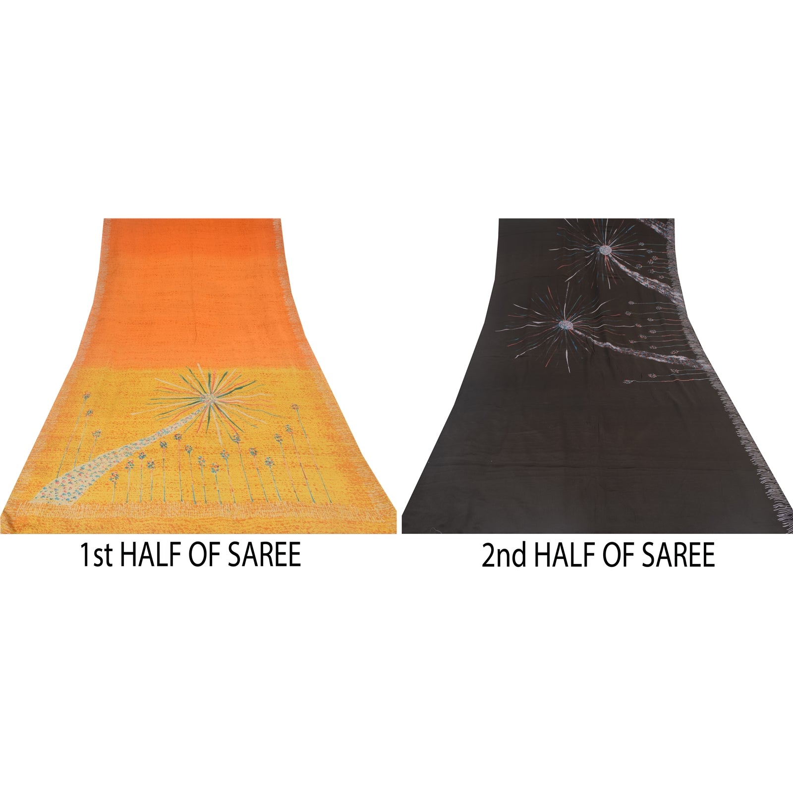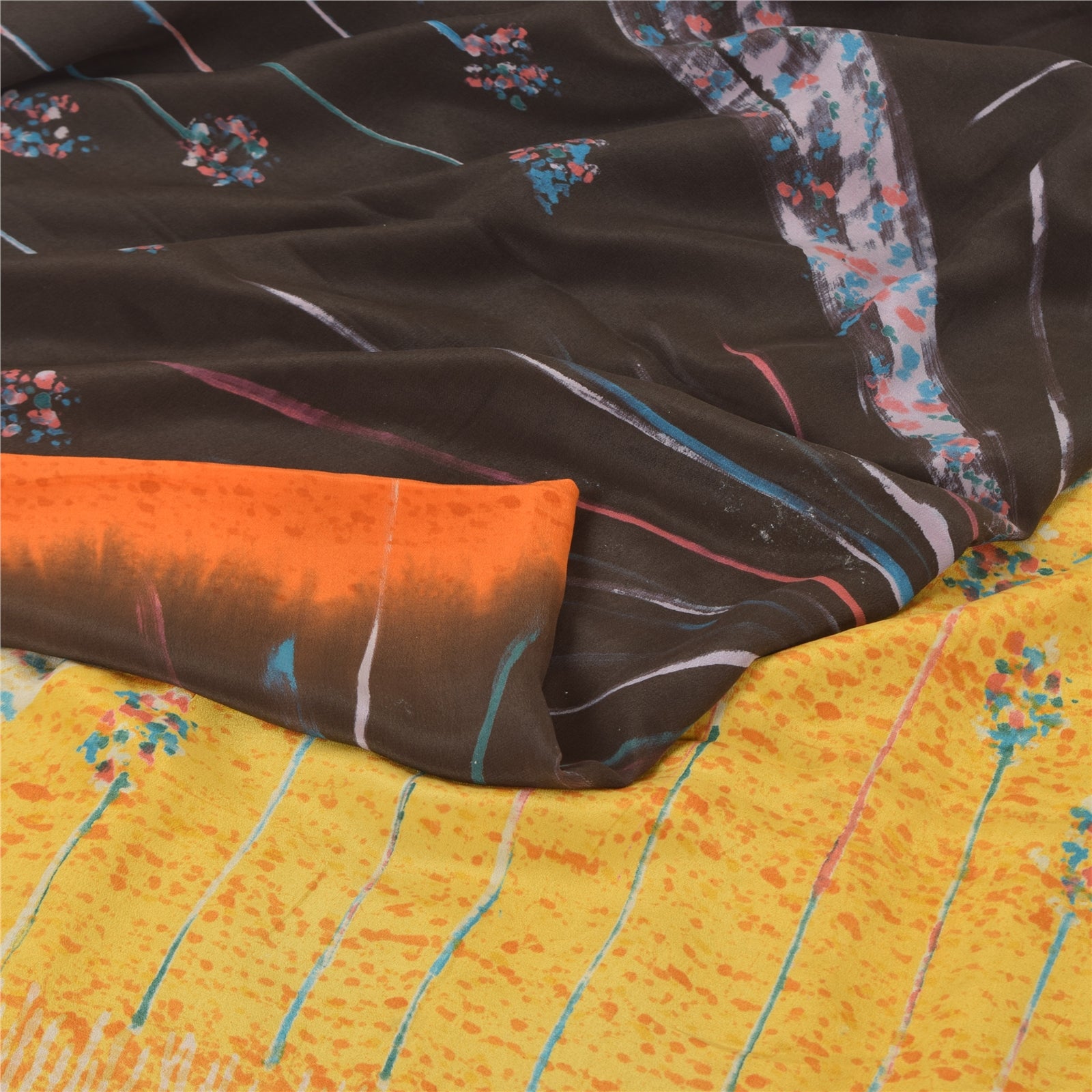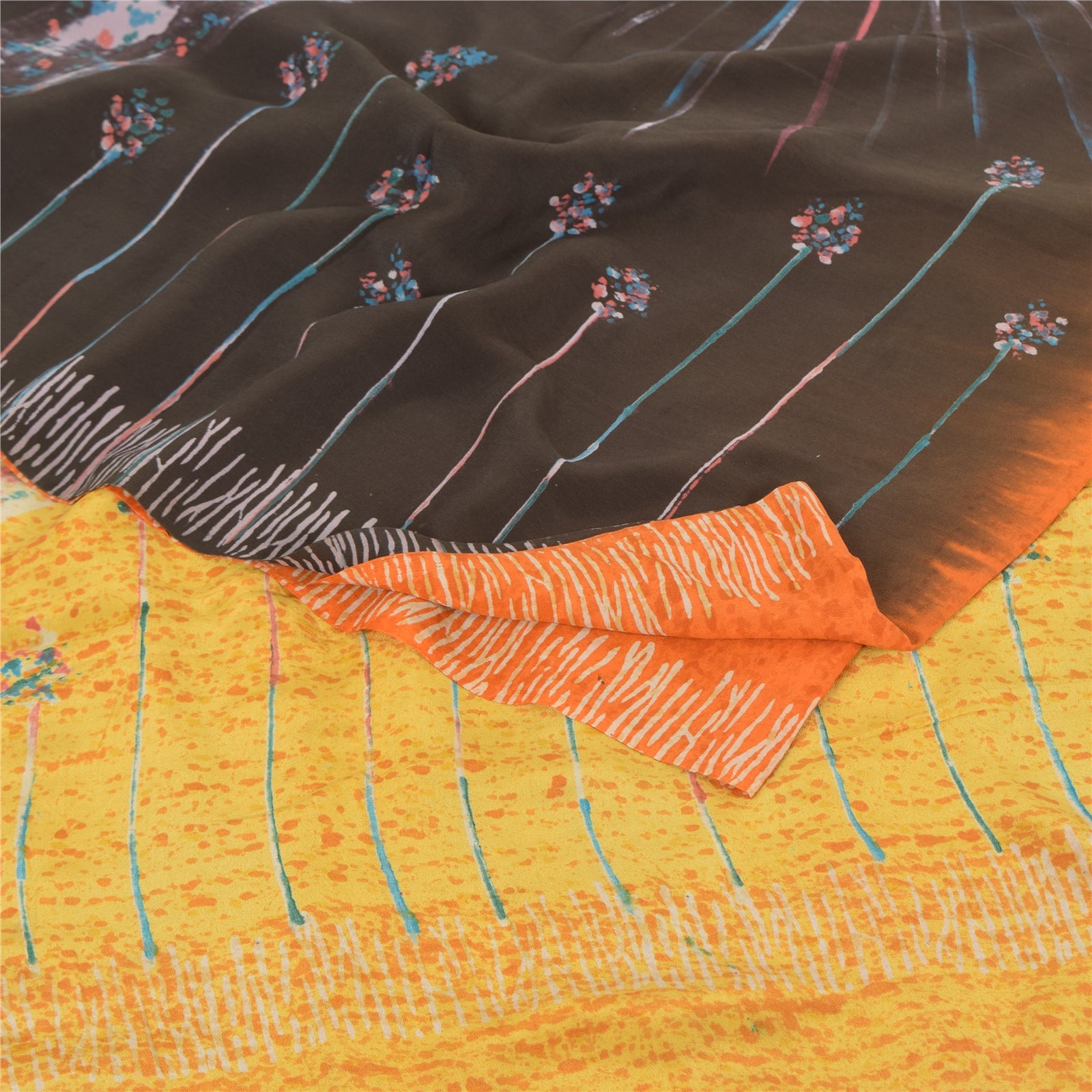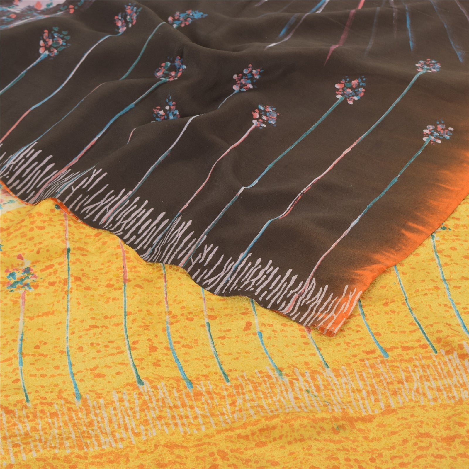Sanskriti Vintage Sarees Black/Saffron Pure Crepe Printed Sari 5yd Craft Sustainable Fabric