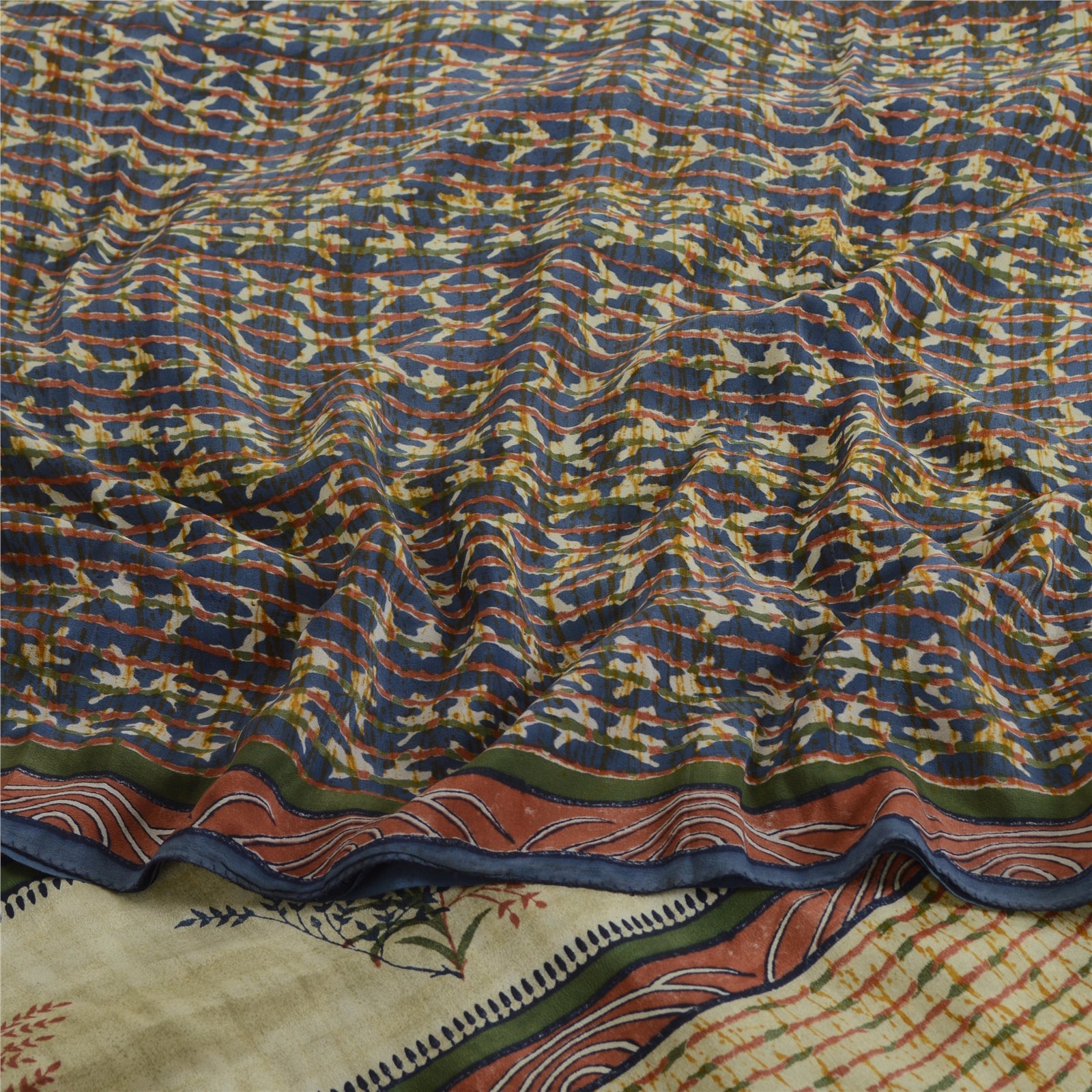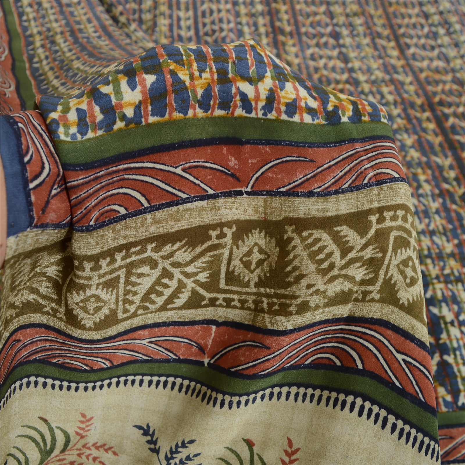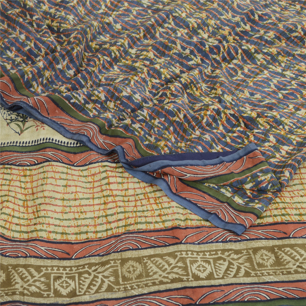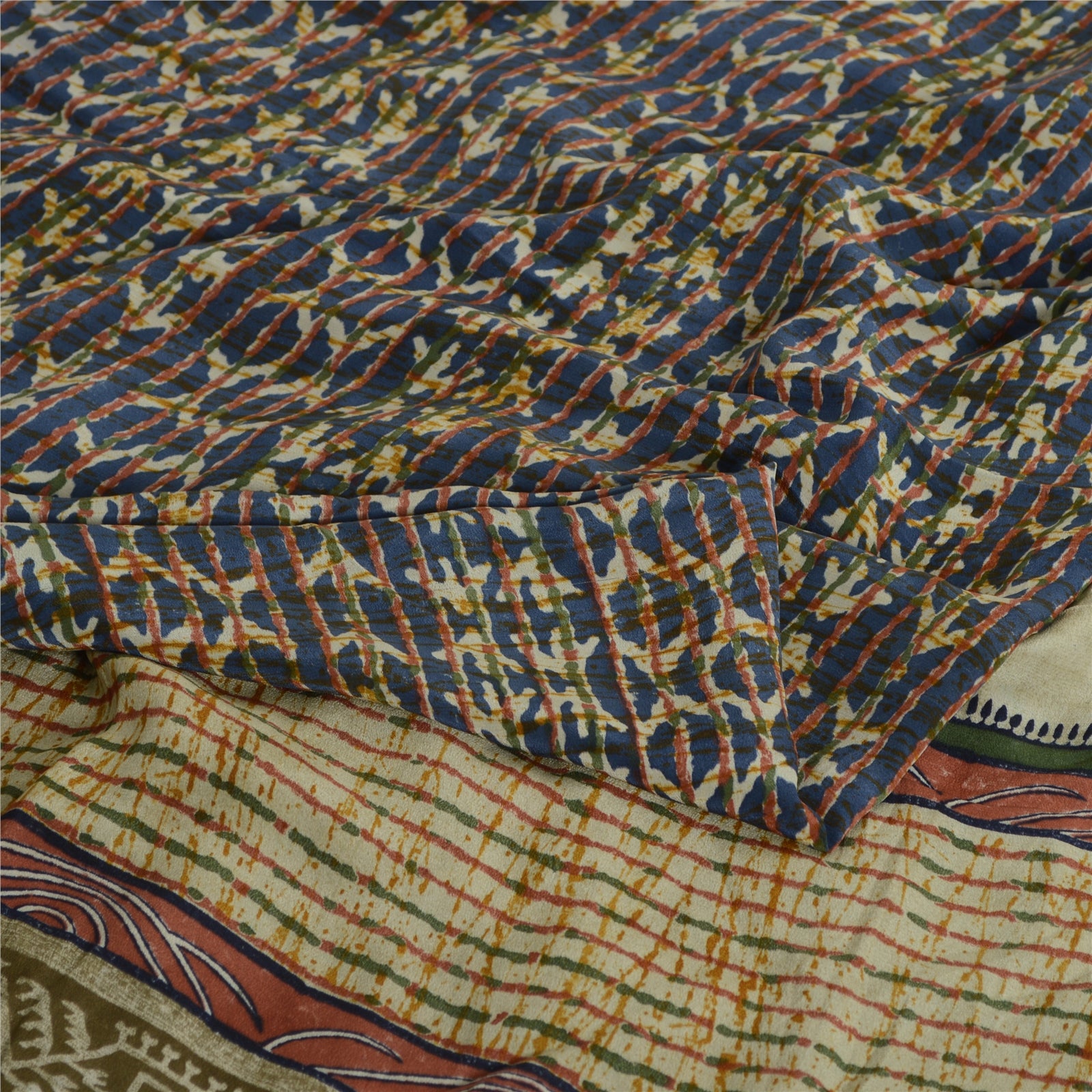 Sanskriti Vintage Sarees Blue 100% Pure Crepe Silk Printed Sari 5yd Craft Sustainable Fabric