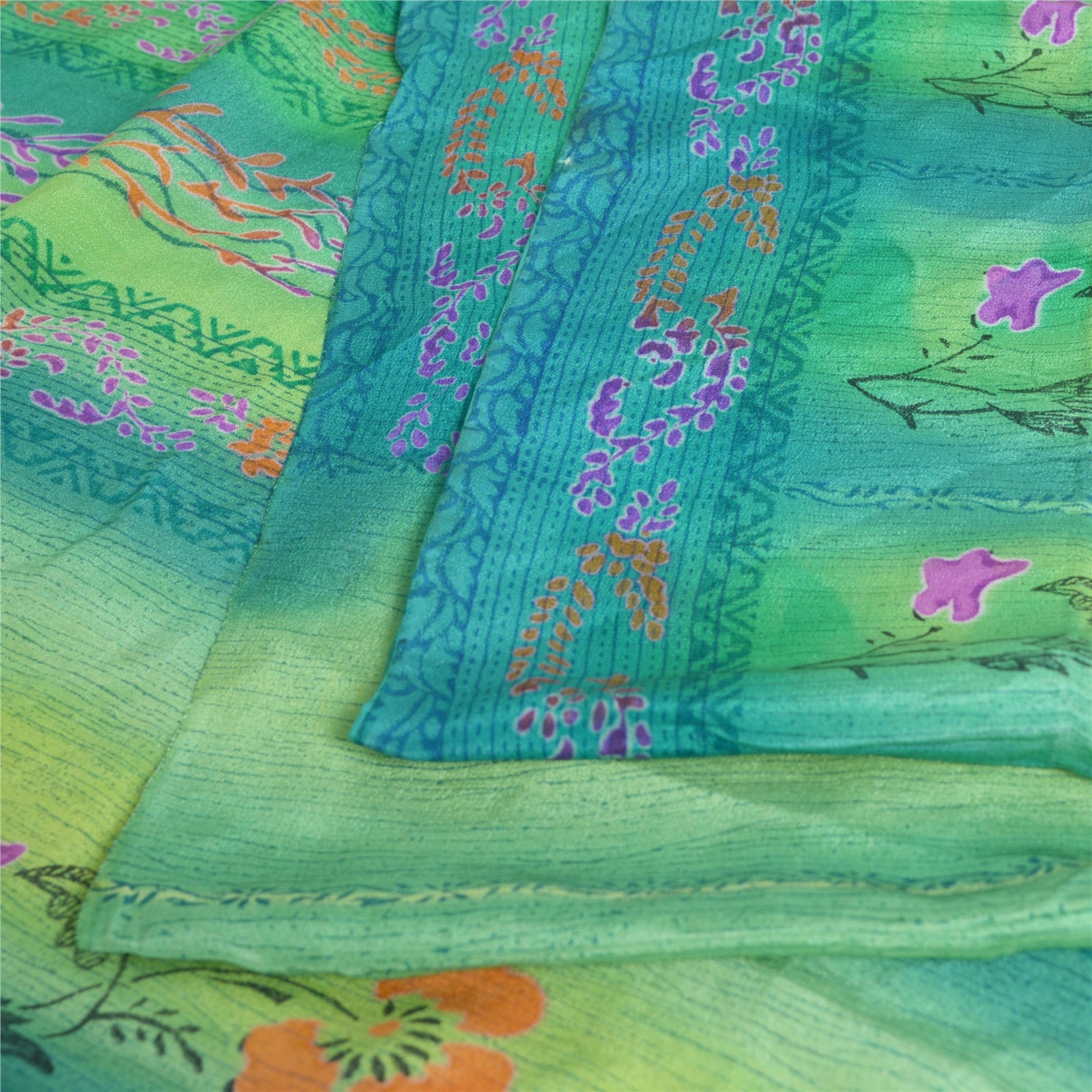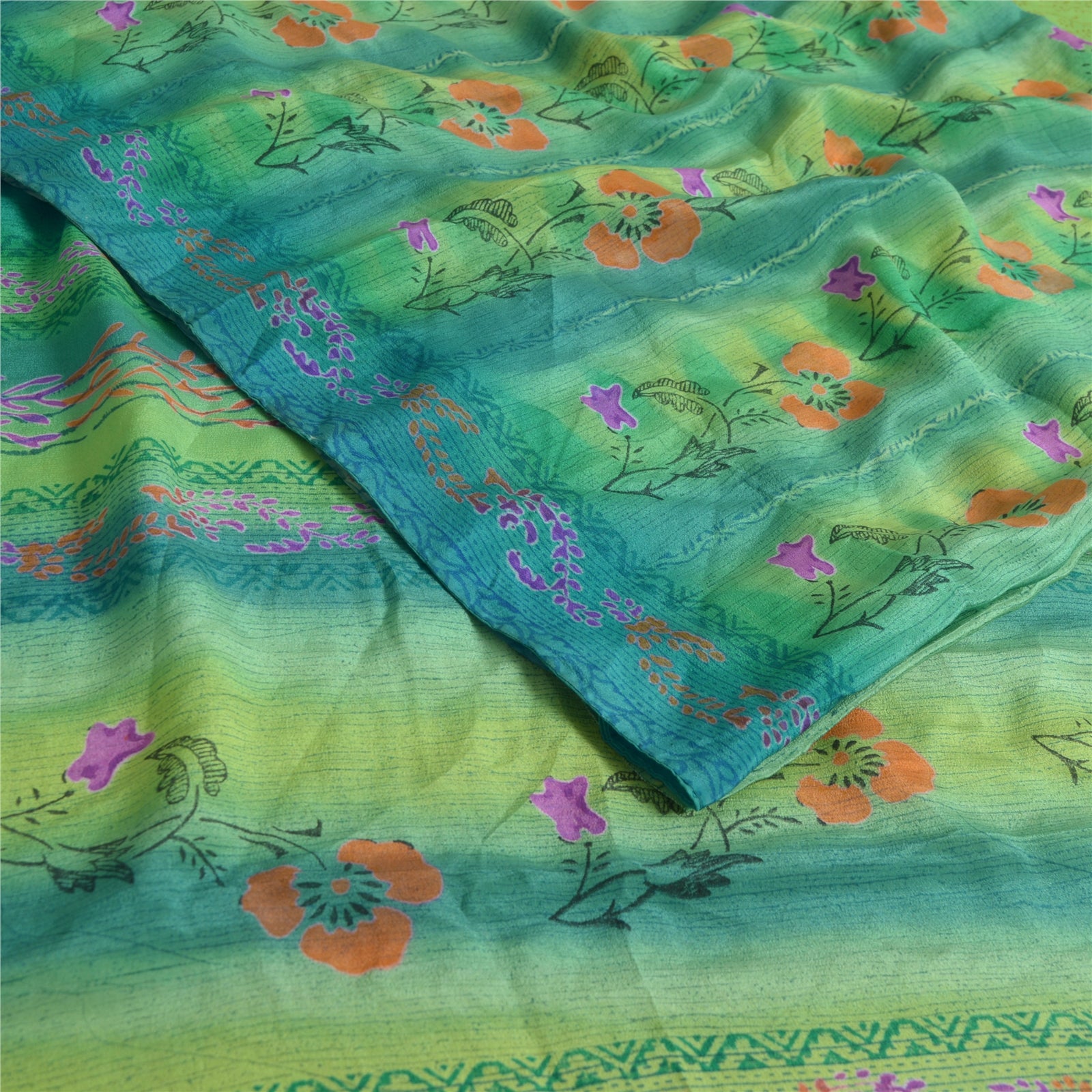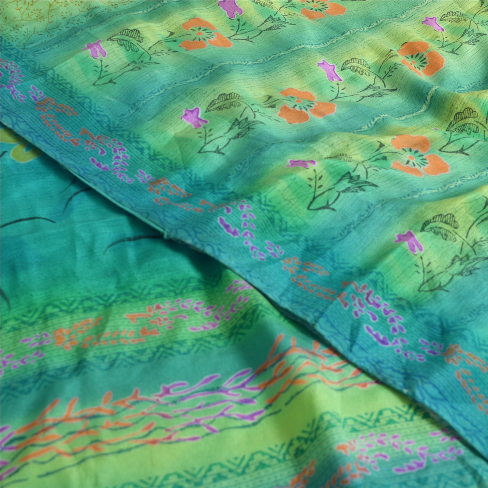 Sanskriti Vintage Sarees Blue/Green Pure Crepe Silk Printed Sari Craft Sustainable Fabric