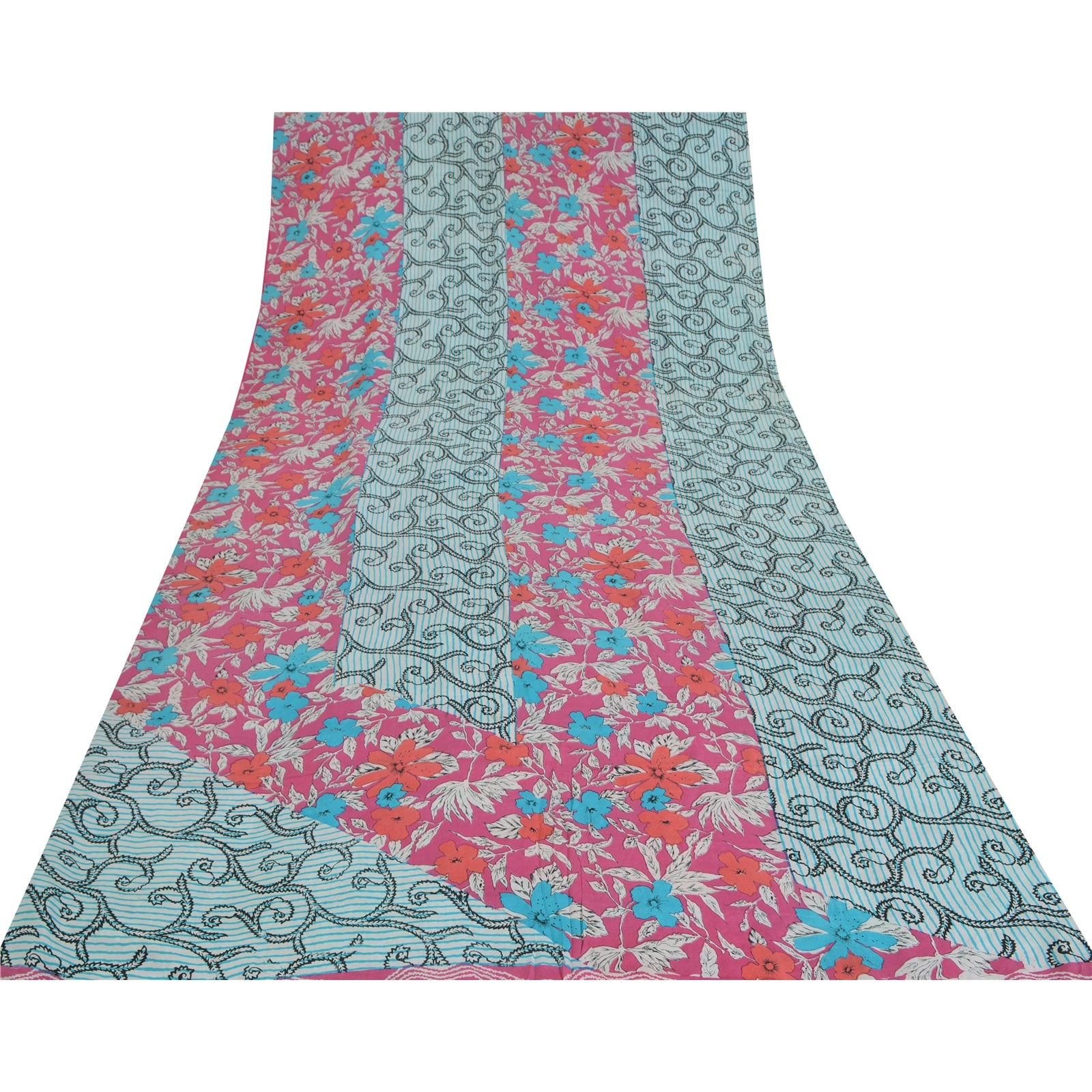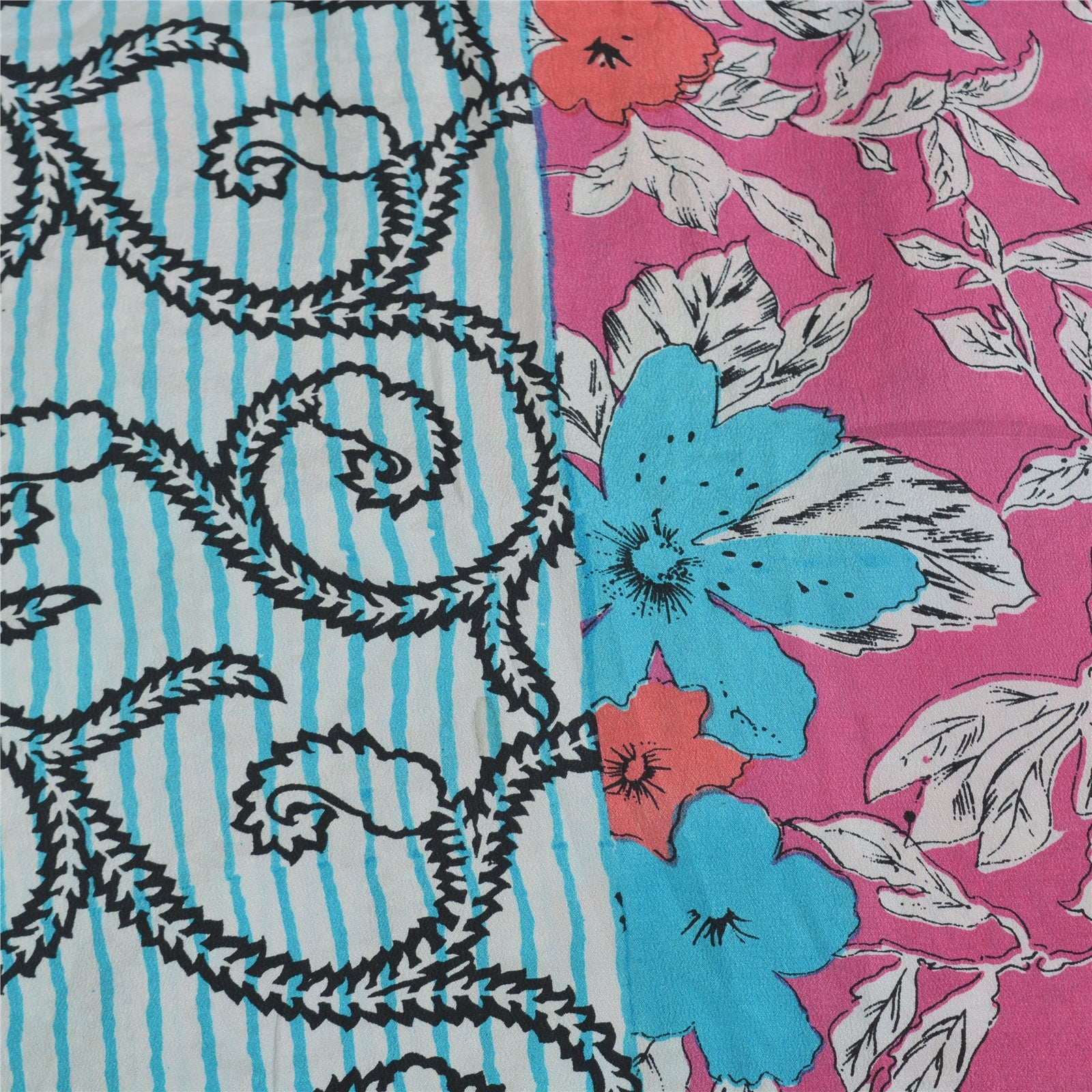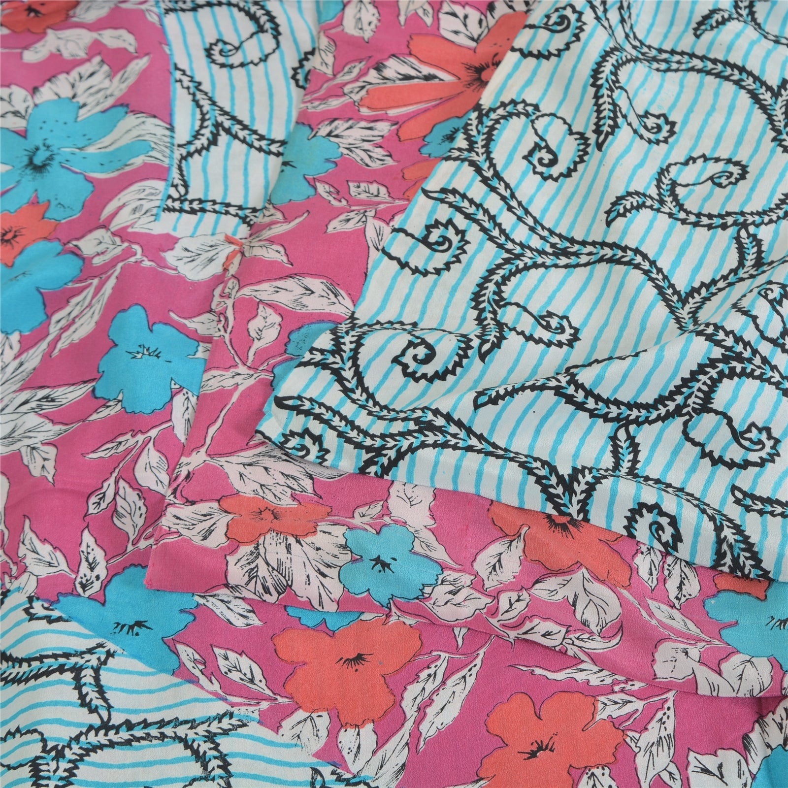 Sanskriti Vintage Sarees Blue/Pink Pure Crepe Silk Printed Sari 5yd Craft Sustainable Fabric