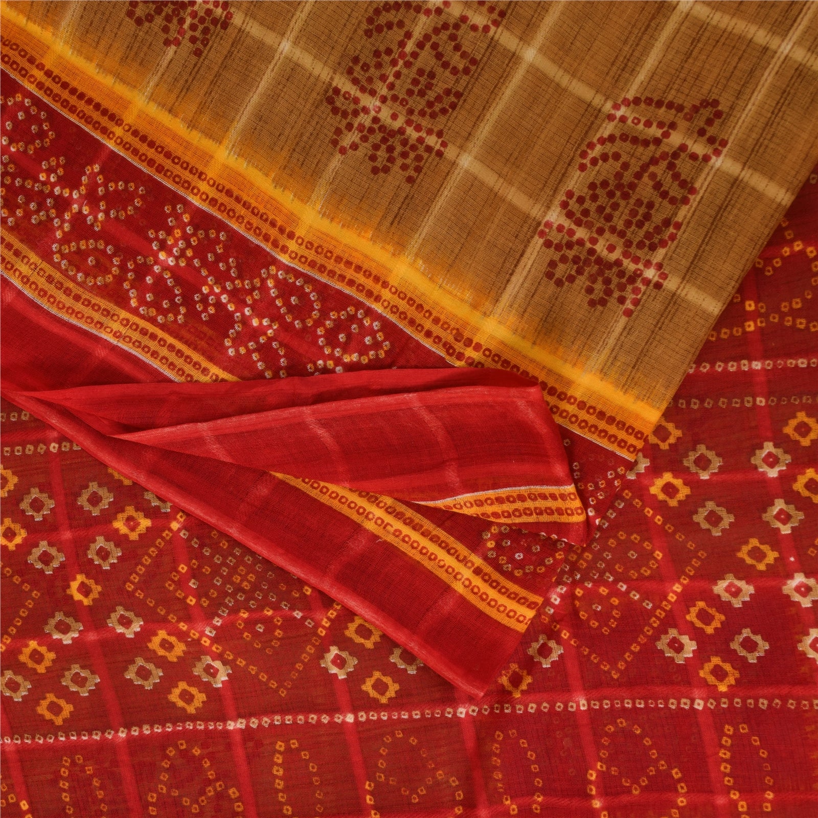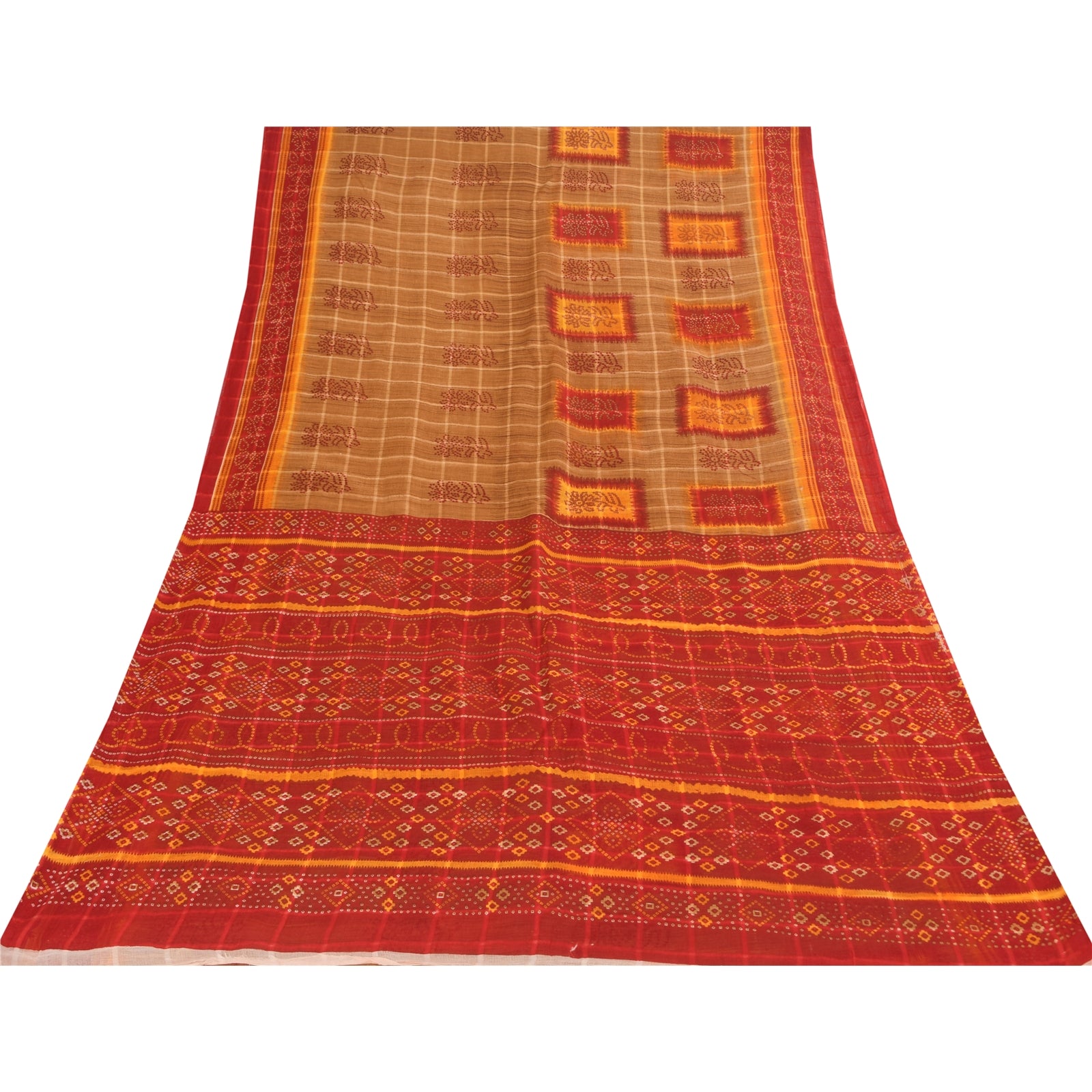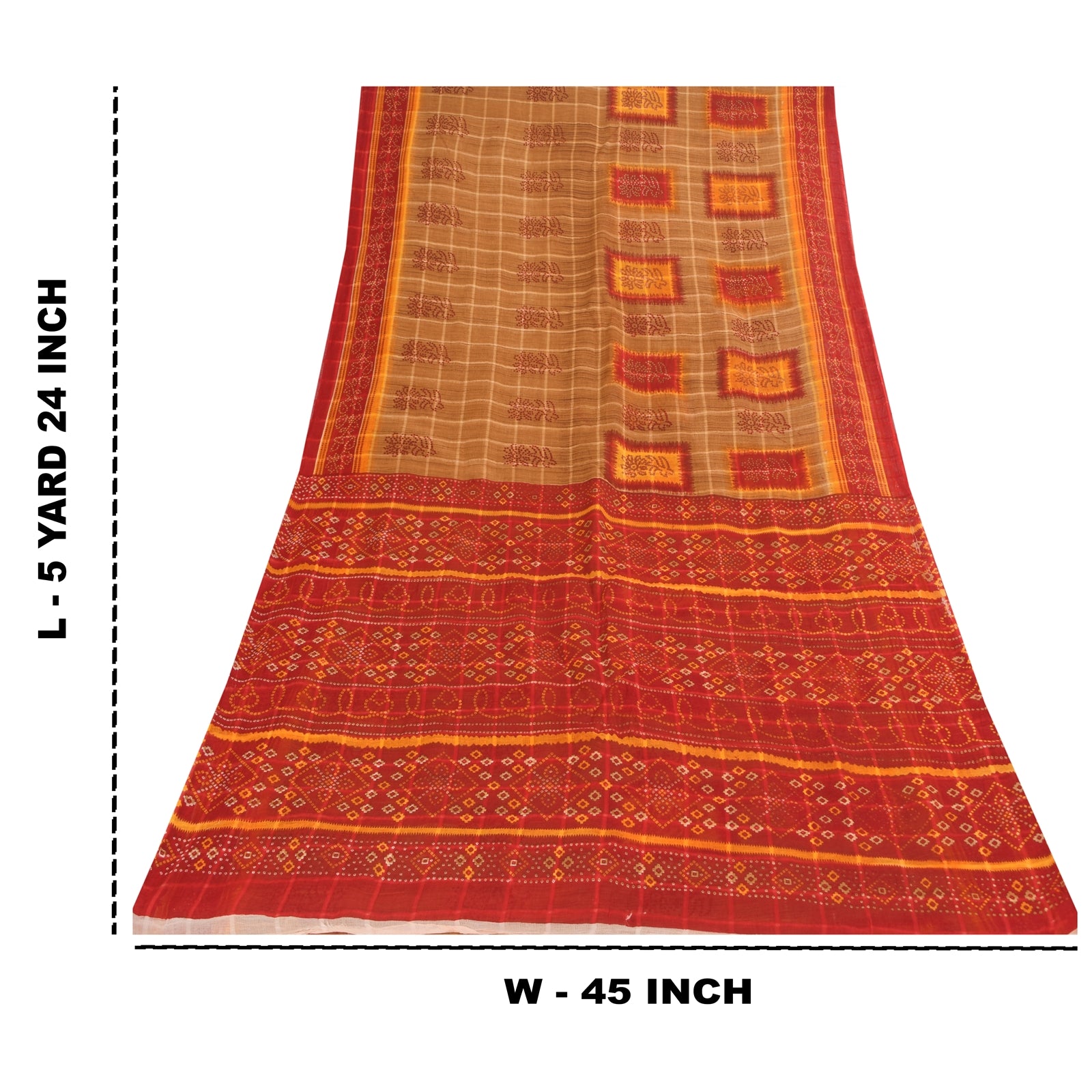 THE ITEM COLOR OR SHADE MAY BE DARKER OR LIGHTER THAN THE PICTURE. Attractive brown & red colored pure cotton bandhani printed sari. Pallu & Border has printed floral design. Similar design in center part of saree.. This unique vintage saree can be used for various crafting ideas even if you don't want to use it as a sari. Design a dress, use it as a as window dressing, upholstery, sarongs, throw, dress making and table linen much more. Let your creative juices flow and use this decorated Sustainable Fabric in multiple fashion. Shipping Note: 'International buyers please note: Import duties, taxes, and charges are not included in the item price or postage cost. These charges are the buyer's responsibility. Please check with your country's customs office to determine what these additional costs will be prior to bidding or buying. Buyer will pay custom duty/tax. It is calculated and charged differently by every country. As a seller I do not have any control over it. VAT or sales tax is calculated by the platform at the time of checkout. Customs charge is payable at the time of delivery.' PCS-6694