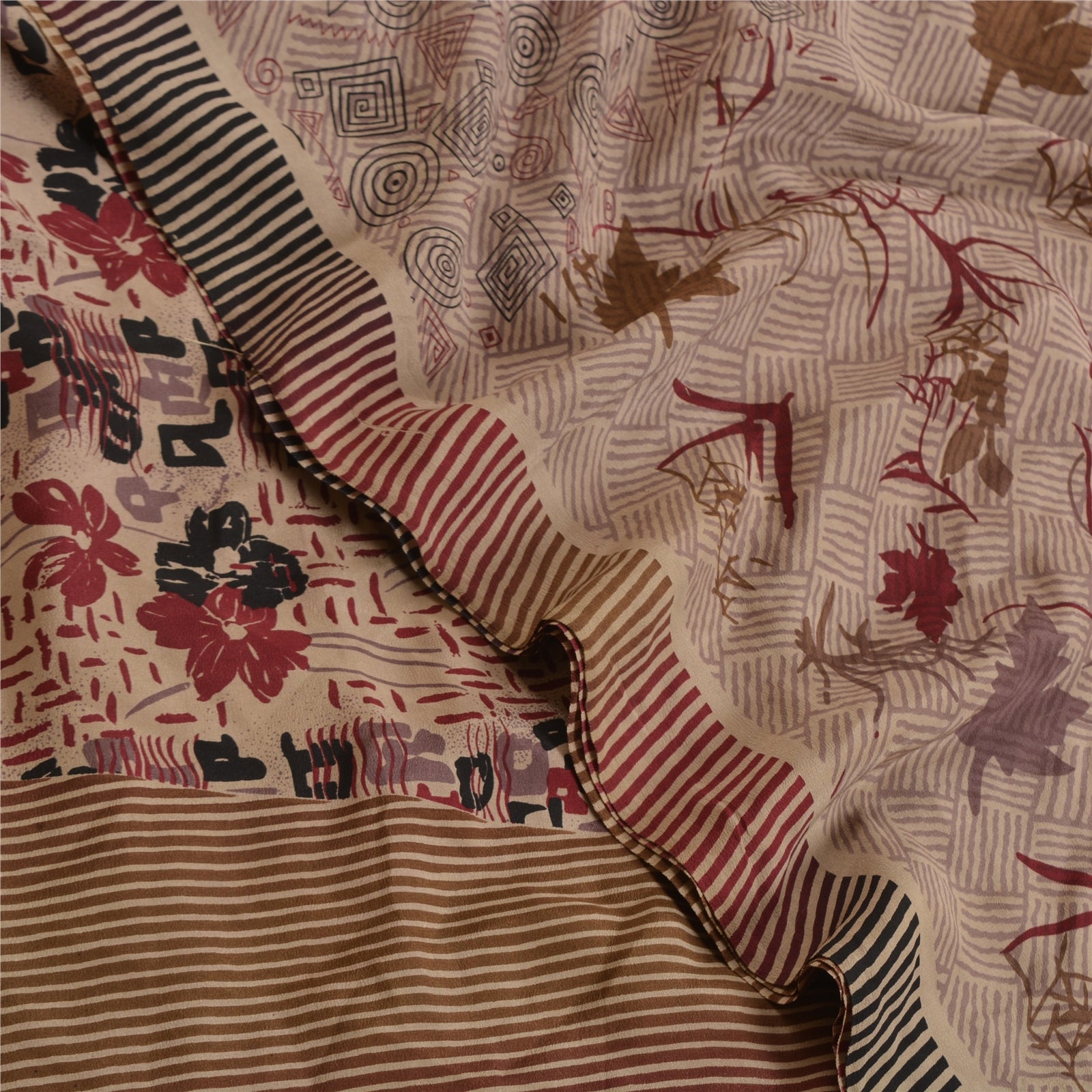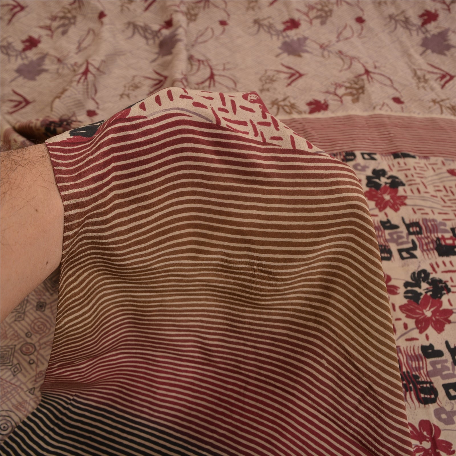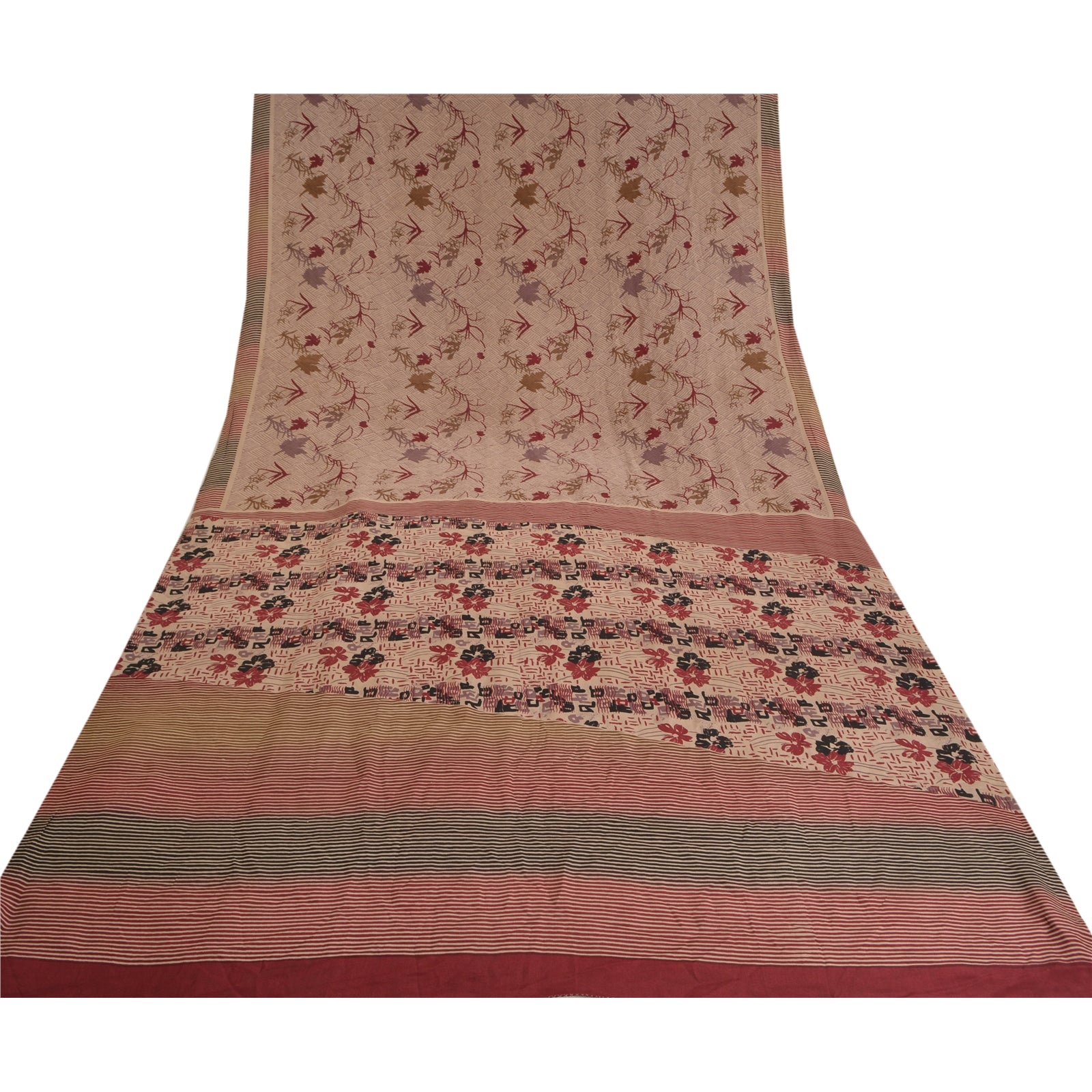 Sanskriti Vintage Sarees Cream Pure Crepe Silk Printed Sari Floral Craft Sustainable Fabric