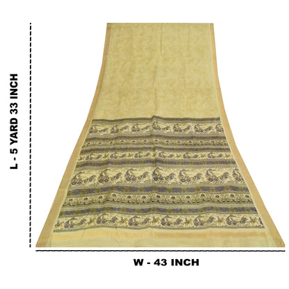 Sanskriti Vintage Sarees Cream Pure Silk Peacock Printed Sari 5+yd Craft Fabric