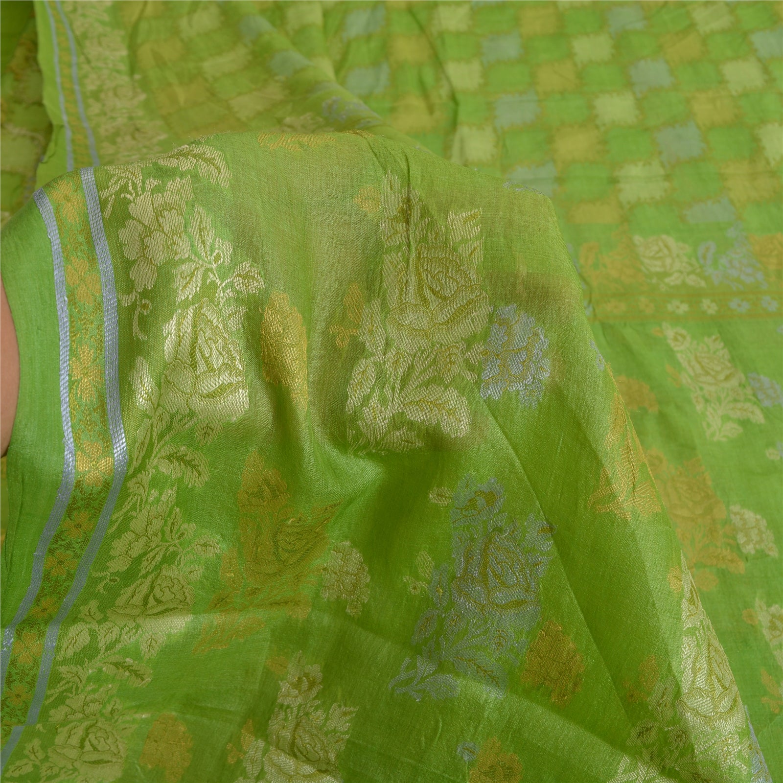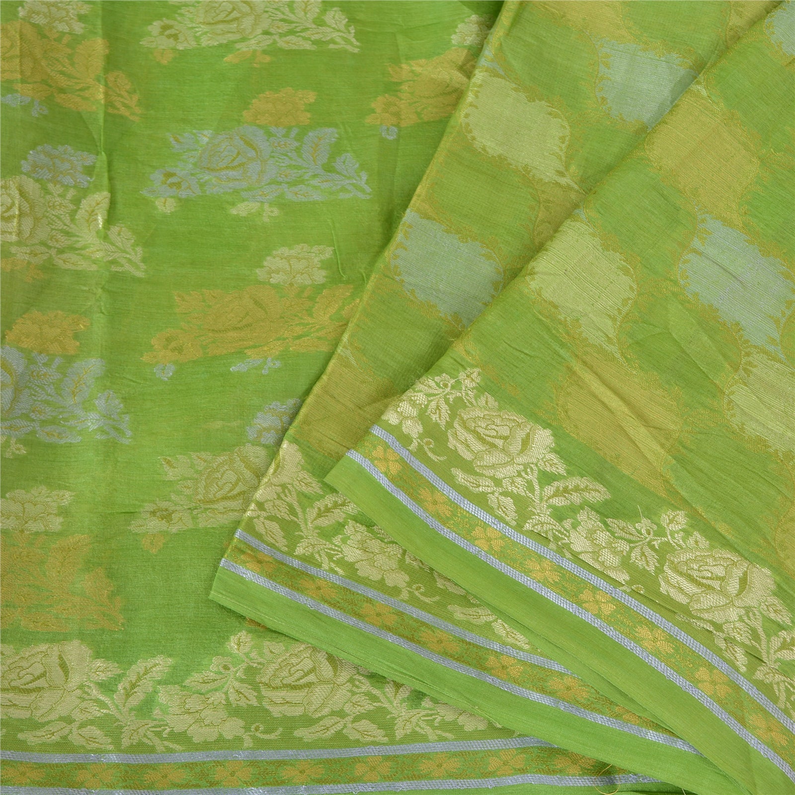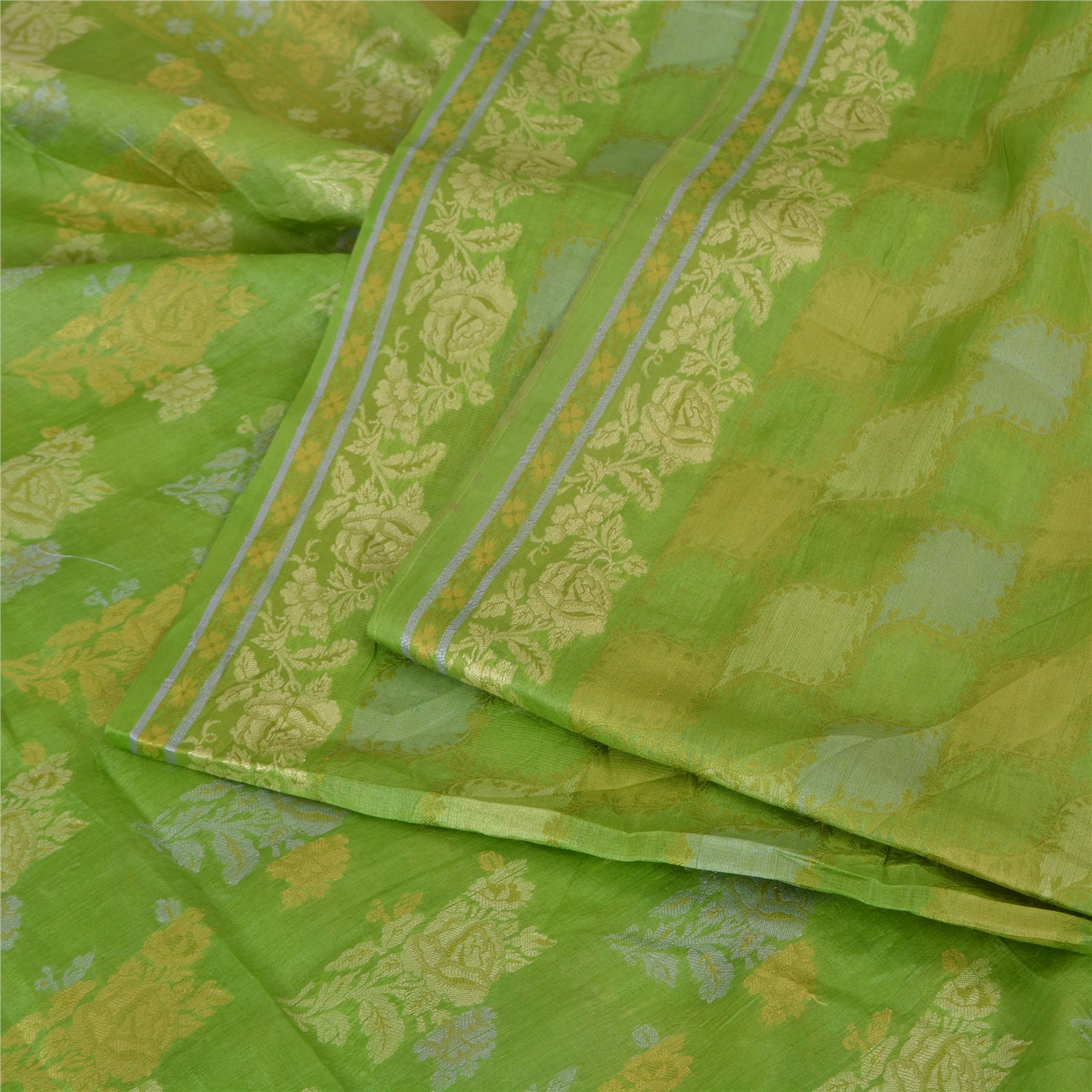 Sanskriti Vintage Sarees Green Hand Woven Pure Silk Sari 5yd Floral Craft Sustainable Fabric