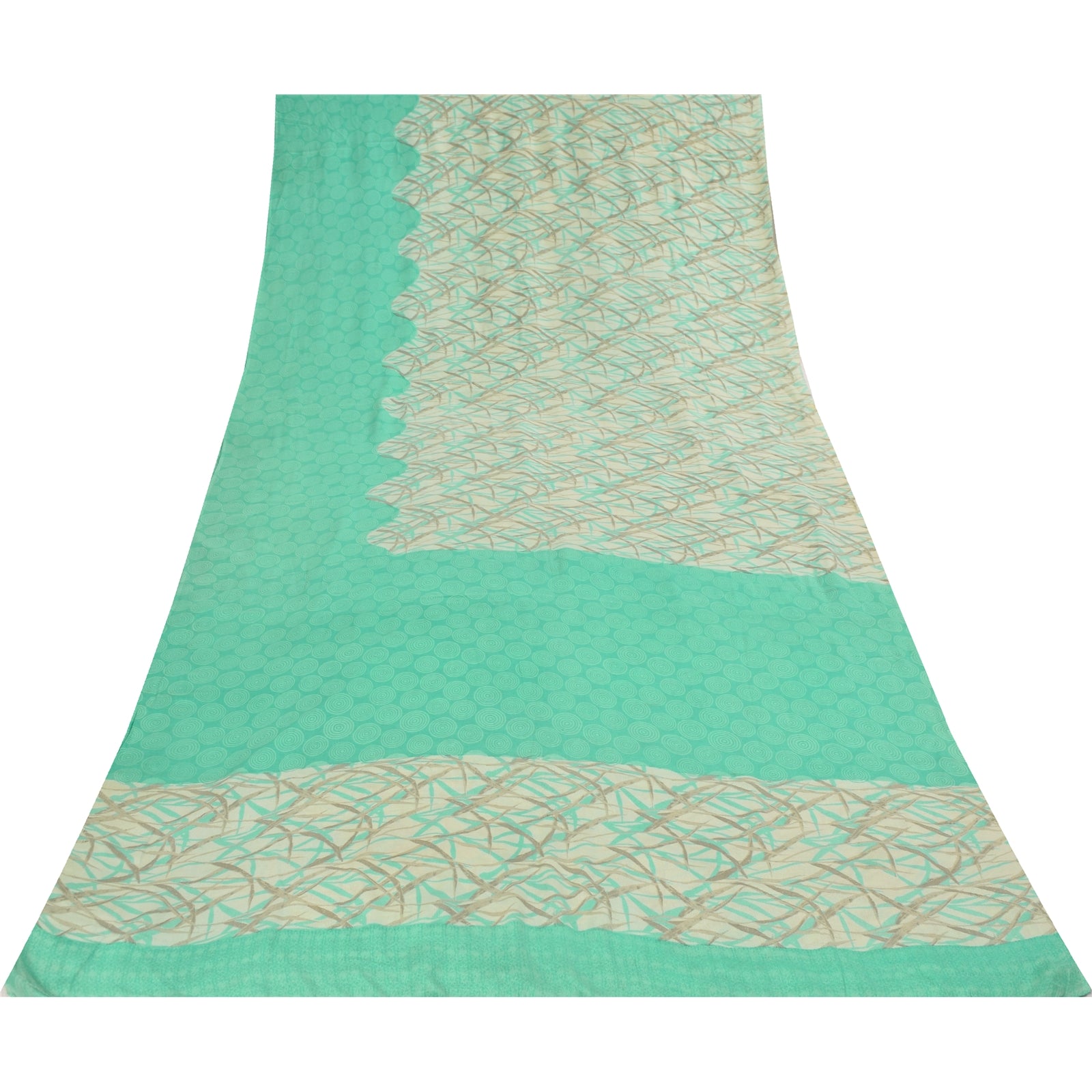 Sanskriti Vintage Sarees Green & Ivory Pure Crepe Printed Sari 5+yd Craft Fabric