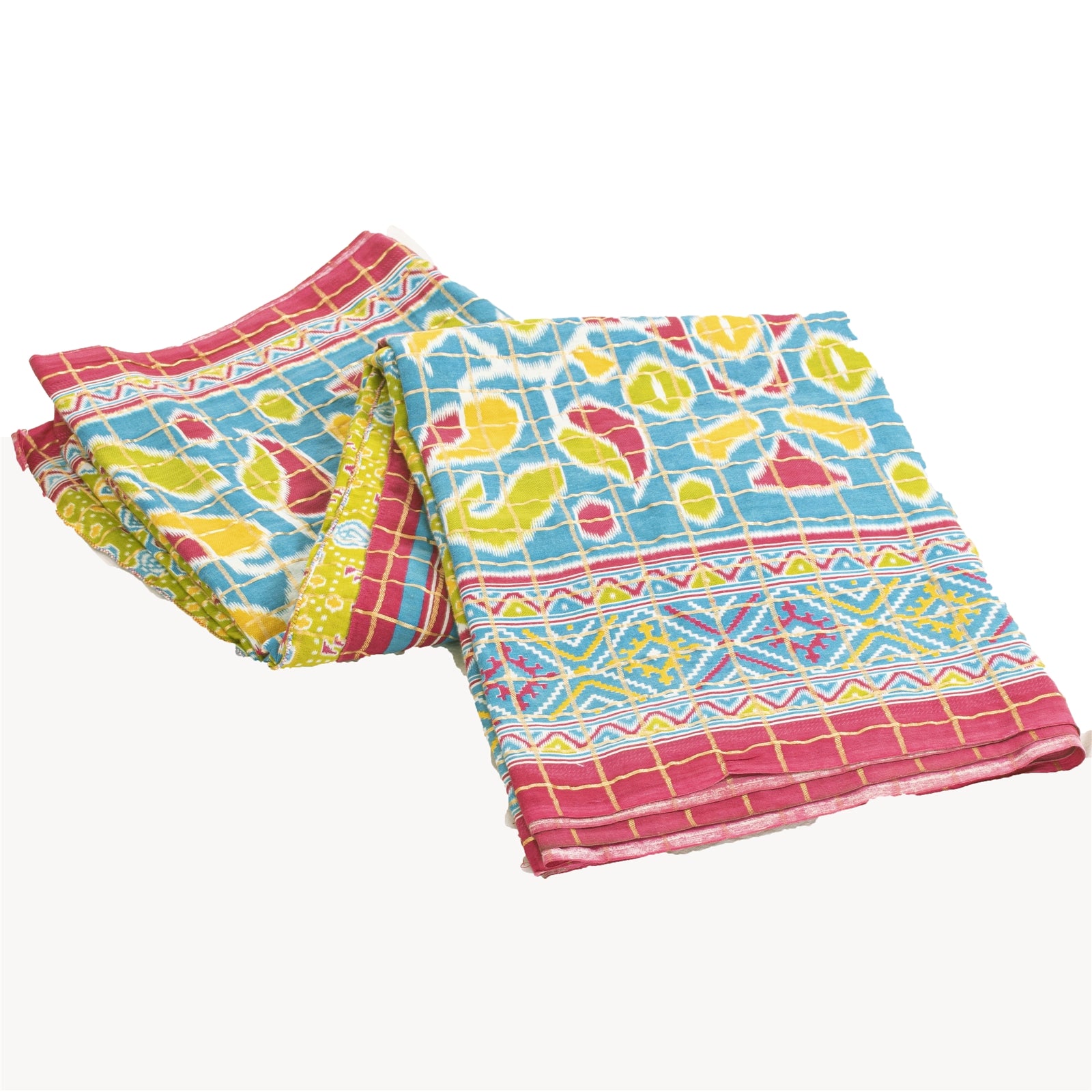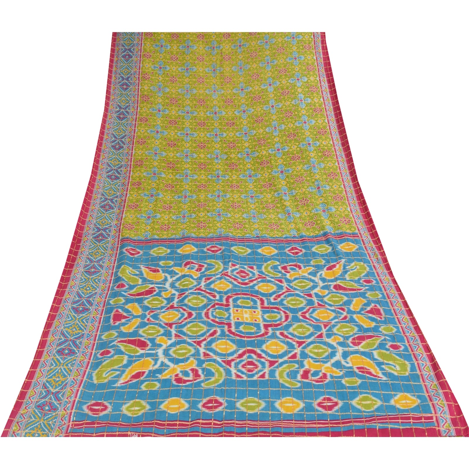 THE ITEM COLOR OR SHADE MAY BE DARKER OR LIGHTER THAN THE PICTURE. Attractive green colored pure cotton patan patola ikat printed & woven sari. Pallu & Border has floral design with ikat pattern. Geometric design in center part of saree.. Also you can see check lines design with golden woven work allover the saree, This unique vintage saree can be used for various crafting ideas even if you don't want to use it as a sari. Design a dress, use it as a as window dressing, upholstery, sarongs, throw, dress making and table linen much more. Let your creative juices flow and use this decorated fabric in multiple fashion. Shipping Note: 'International buyers please note: Import duties, taxes, and charges are not included in the item price or postage cost. These charges are the buyer's responsibility. Please check with your country's customs office to determine what these additional costs will be prior to bidding or buying. Buyer will pay custom duty/tax. It is calculated and charged differently by every country. As a seller I do not have any control over it. VAT or sales tax is calculated by the platform at the time of checkout. Customs charge is payable at the time of delivery.' PCS-6275