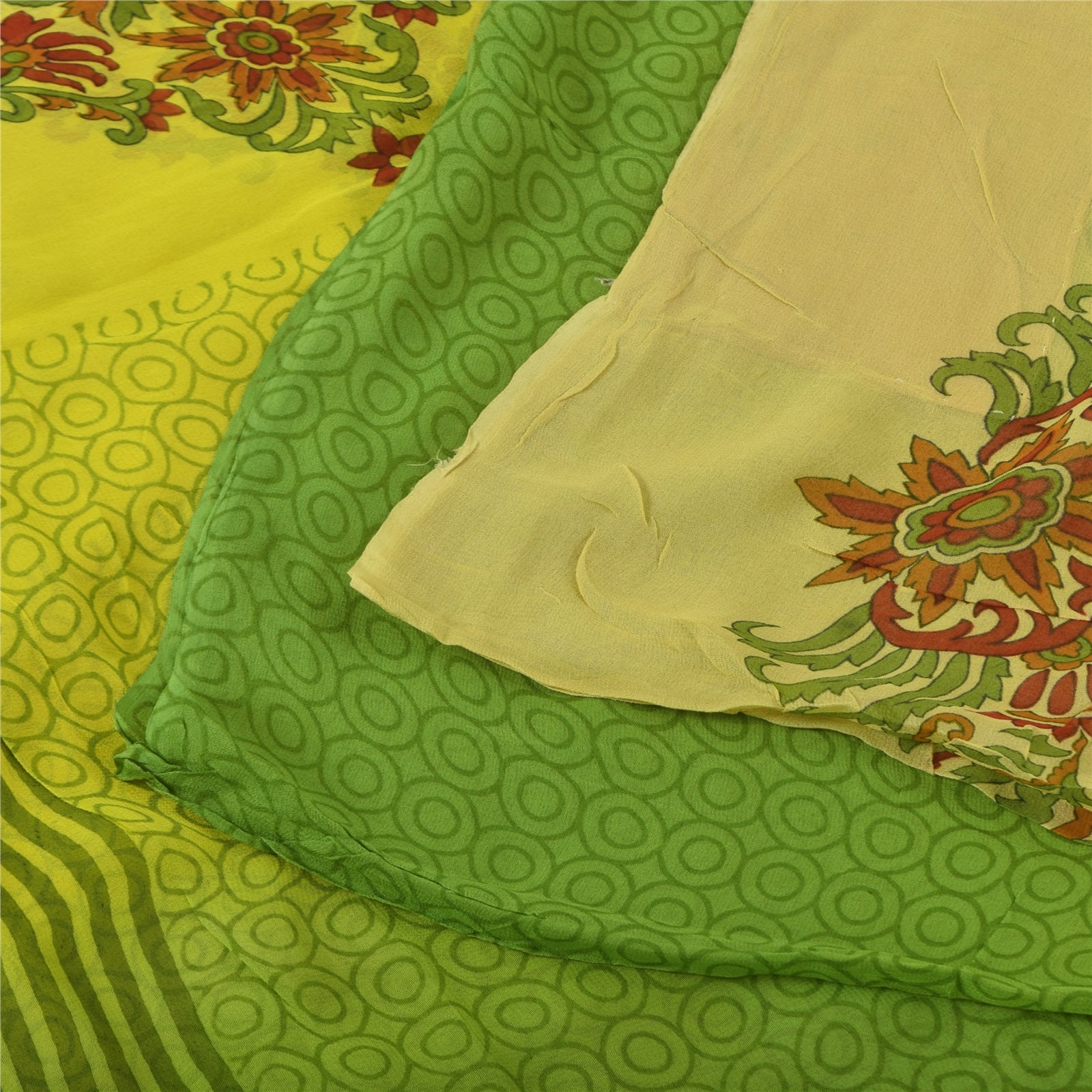 Sanskriti Vintage Sarees Green/Yellow Pure Georgette Printed Sari 5+yd Sustainable Fabric