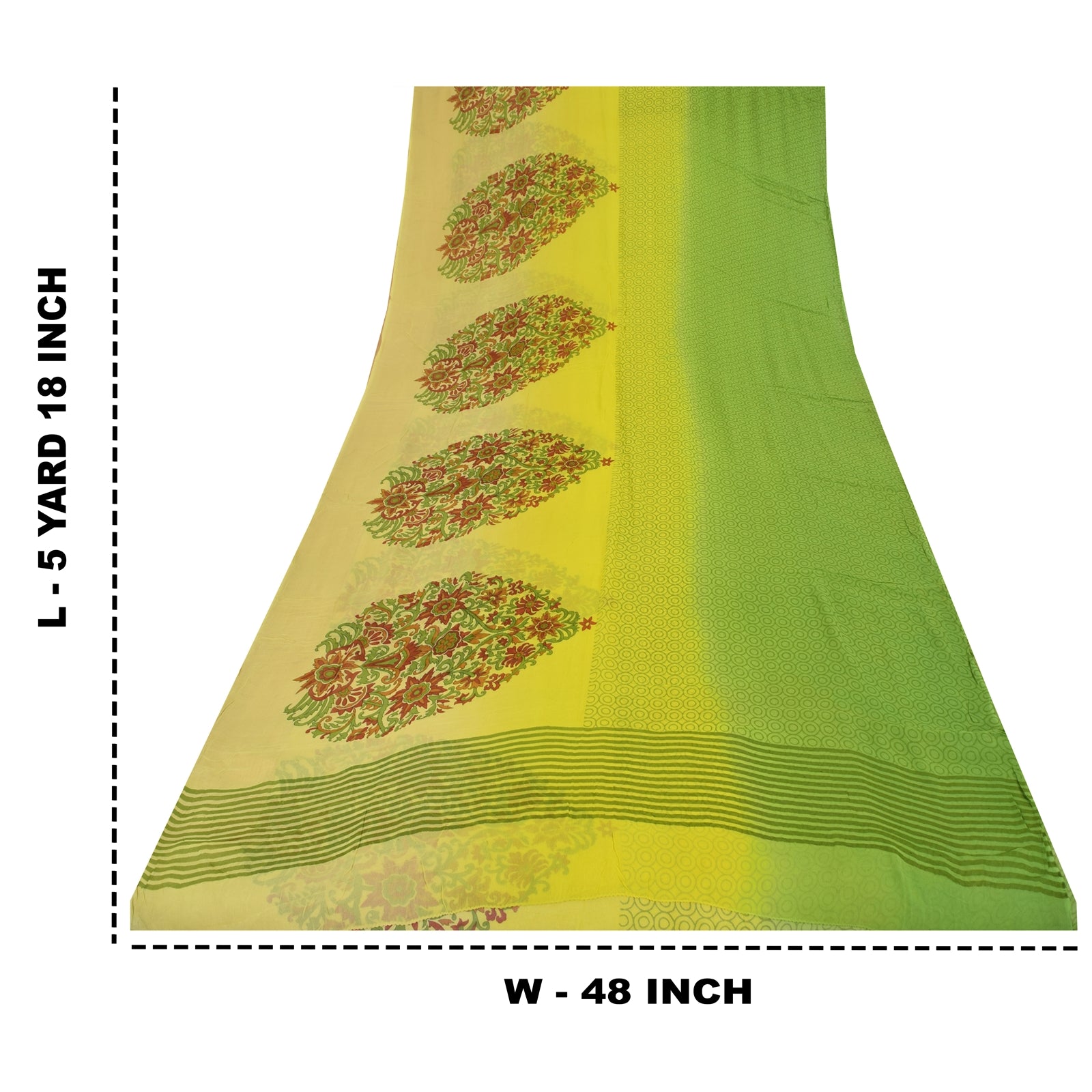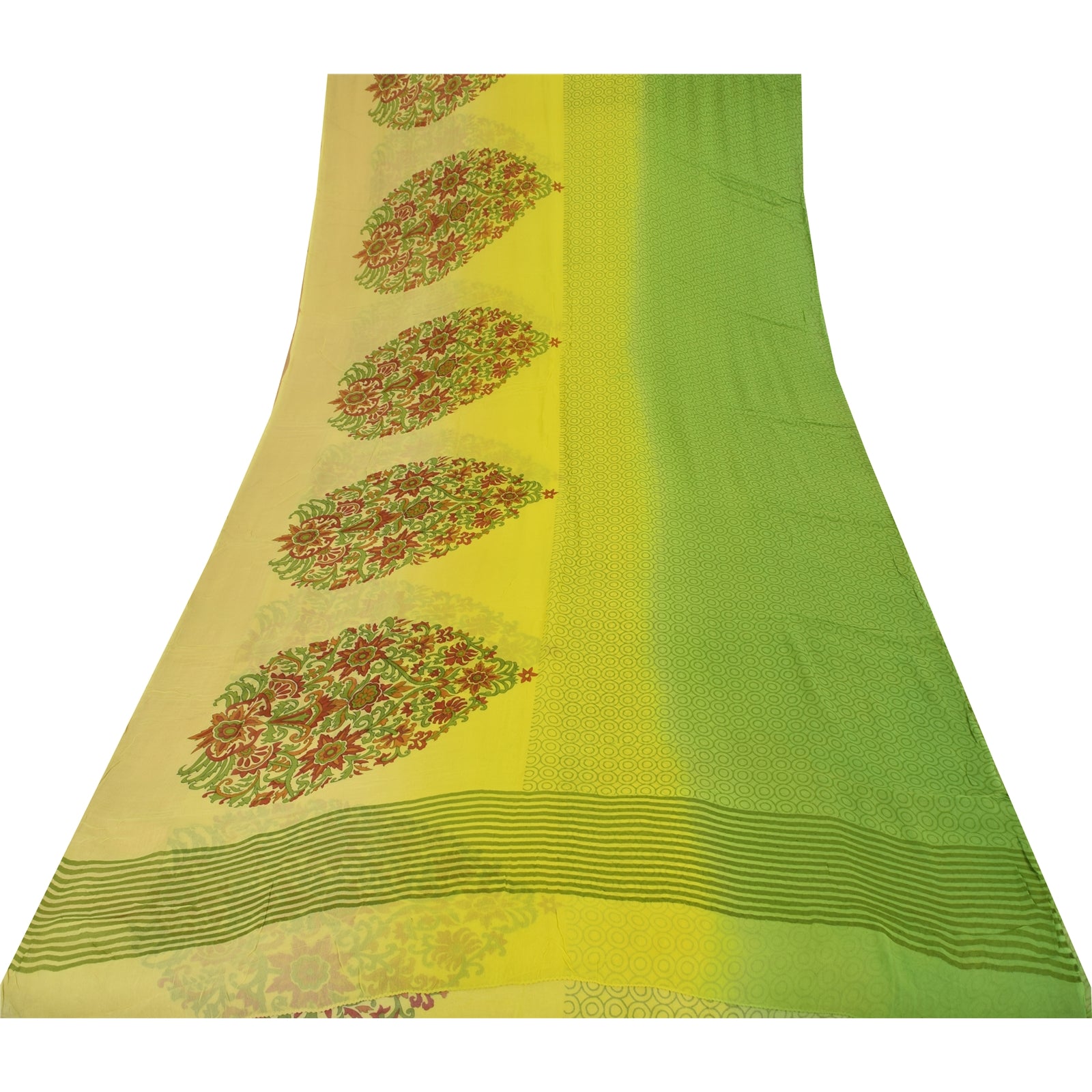 THE ITEM COLOR OR SHADE MAY BE DARKER OR LIGHTER THAN THE PICTURE.' Beautiful green & yellow colored pure georgette silk printed saree. Border has printed floral design. Circle design in center part of saree. What is special about this saree? Brilliant design on soft Sustainable Fabric is really enhancing the beauty of the saree. This unique vintage saree can be used for various crafting ideas even if you don't want to use it as a sari. Design a dress, use it as a as window dressing, upholstery, sarongs, throw, dress making and table linen much more. Let your creative juices flow and use this decorated Sustainable Fabric in multiple fashion. International buyers please note: Import duties, taxes, and charges are not included in the item price or postage cost. These charges are the buyer's responsibility. Please check with your country's customs office to determine what these additional costs will be prior to bidding or buying.Buyer will pay custom duty/tax. It is calculated and charged differently by every country. As a seller I do not have any control over it. VAT or sales tax is calculated by the platform at the time of checkout. Customs charge is payable at the time of delivery. PRG-14363